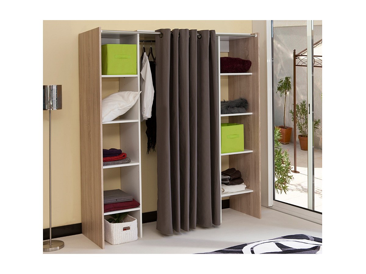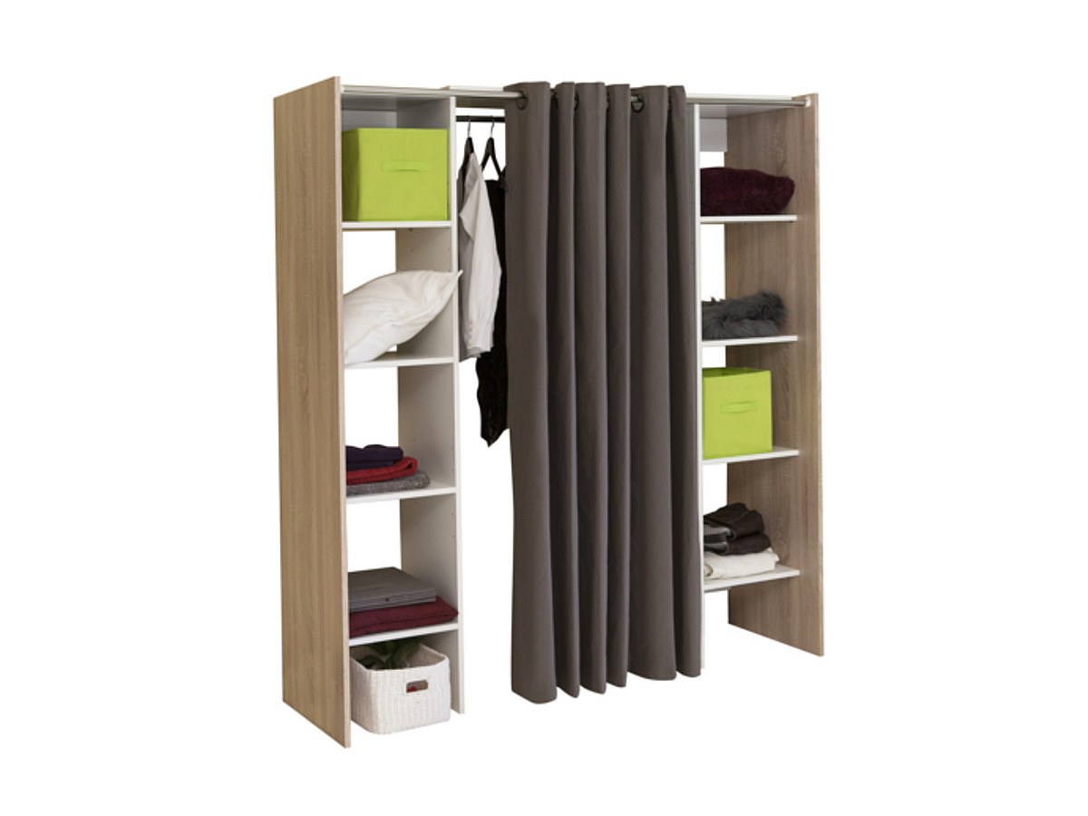 De twee kolommen samengesteld uit talrijke legplanken zijn ideaal om uw kleding, schoenen of nog dozen op te bergen. Wat betreft de jasjes, kleedjes en kostuums, zij zullen een plaatsje vinden in de grote centrale hangkast. Het taupekleurig of antraciet gordijn zorgt voor de final tocu van deze bijzonder praktische en stijlvolle dressing.