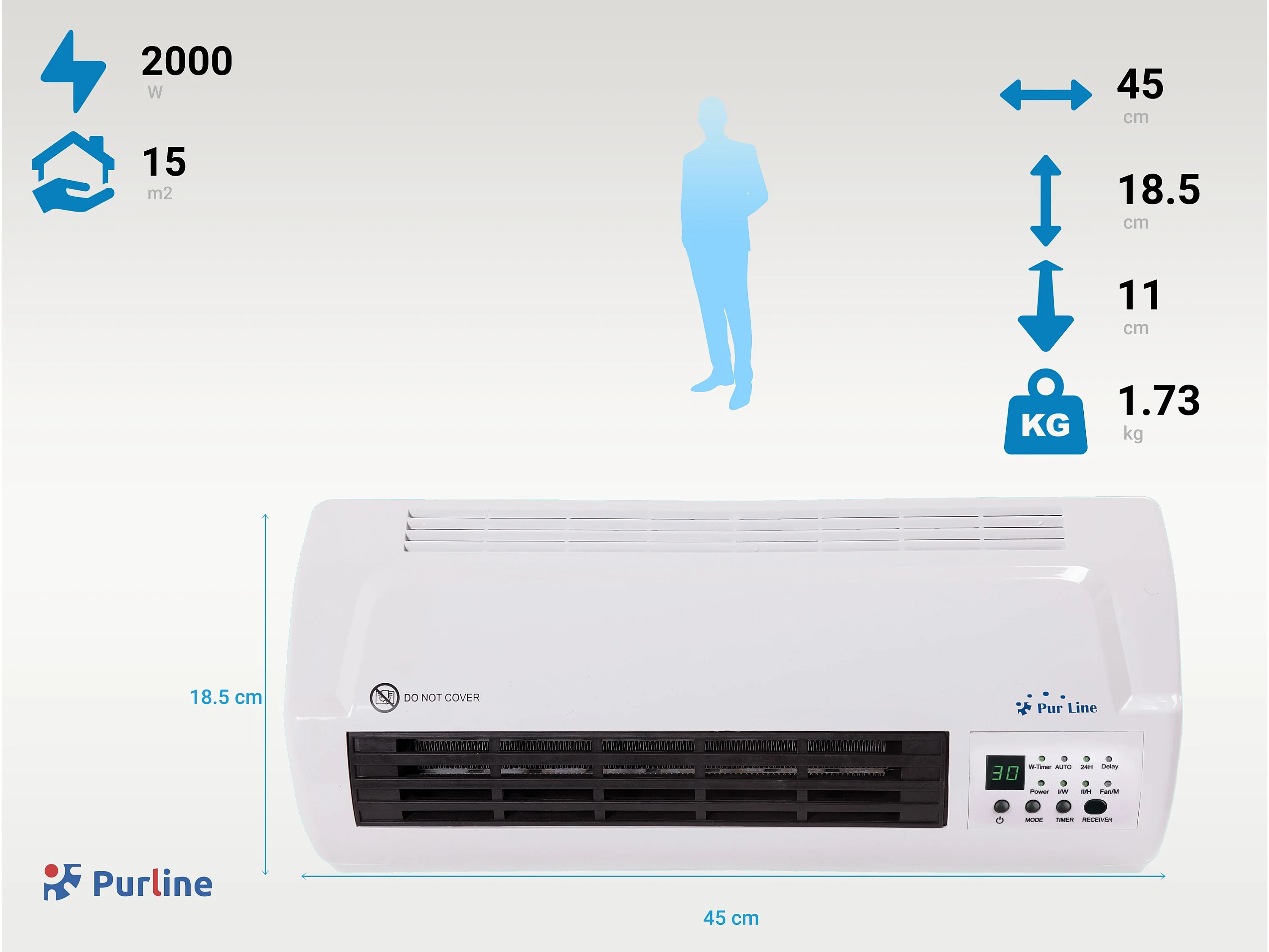 Keramische splitverwarmer 2000 W, wandmontage, wit, afstandsbediening, timer, 3 bedrijfsmodi