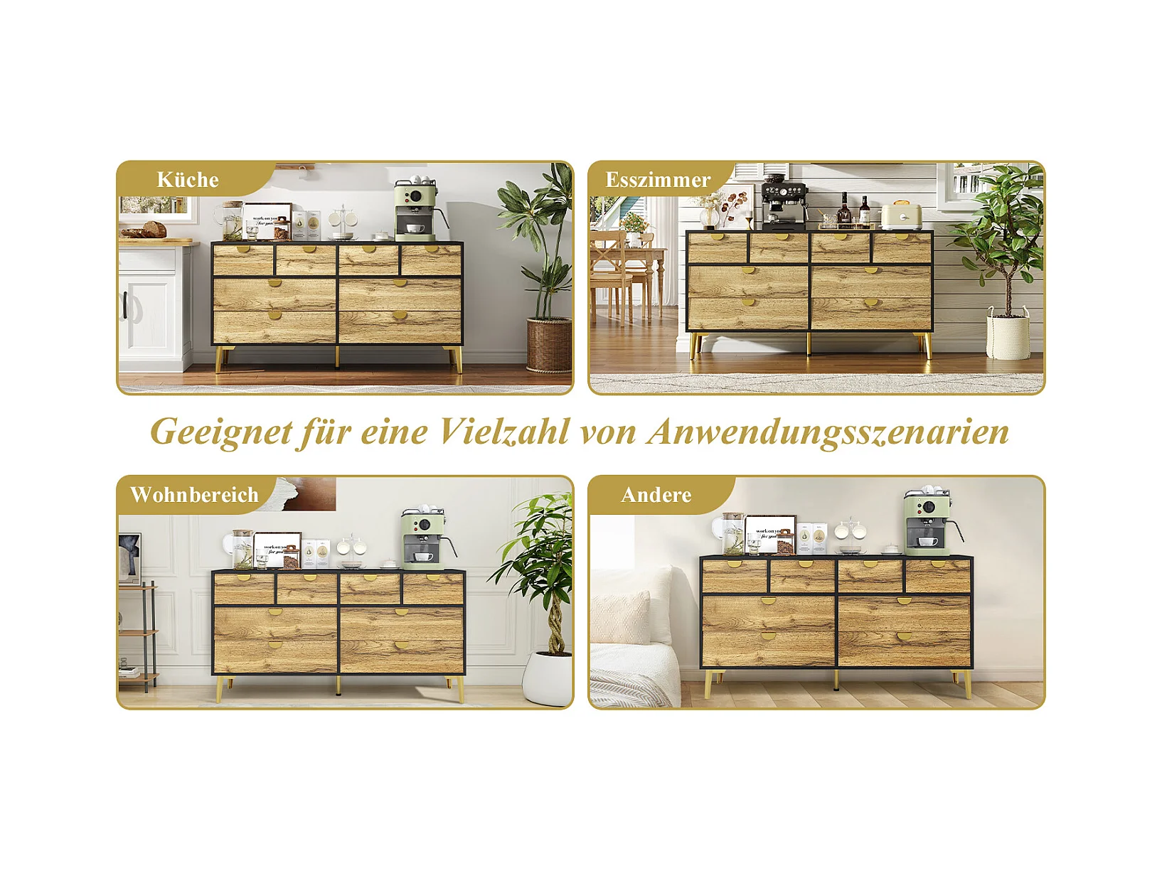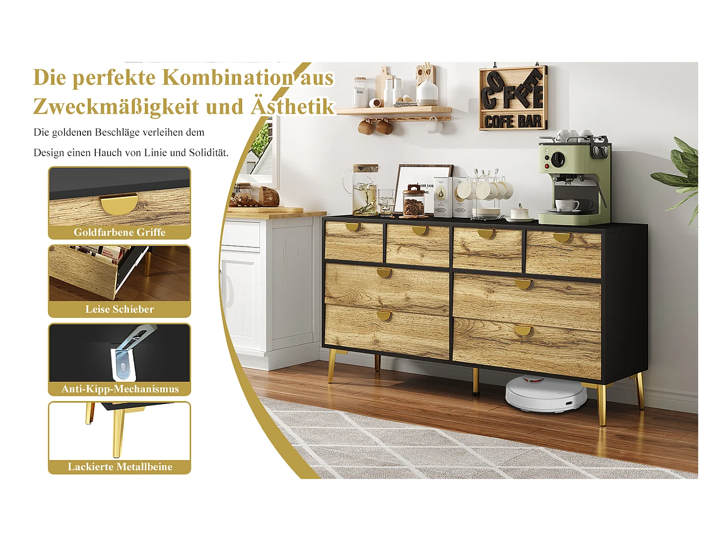 Keuken dressoir met 8 lades - 150 x 40 x 78 cm - Gouden metalen handgreep en poten - Zwart en naturel