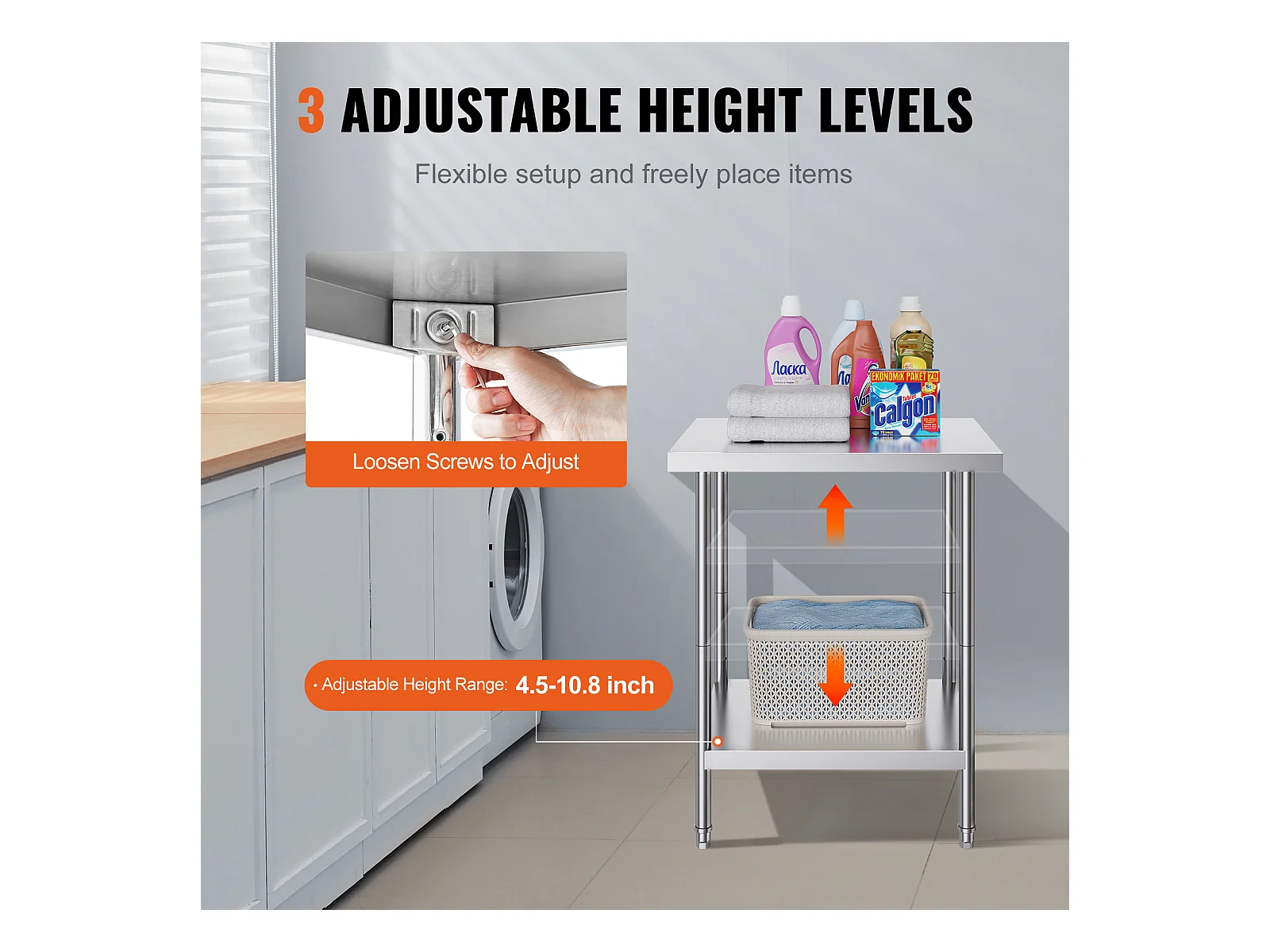 Werktafel voor Keuken SucceBuy, Werktafel in RVS, 60.96 x 30.48 cm, 4 Rollen, 3 Instelbare Hoogteniveaus