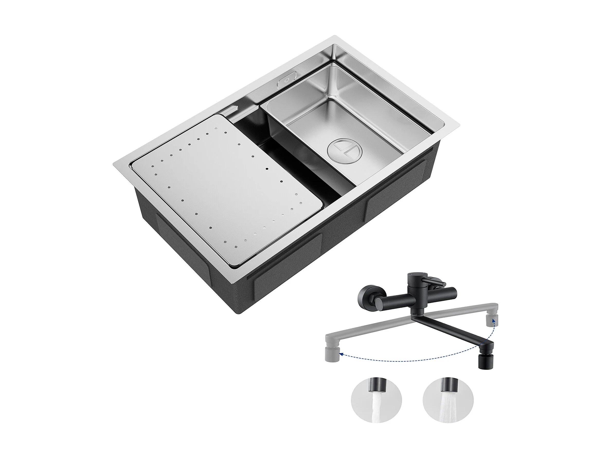 Cecipa max 1 wastafel 70×44cm Geborsteld roestvrij staal Ingebouwde spoelbak met afdruiprek en wastafel + mengkraan met uittrekbare spray, 3 waterafvoermodi