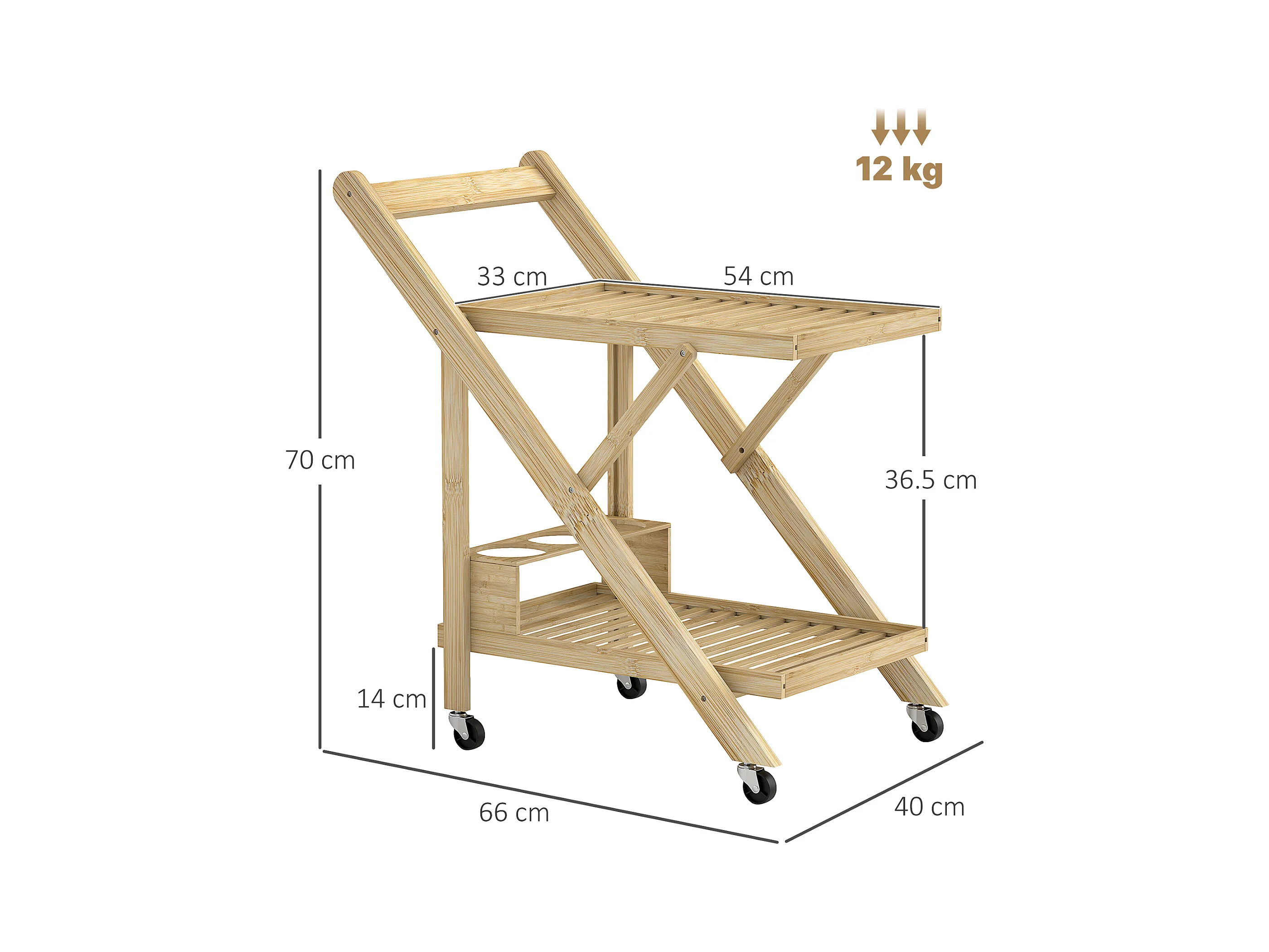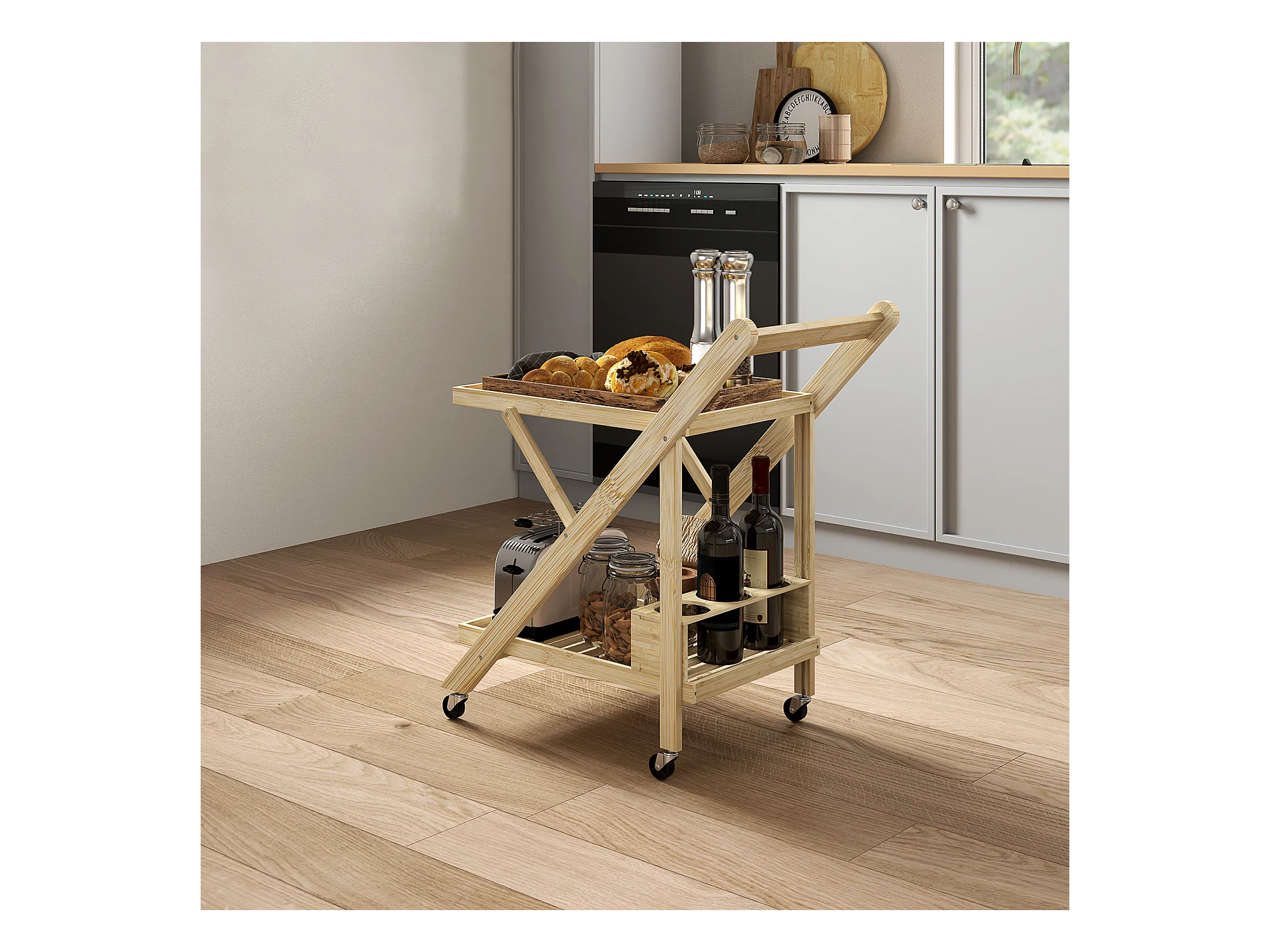 Keukentrolley met flessenrek, werkblad, natuurlijk bamboe (66x40x70cm)