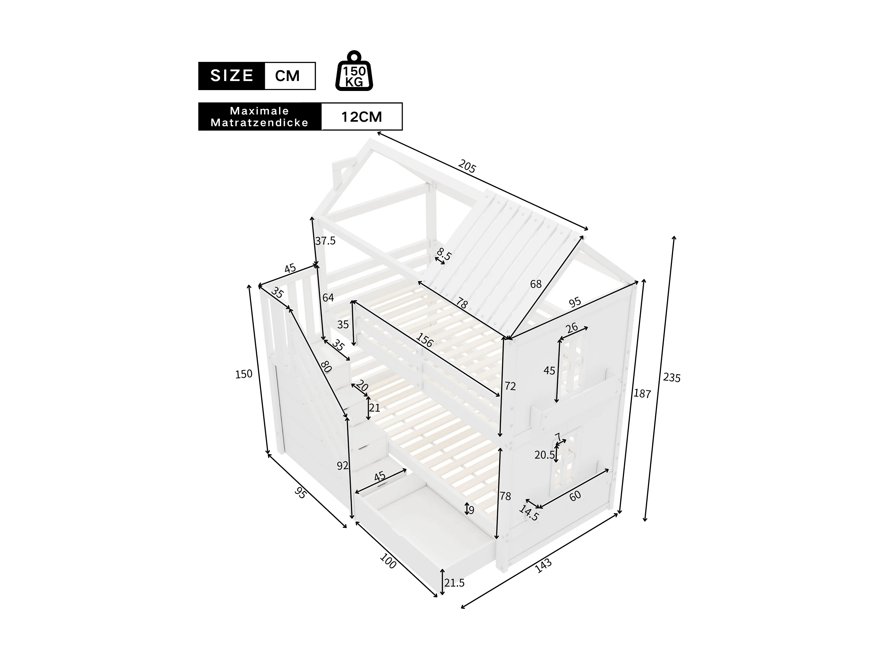 Kinder stapelbed 90x200 cm van massief grenenhout en MDF, wit, met opbergetrap, lades en planken