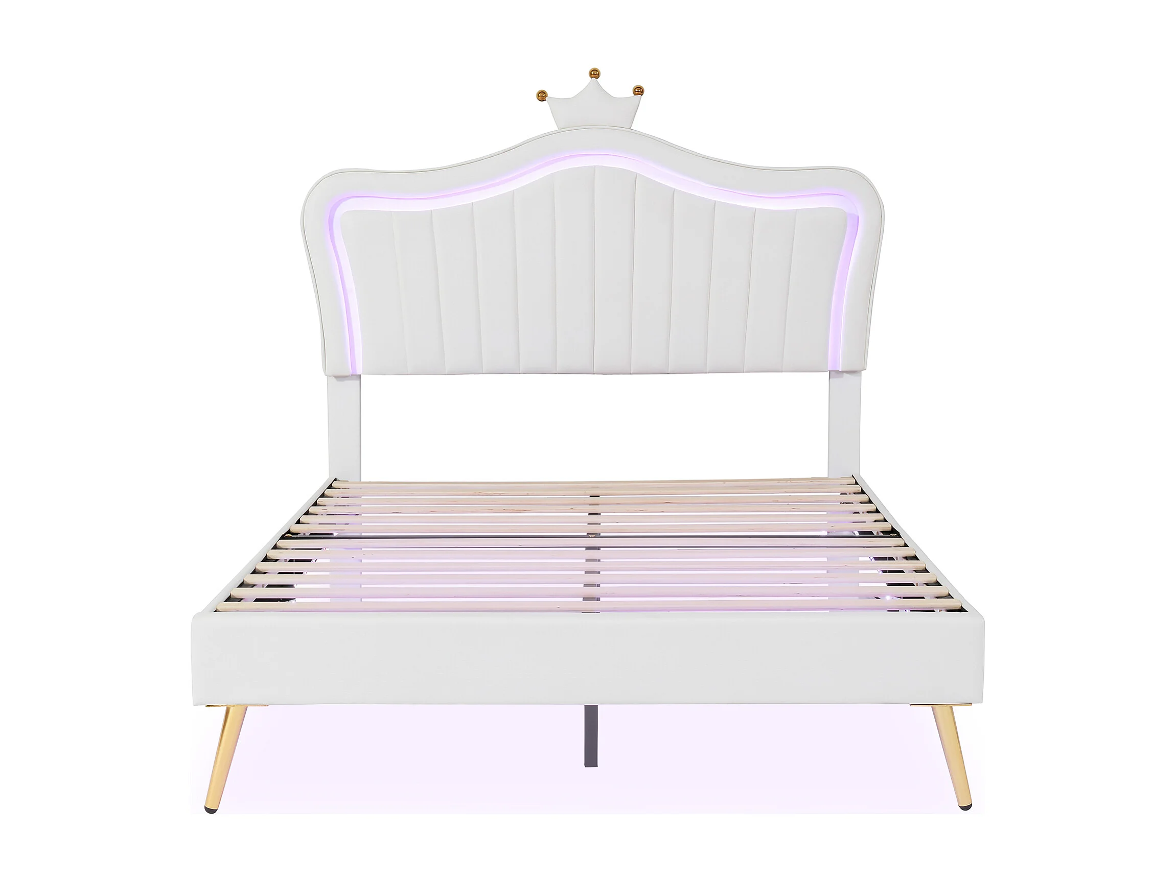 Kinderbed 203x152x122 cm met ledverlichting. Gestoffeerd hoofdbord in kroonvorm, wit, voor kinderen en tieners.
