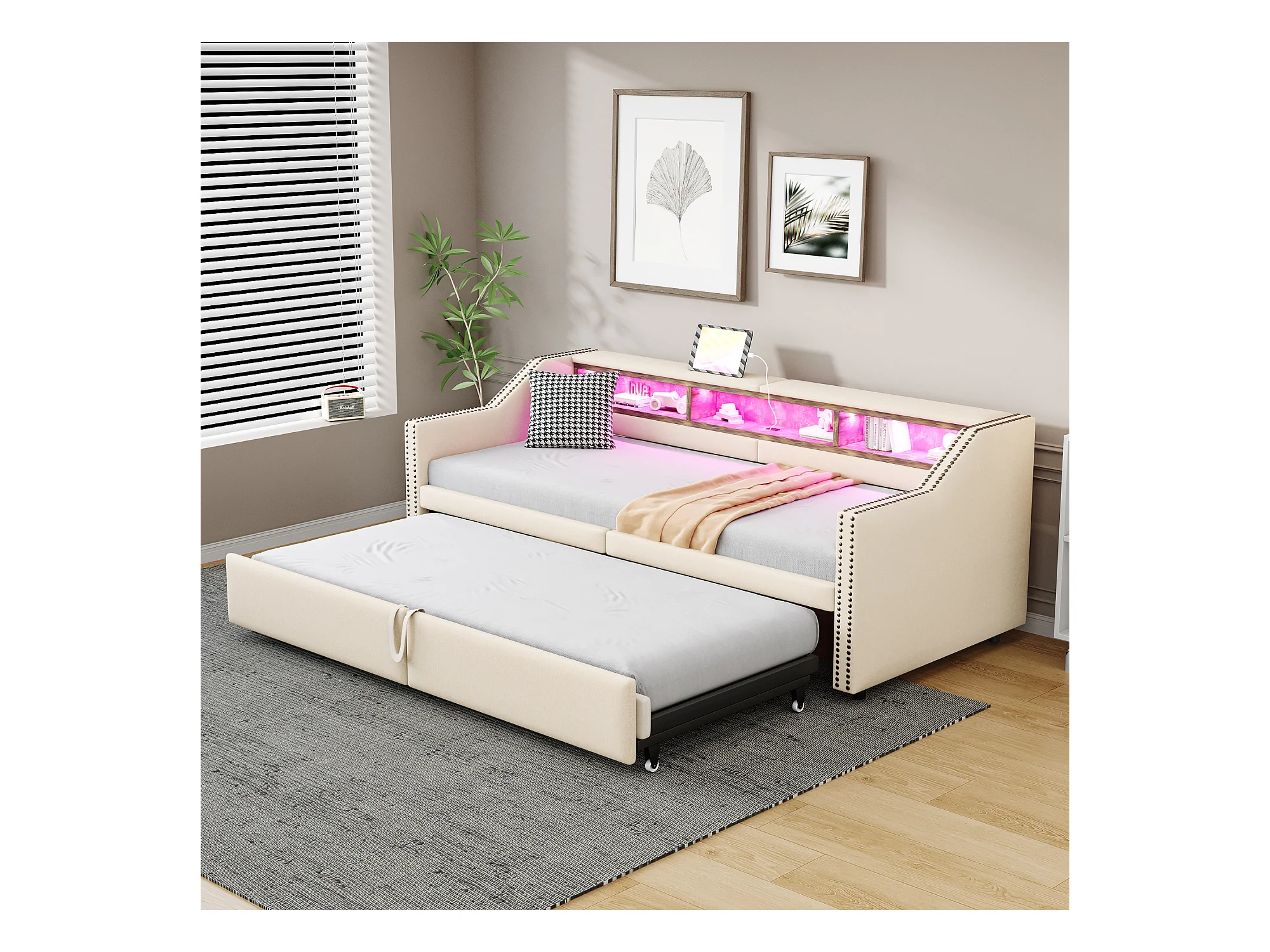 Kinderslaapbank 90x200cm beige linnen met uitschuifbed 90x190cm, LED en USB, lattenbodem, zonder matras