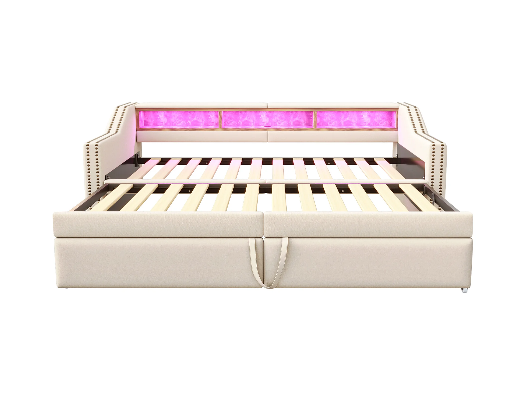 Uitschuifbed 90x200 cm, beige linnen stof, slaapbank met USB-aansluitingen en led-verlichting, zonder matras