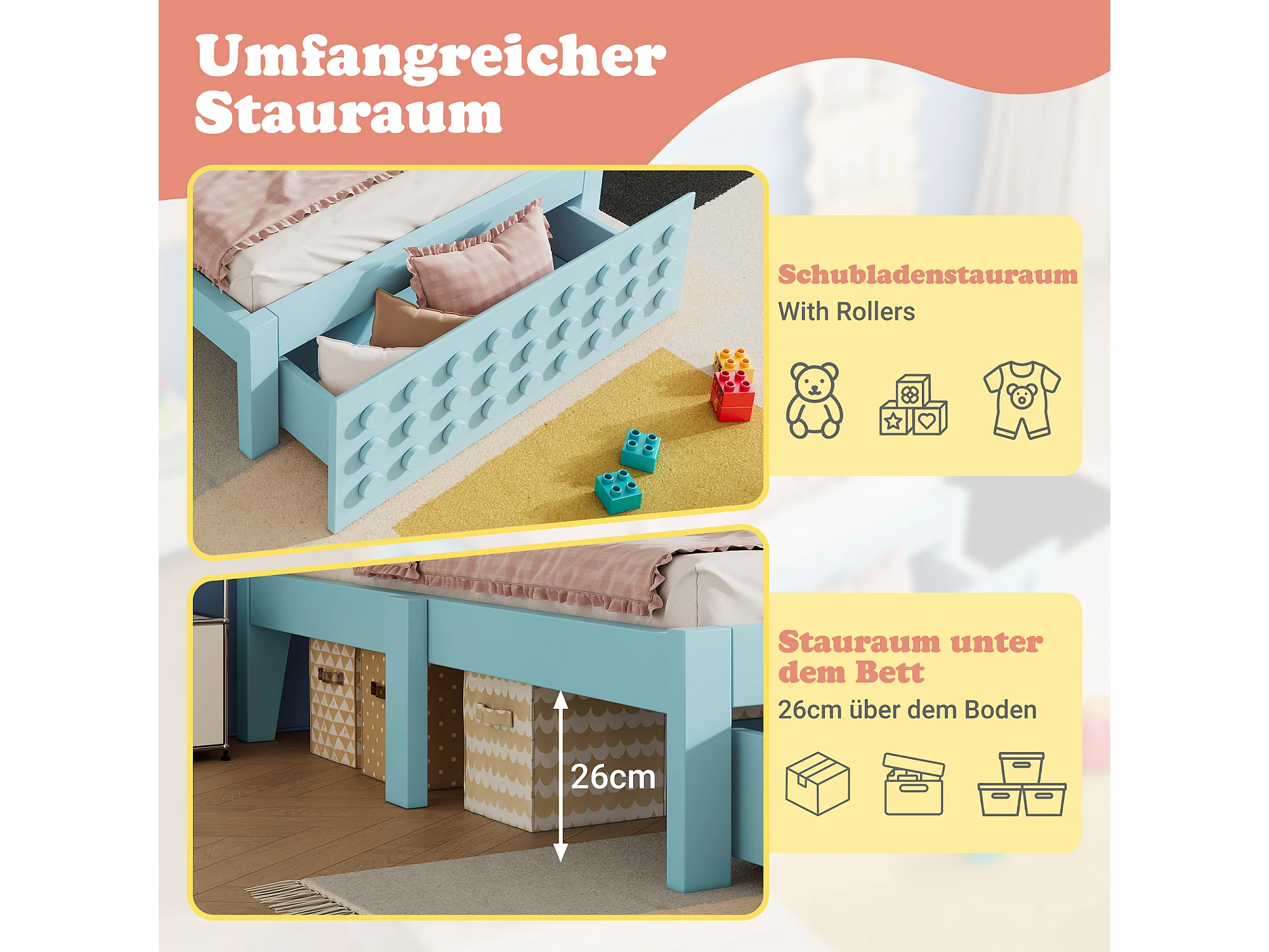 Kinderbed 90x200 cm, massief houten constructie, lattenbodem, lades en opbergruimte onder het bed, zonder matras (90x200 cm)