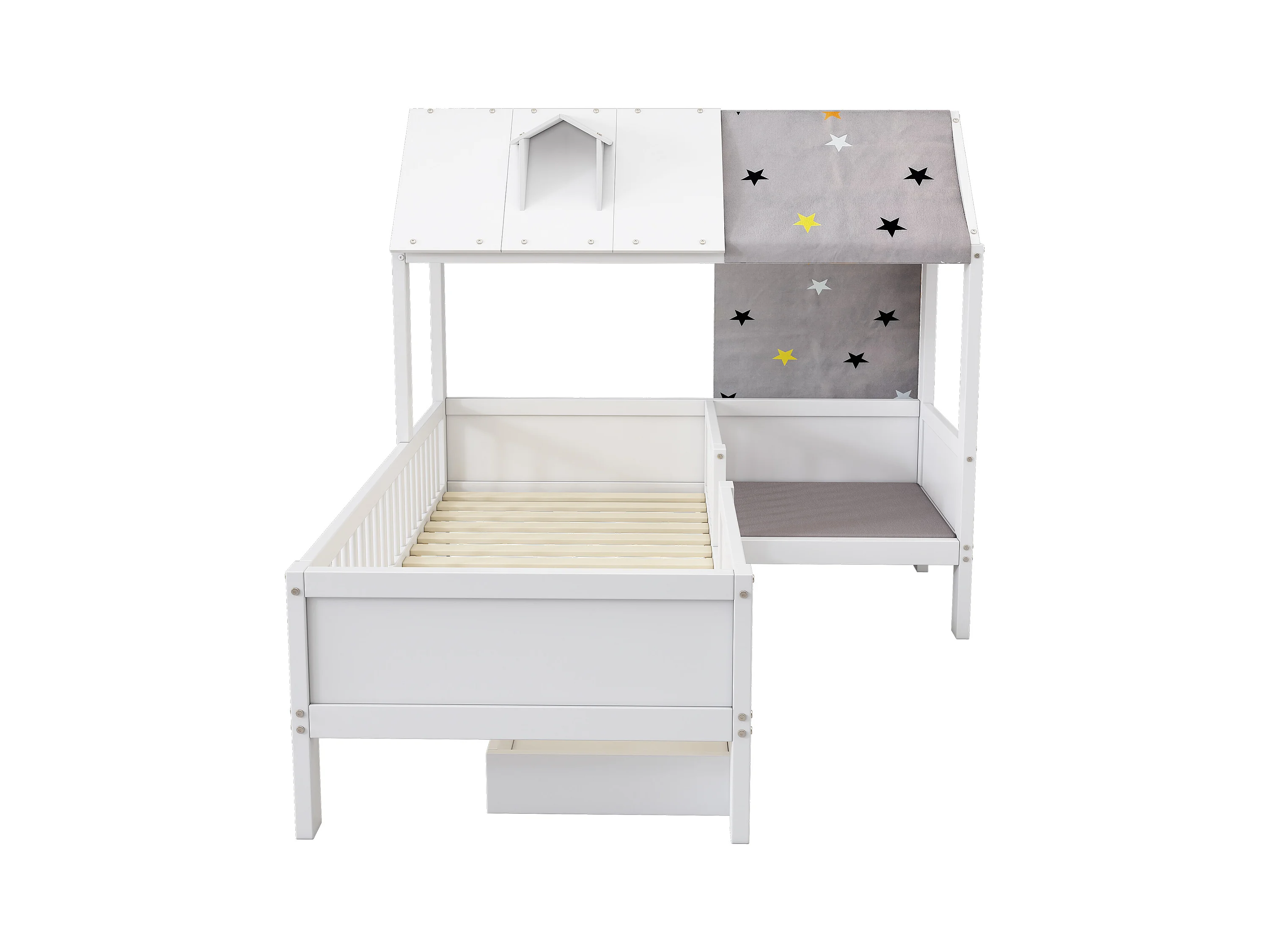 Kajuitbed 90 x 200 cm met stoffen dak en een grote lade - massief hout - wit
