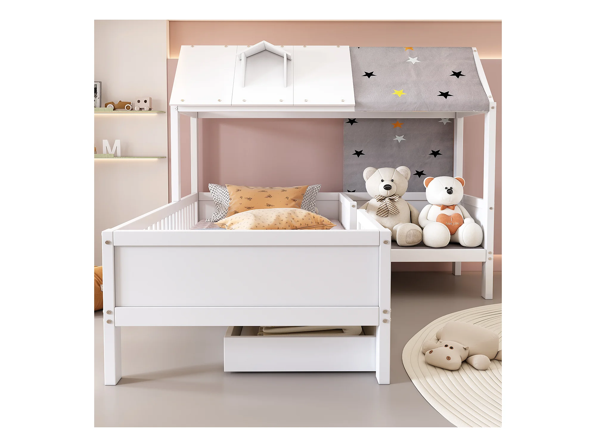 Kajuitbed Mooi Huisbed Kinderbed met 2 Laden Massief Hout met Hek en Basis met Anti-Val Veiligheid Wit (200x90 cm)