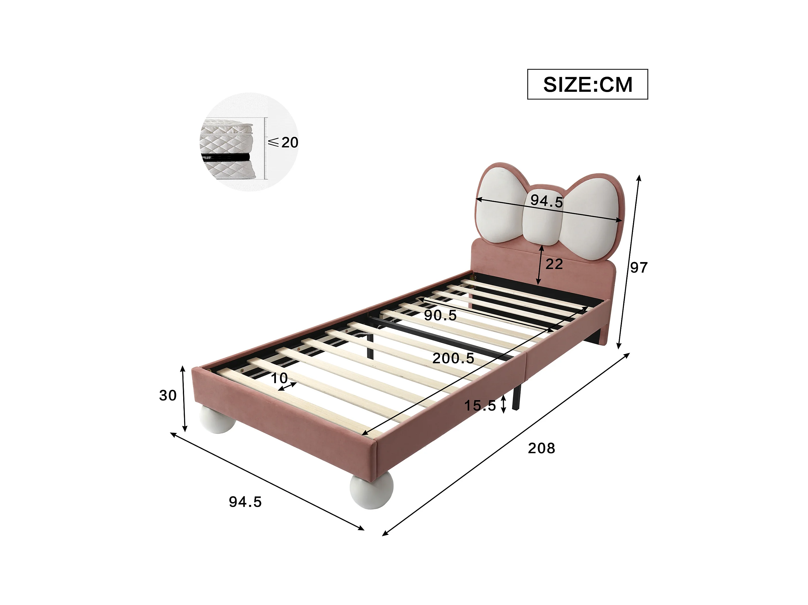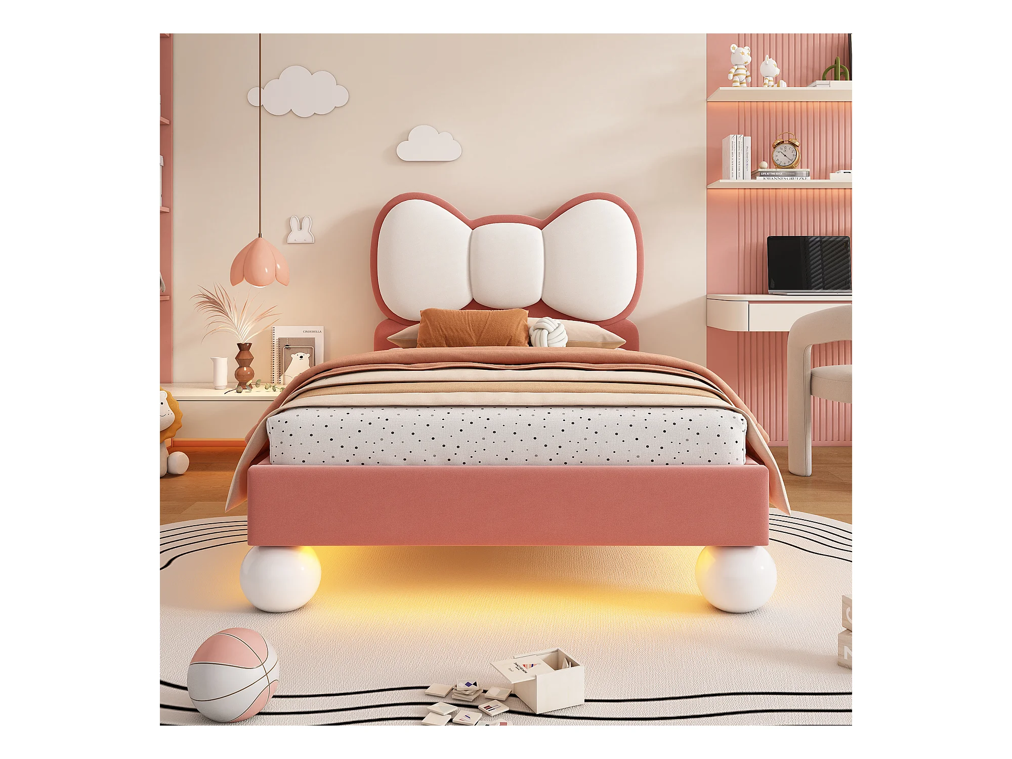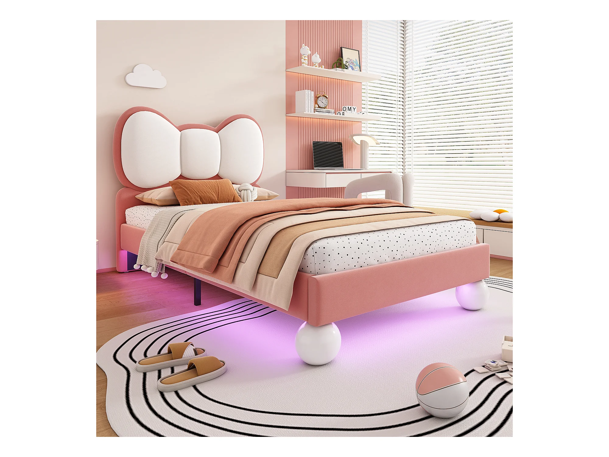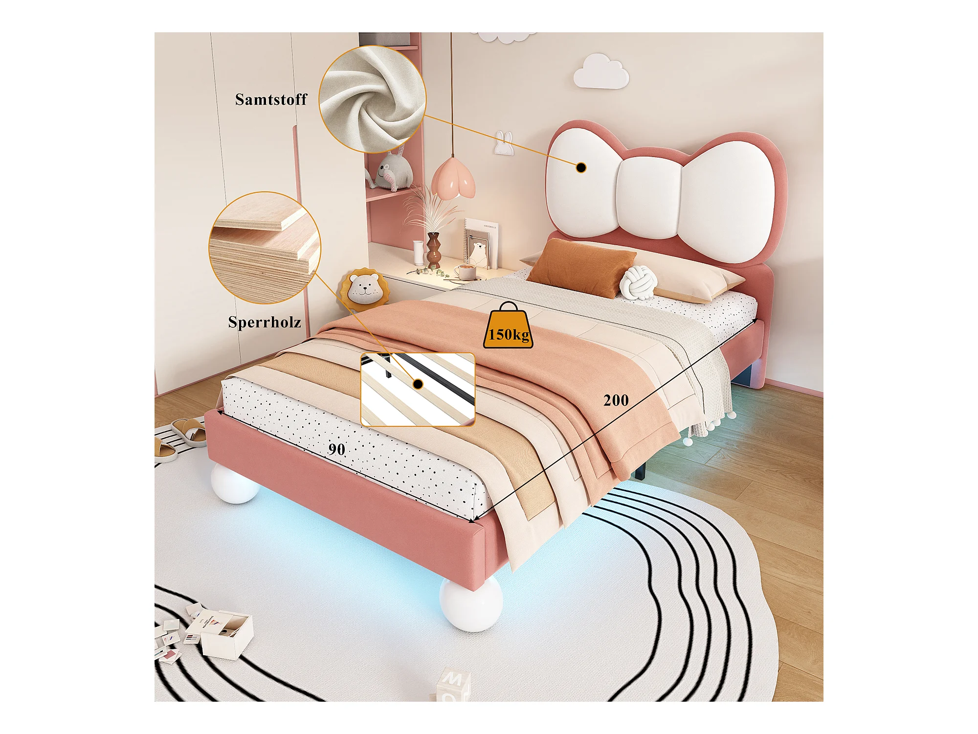 Kinderbed gestoffeerd - 90 x 200 cm - met strik hoofdbord + LED's - PU - roze