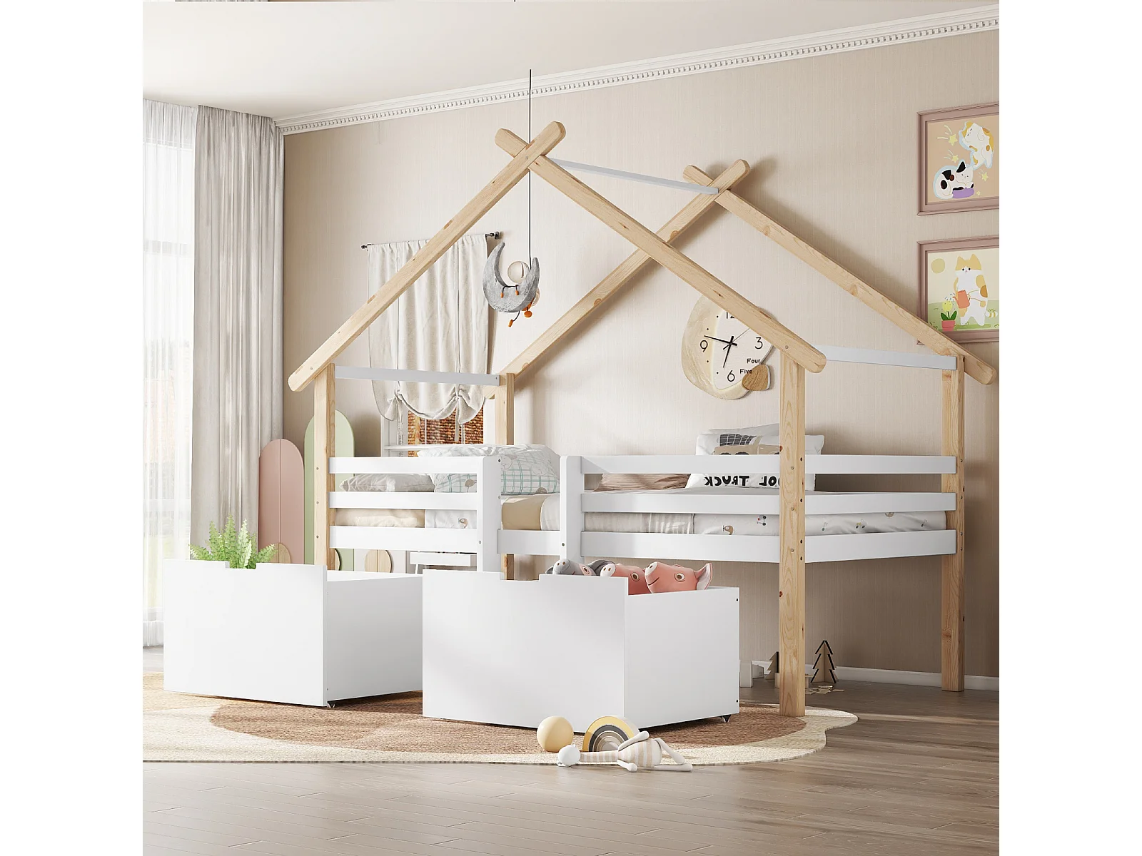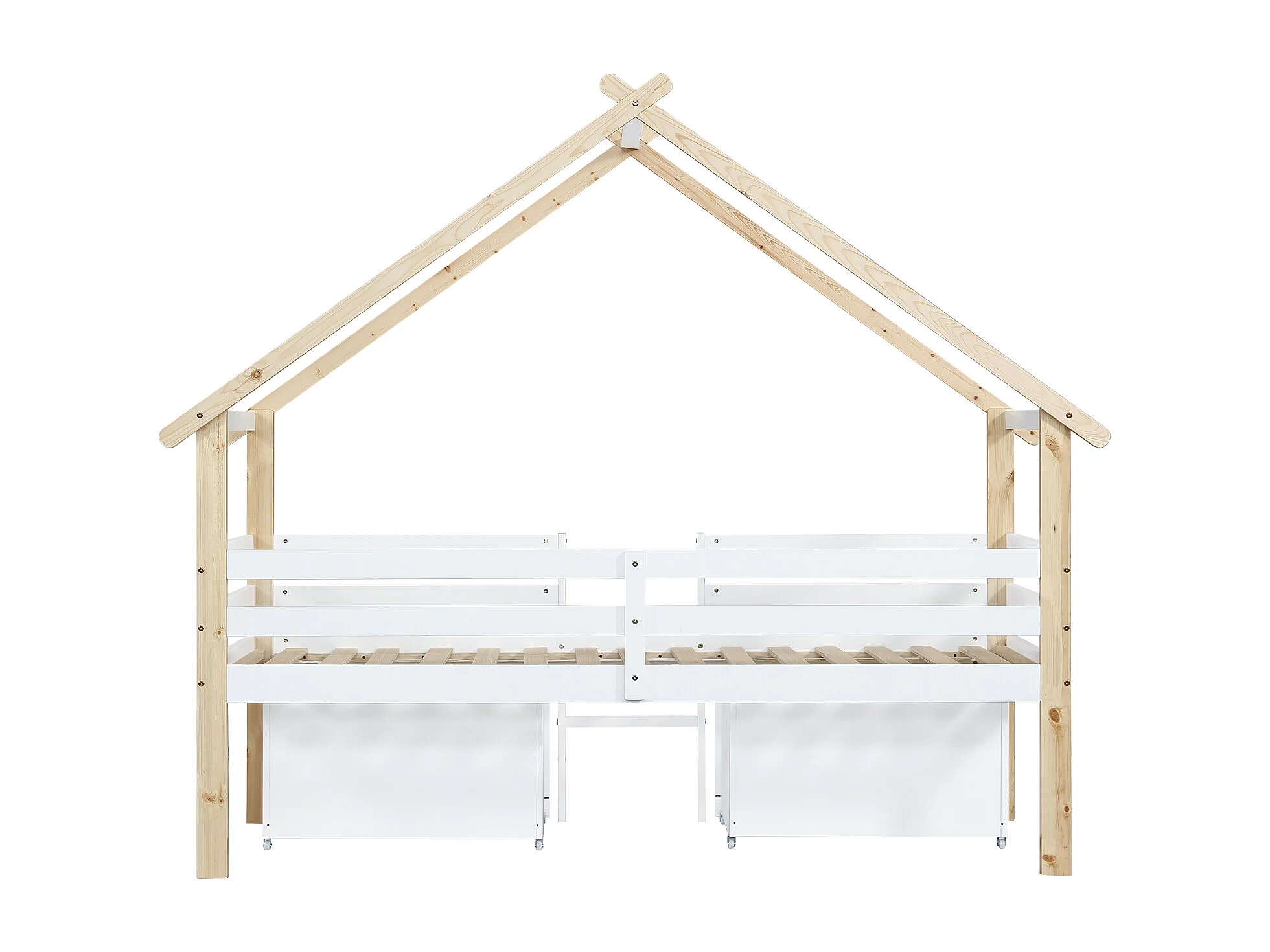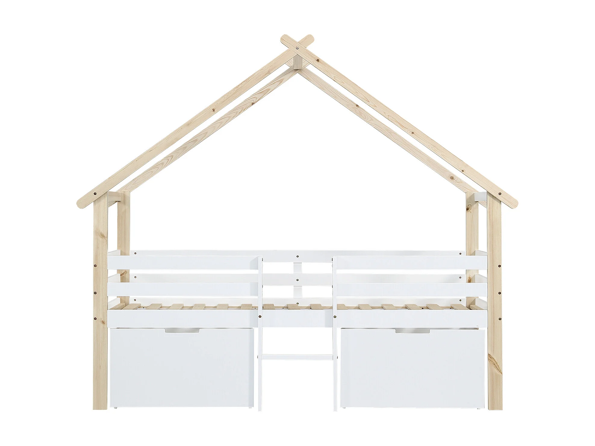 Kinderbed, halfhoog bed, speelhuisbed met dak, vierzijdige omheining, met ladder, 2 opbergvakken op wielen, grenen + MDF, wit + naturel, 90x200cm
