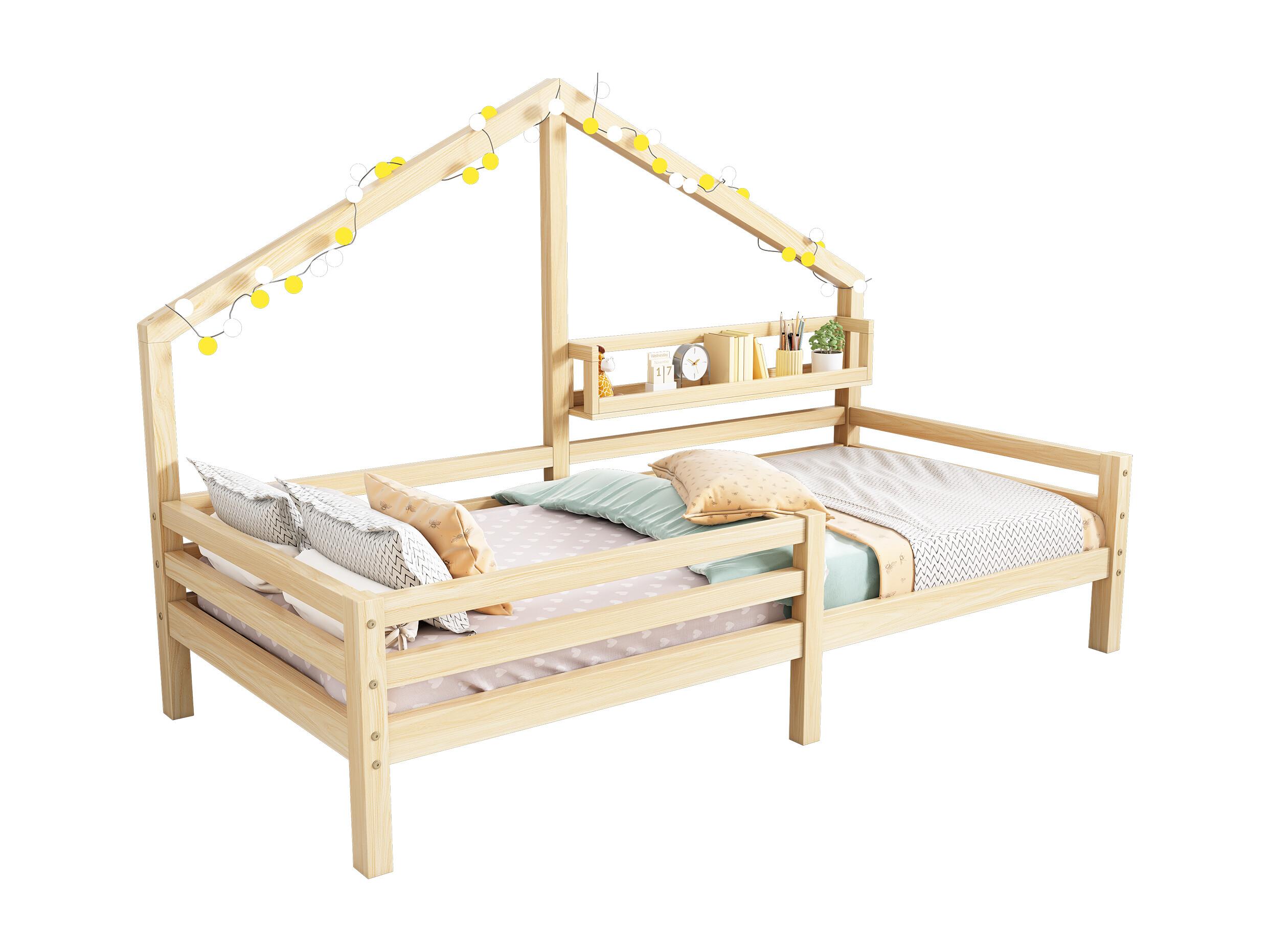 Kinderbed in de vorm van een huis met plank, Scandinavische stijl, natuurlijk grenen, 90x200 cm (Lengte 206,5 x Breedte 97 x Hoogte 138,5 cm)