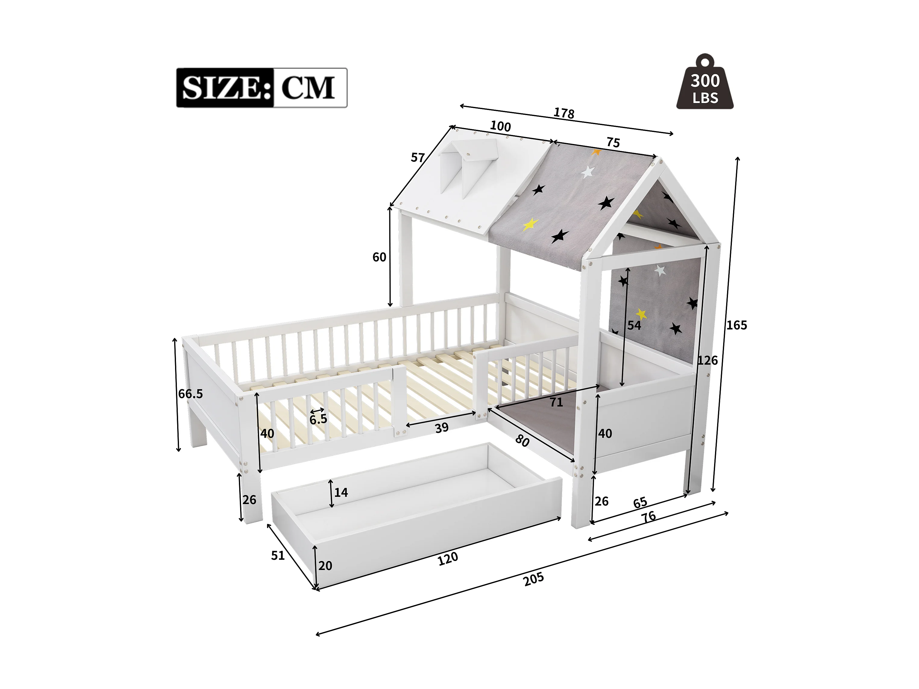 Kinderbed in de vorm van een huis met tent en kussens, 2 opberglades, massief hout, wit (90x200 cm)