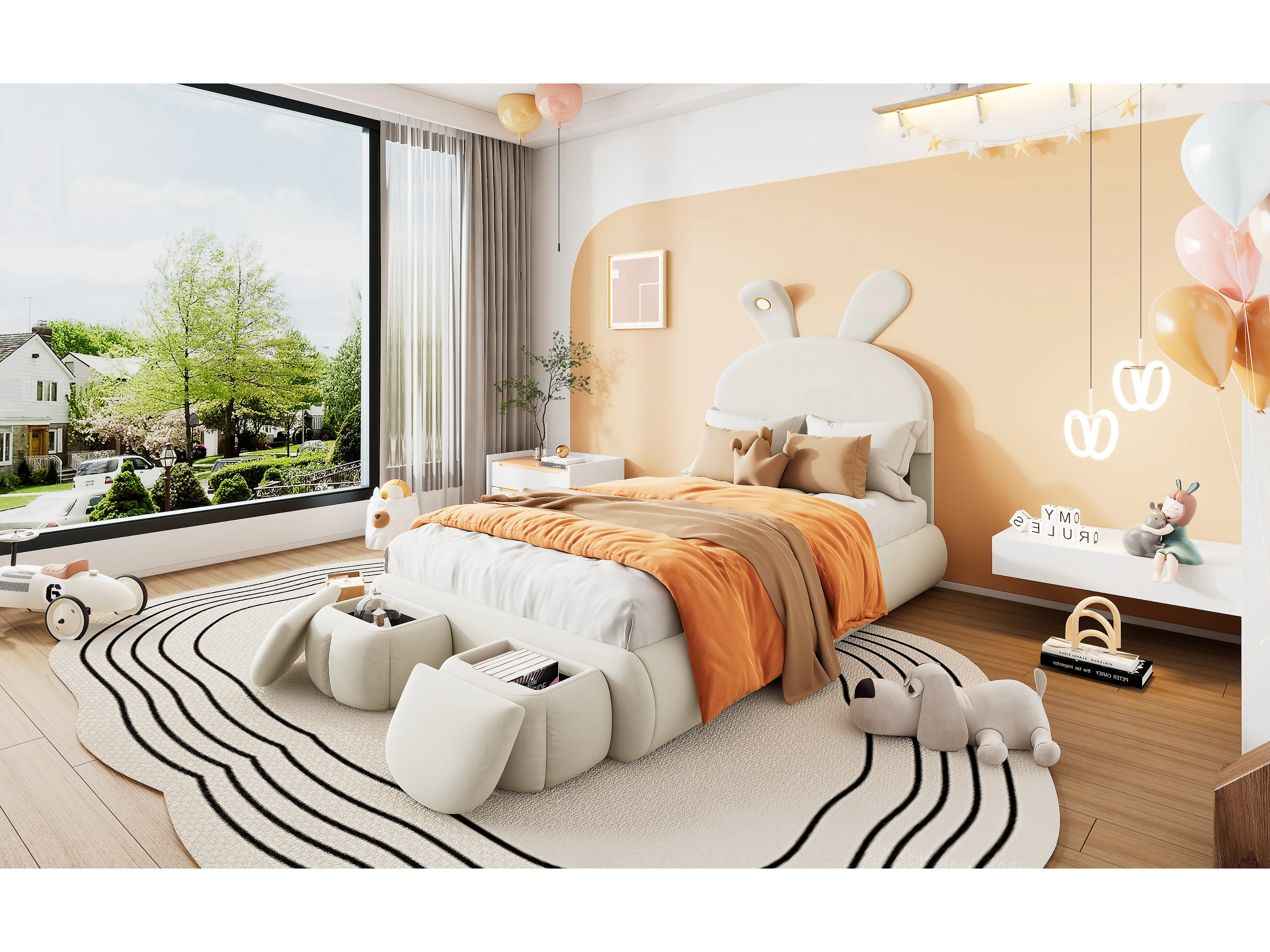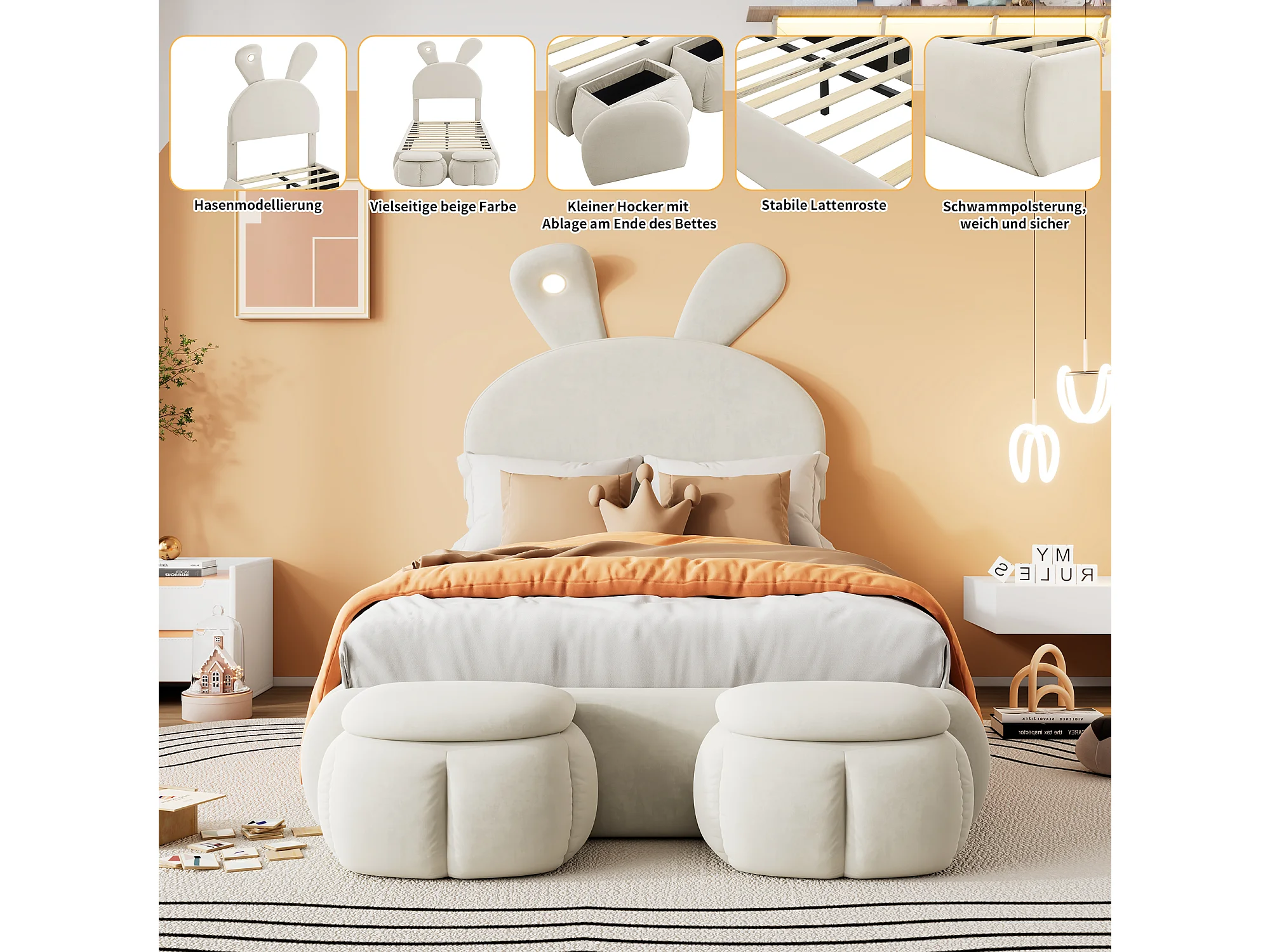 Kinderbed met cartoonbekleding - 90 x 200 cm - met 2 opbergkrukken - Konijnenoren met led-lampjes - Fluweel - Wit