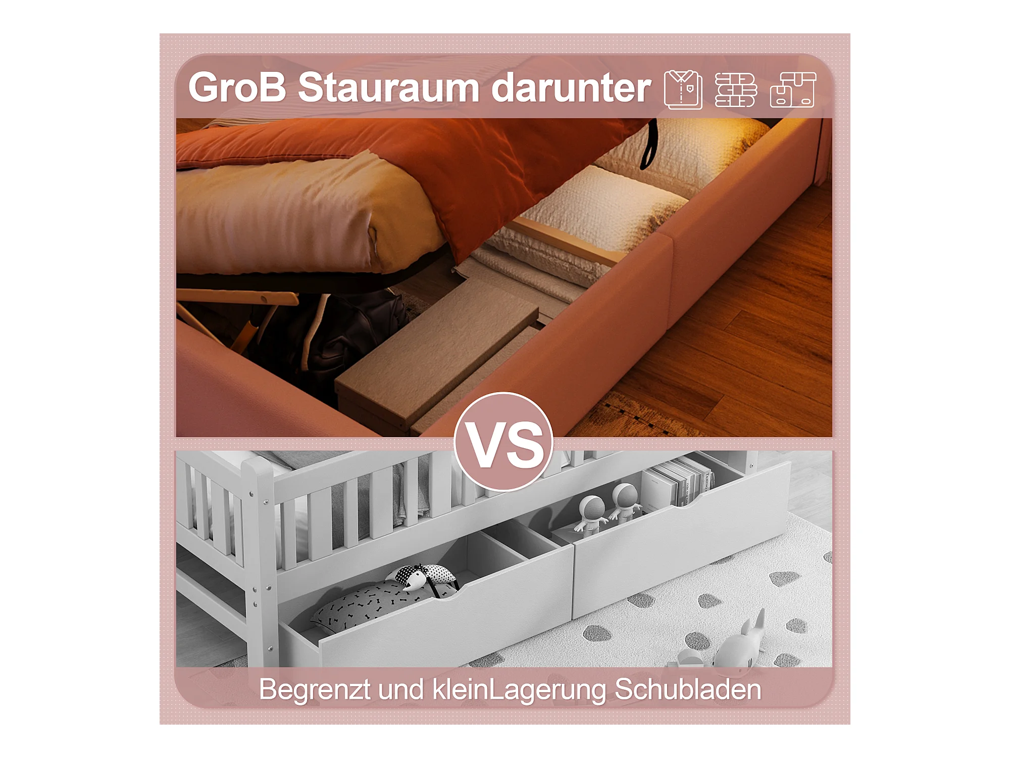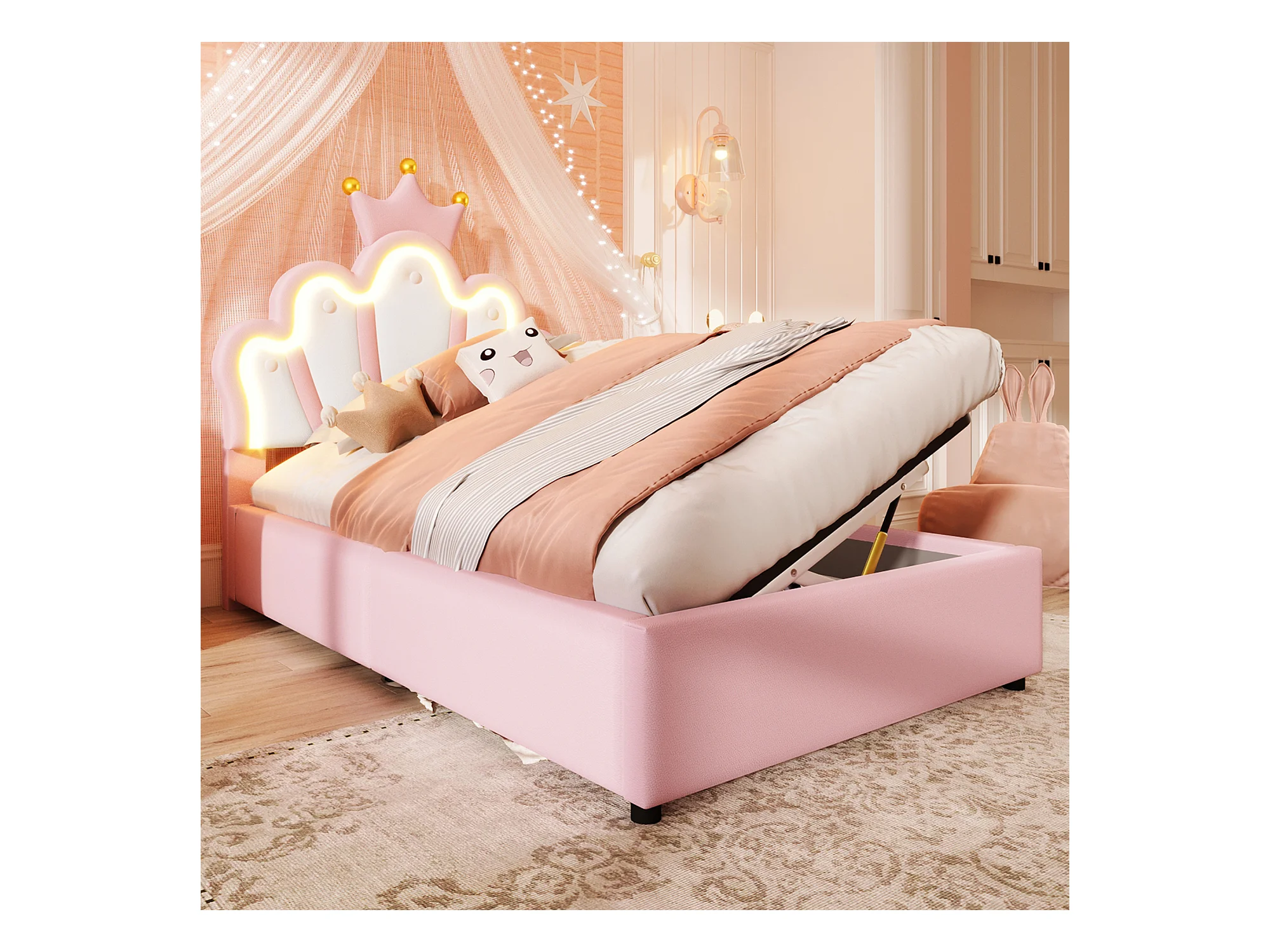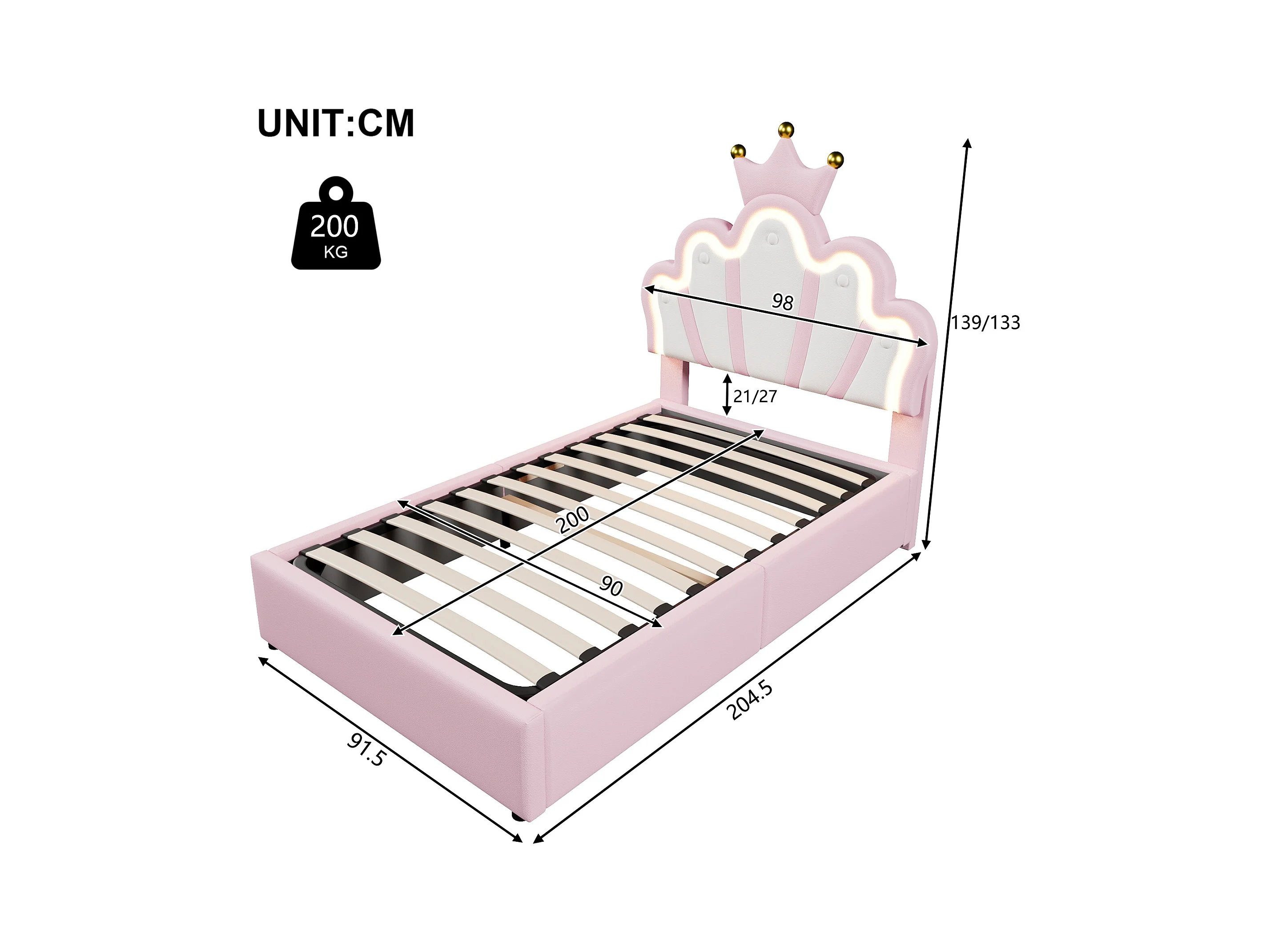 Kinderbed met opbergruimte - 90 x 200 cm - hydraulische opberging - met LED's + verstelbaar hoofdeinde - PU - roze