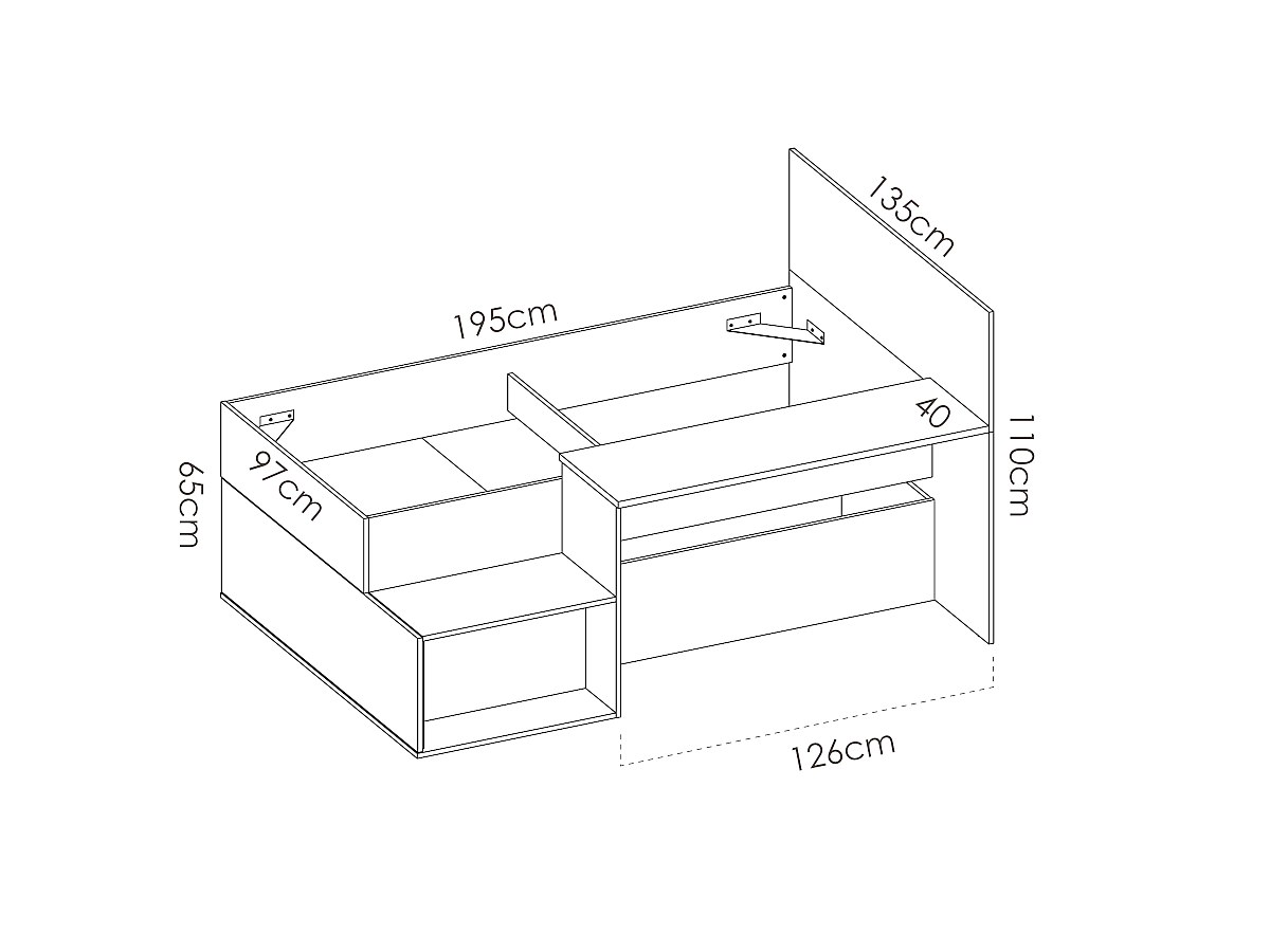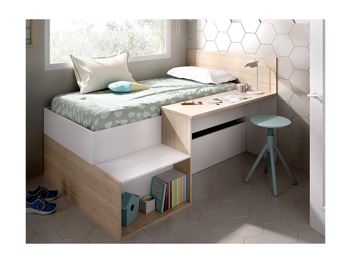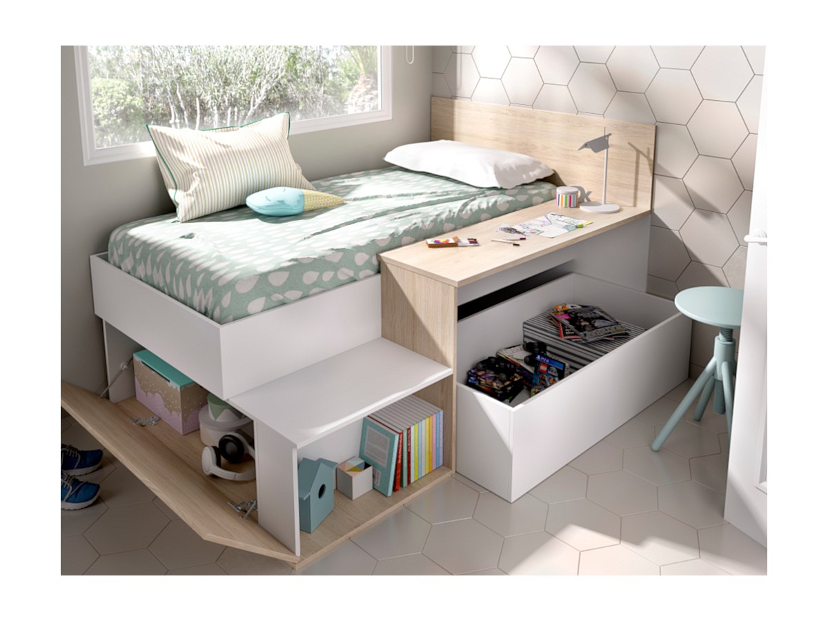 Kinderbed met opbergruimte en bureau LISON + Matras - 90 x 190 cm - Antraciet en eik