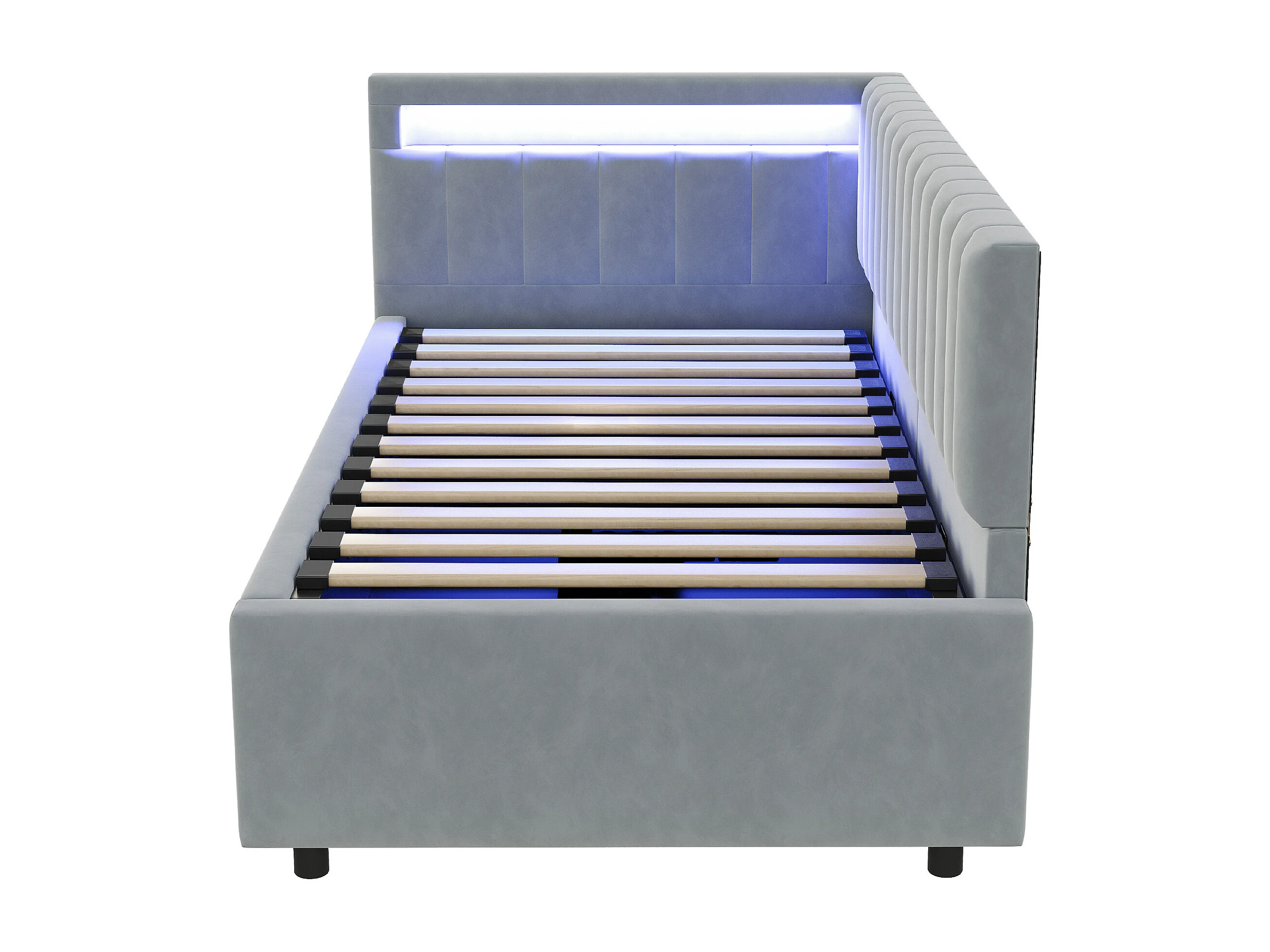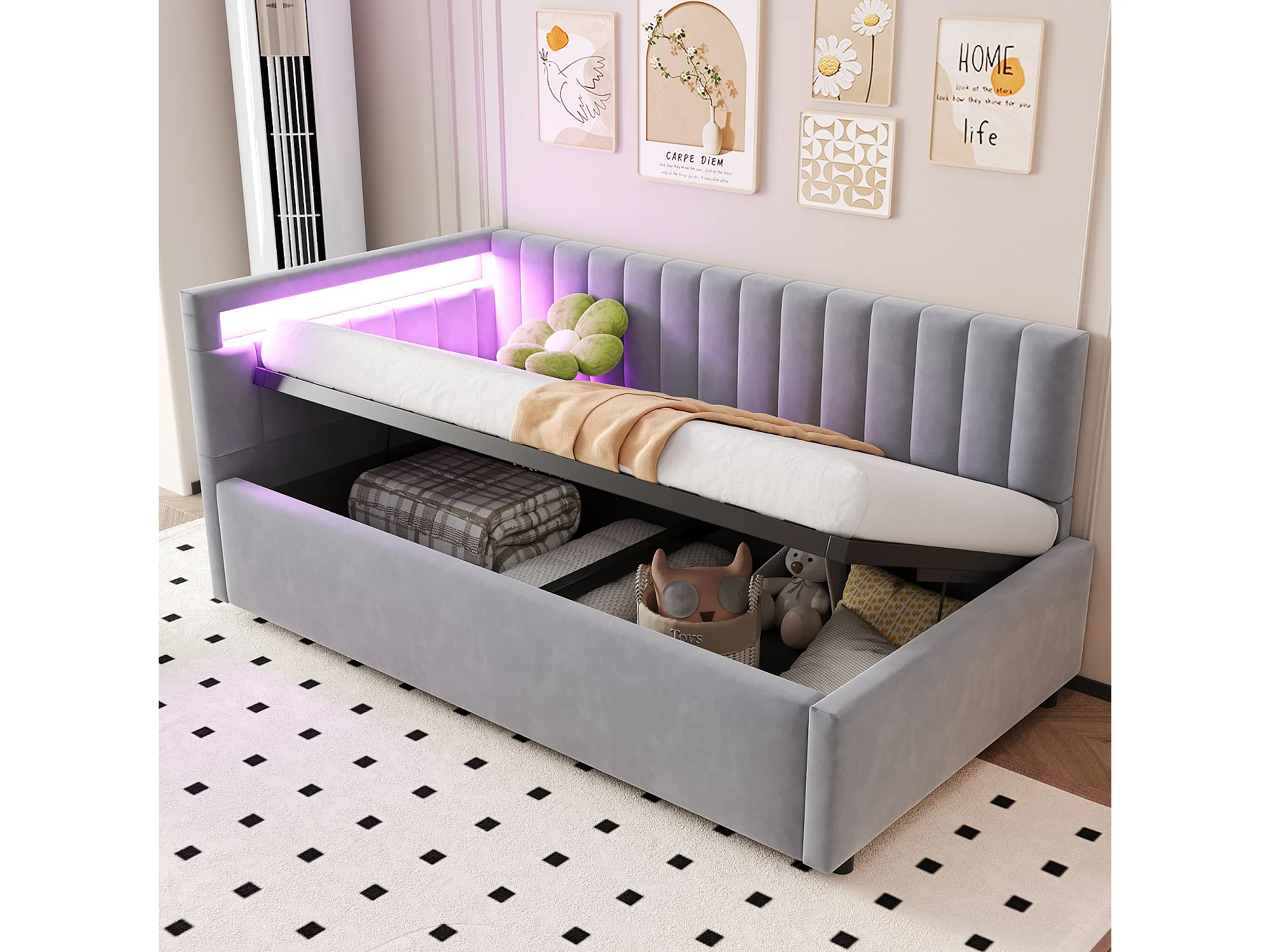 Kinderbedbank 90x200 cm met opbergruimte en LED-verlichting, bekleed met lichtgrijs fluweel, zonder matras