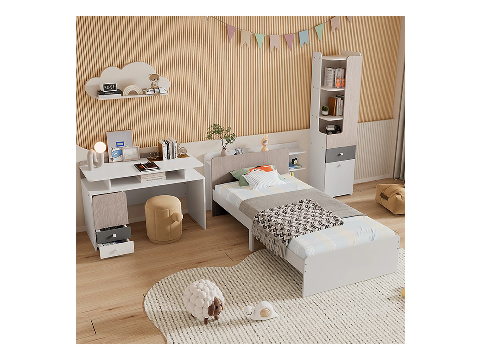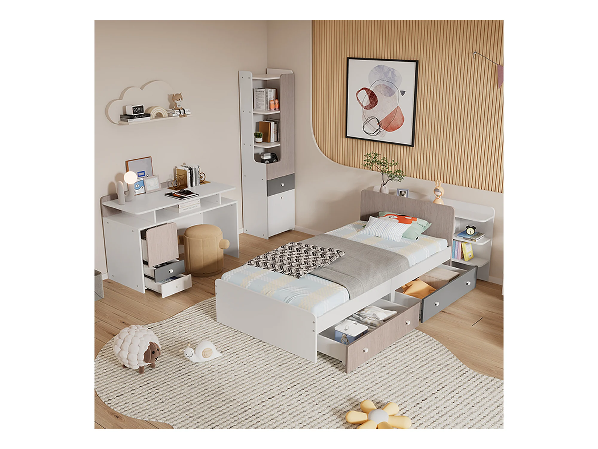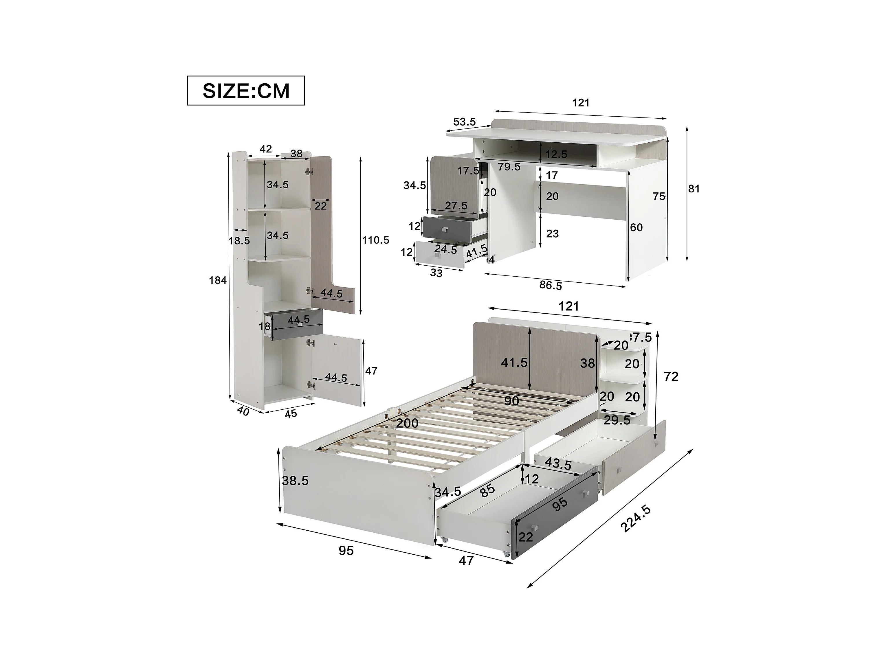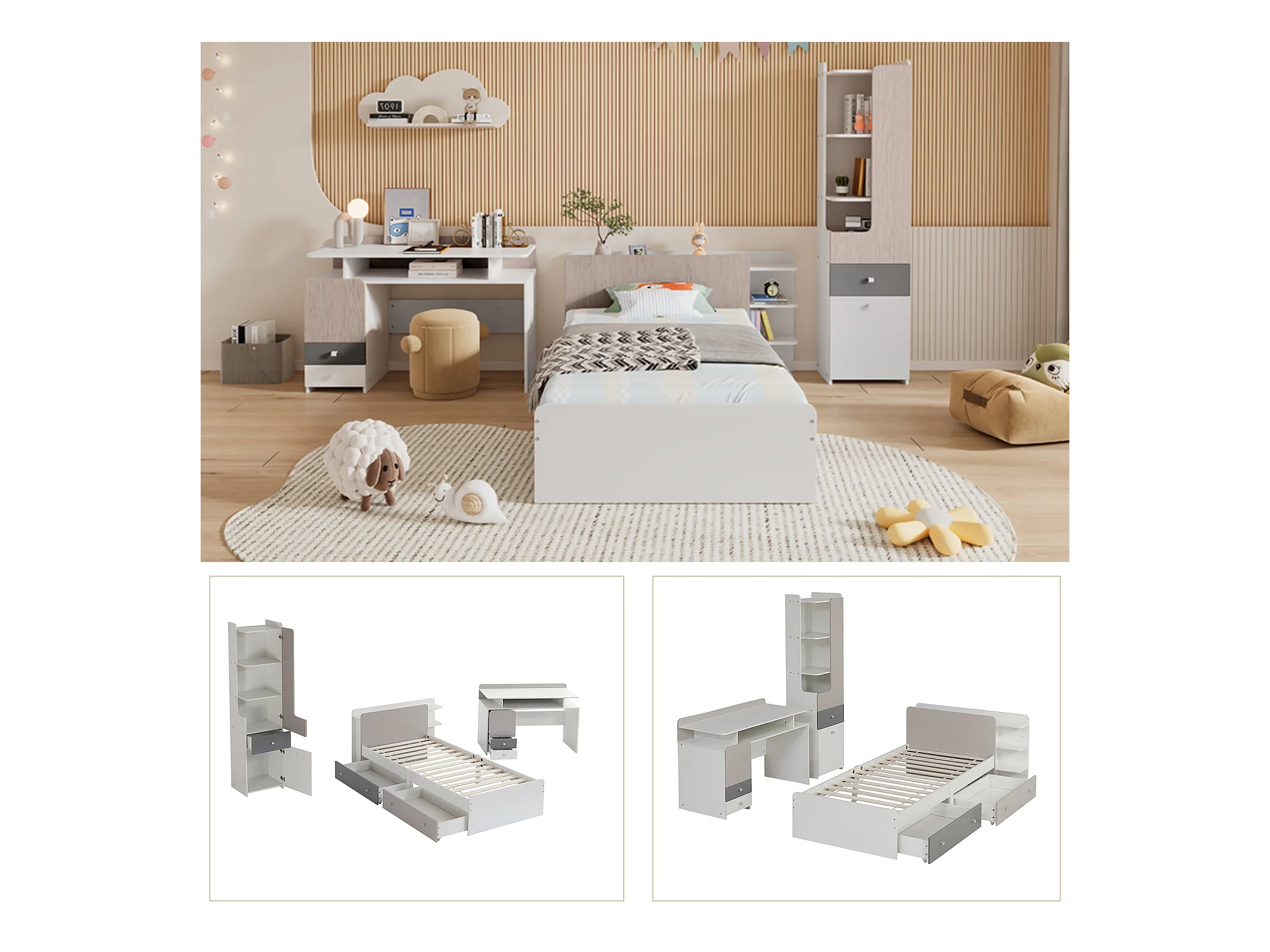 Kinderbeddenset 90 x 200 cm met 2 lades + planken + bureau + boekenkast - MDF + meerlaags paneel - kleur wit + grijs