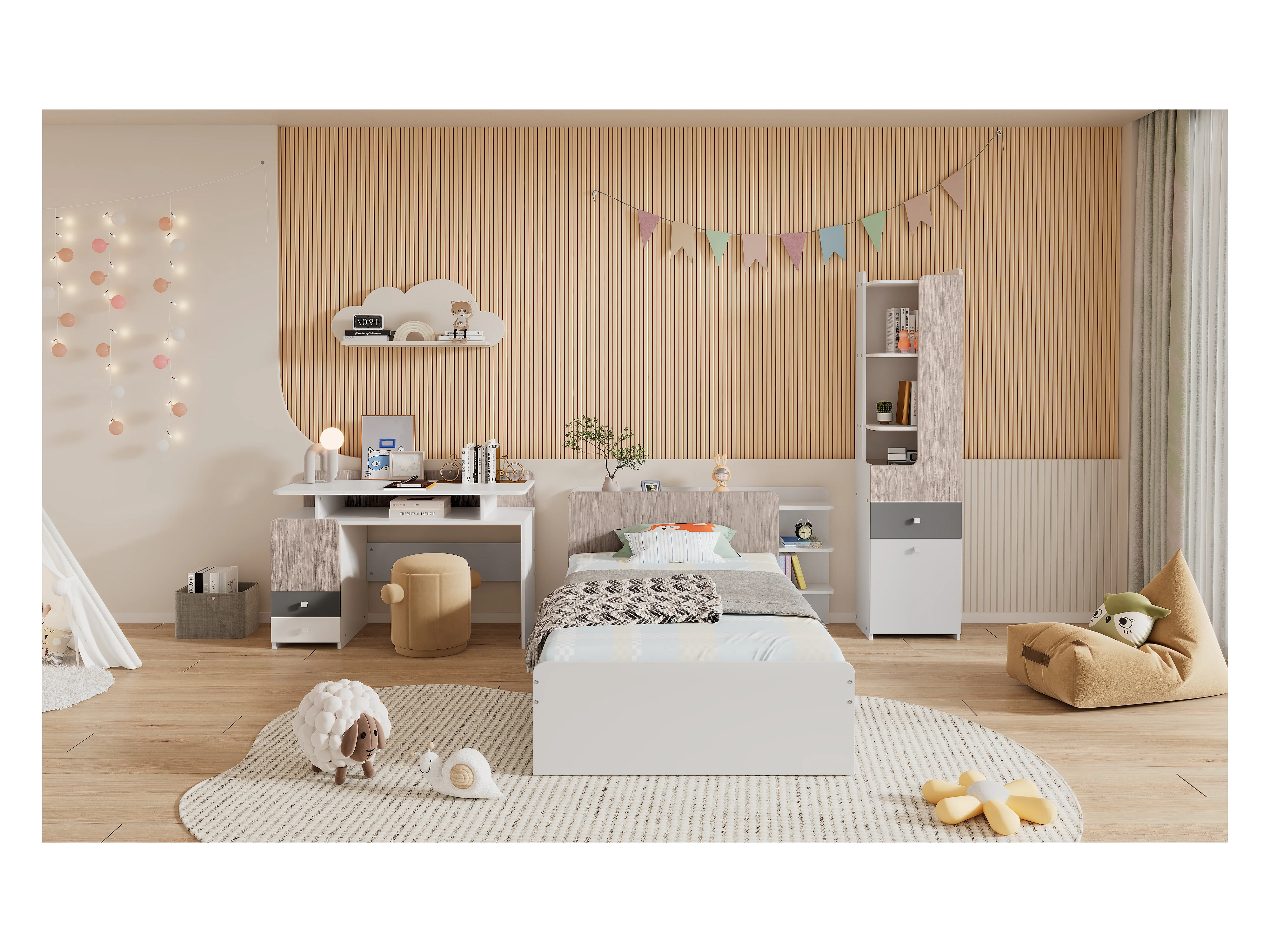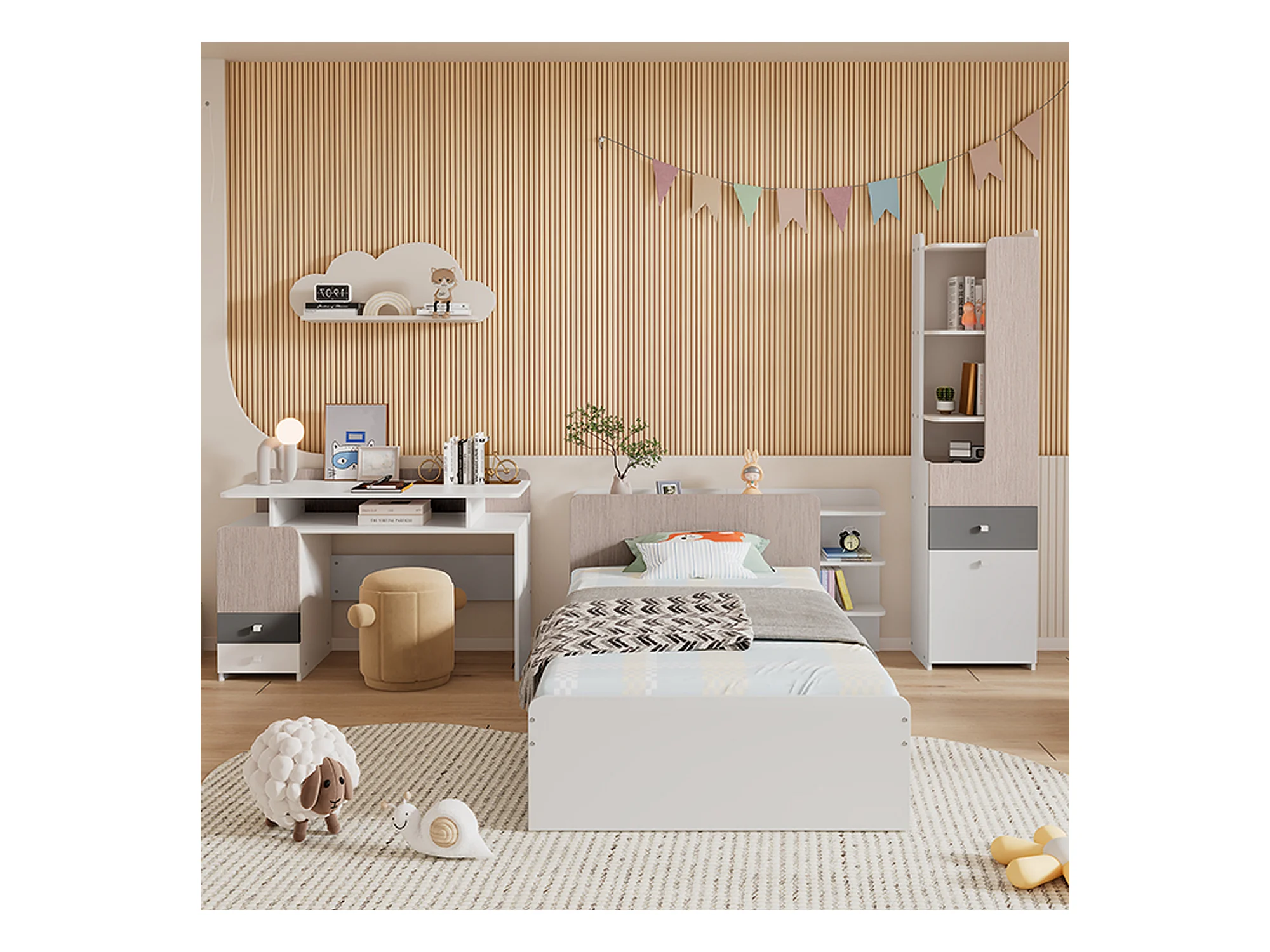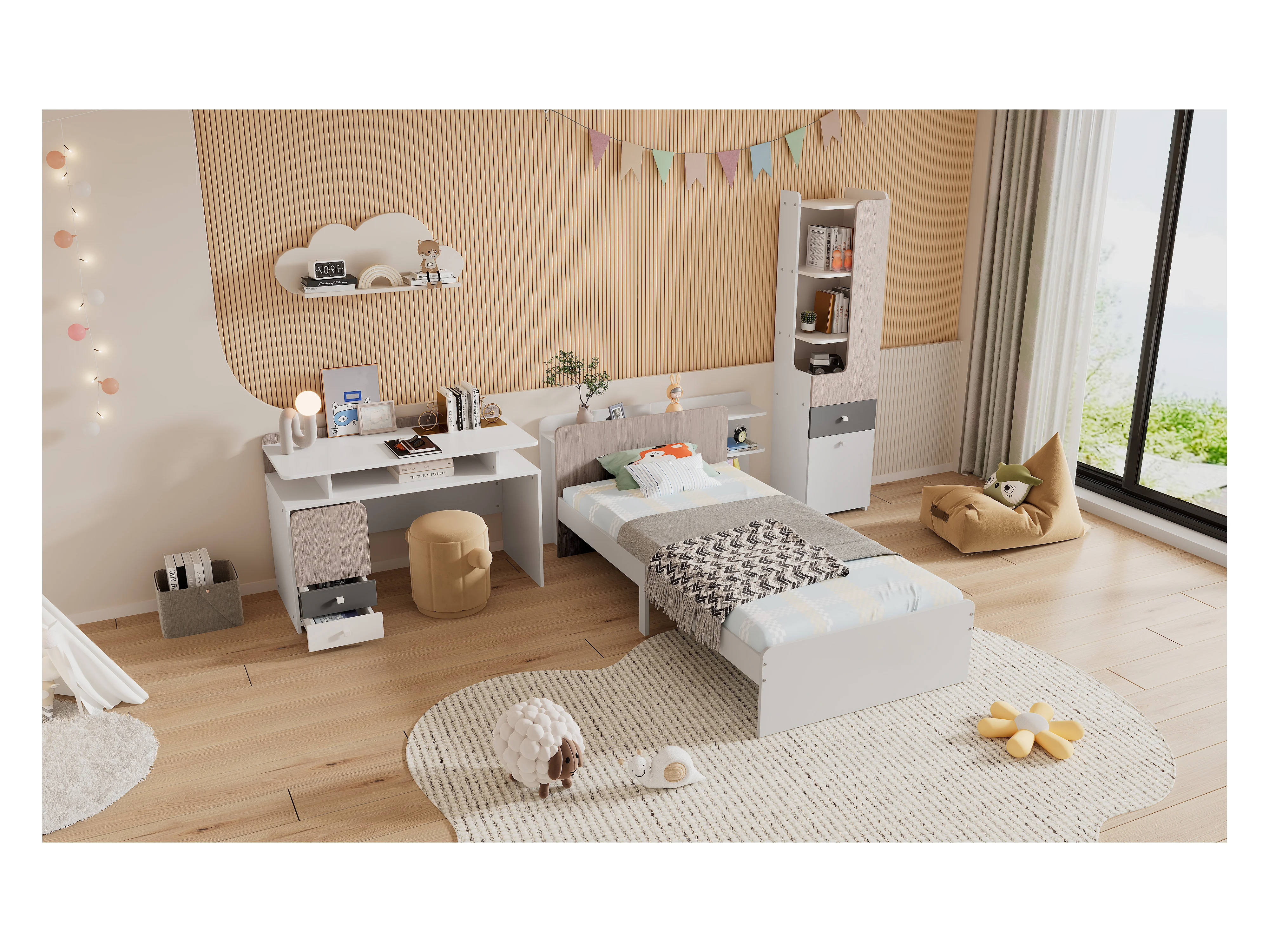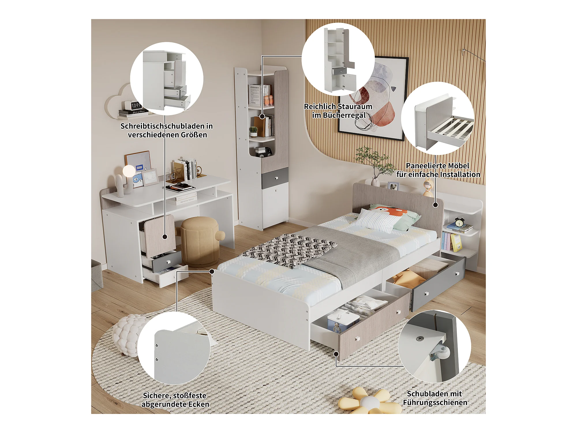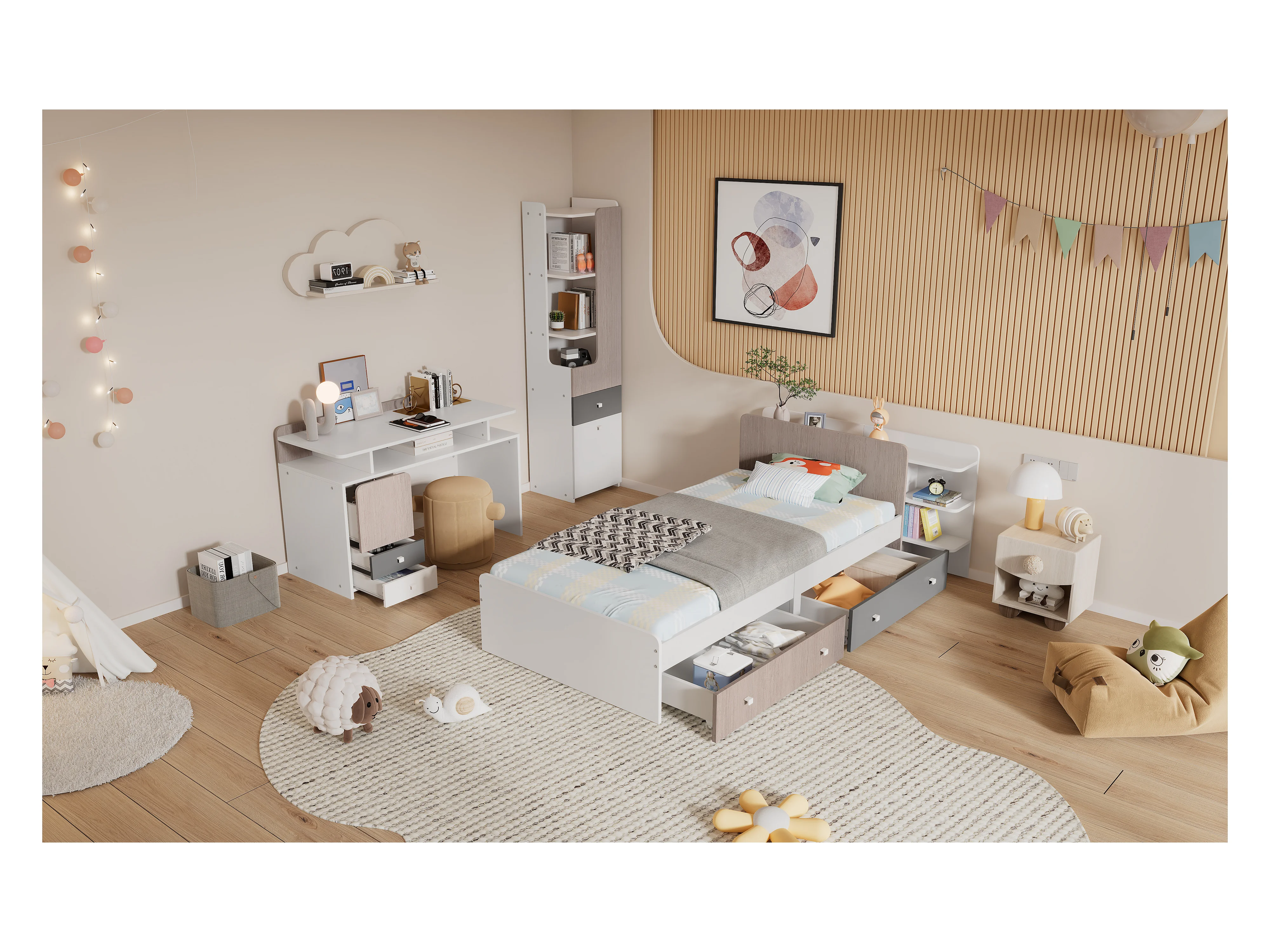 Kinderbeddenset 90 x 200 cm met 2 lades + planken + bureau + boekenkast - MDF + meerlaags paneel - kleur wit + grijs