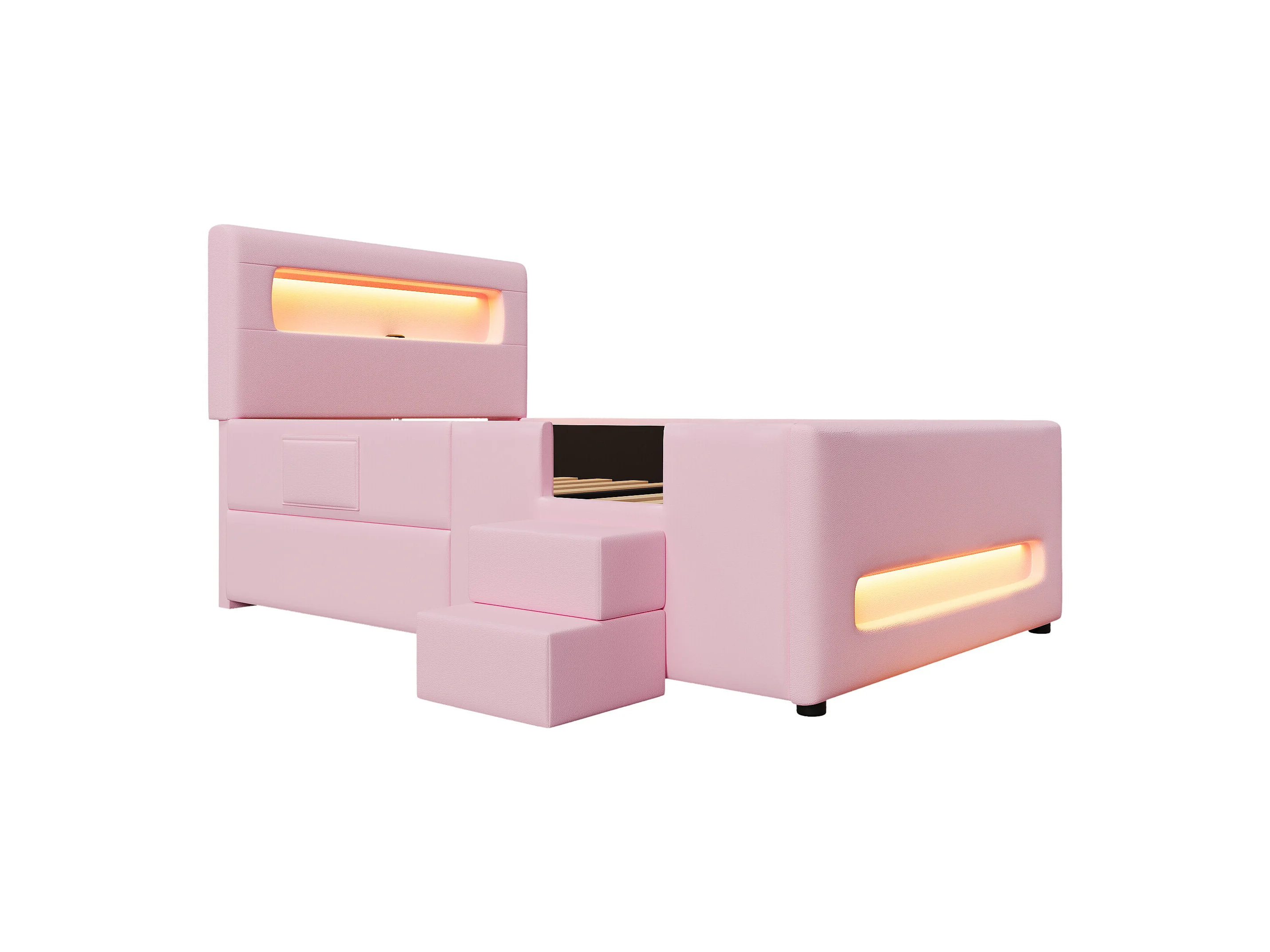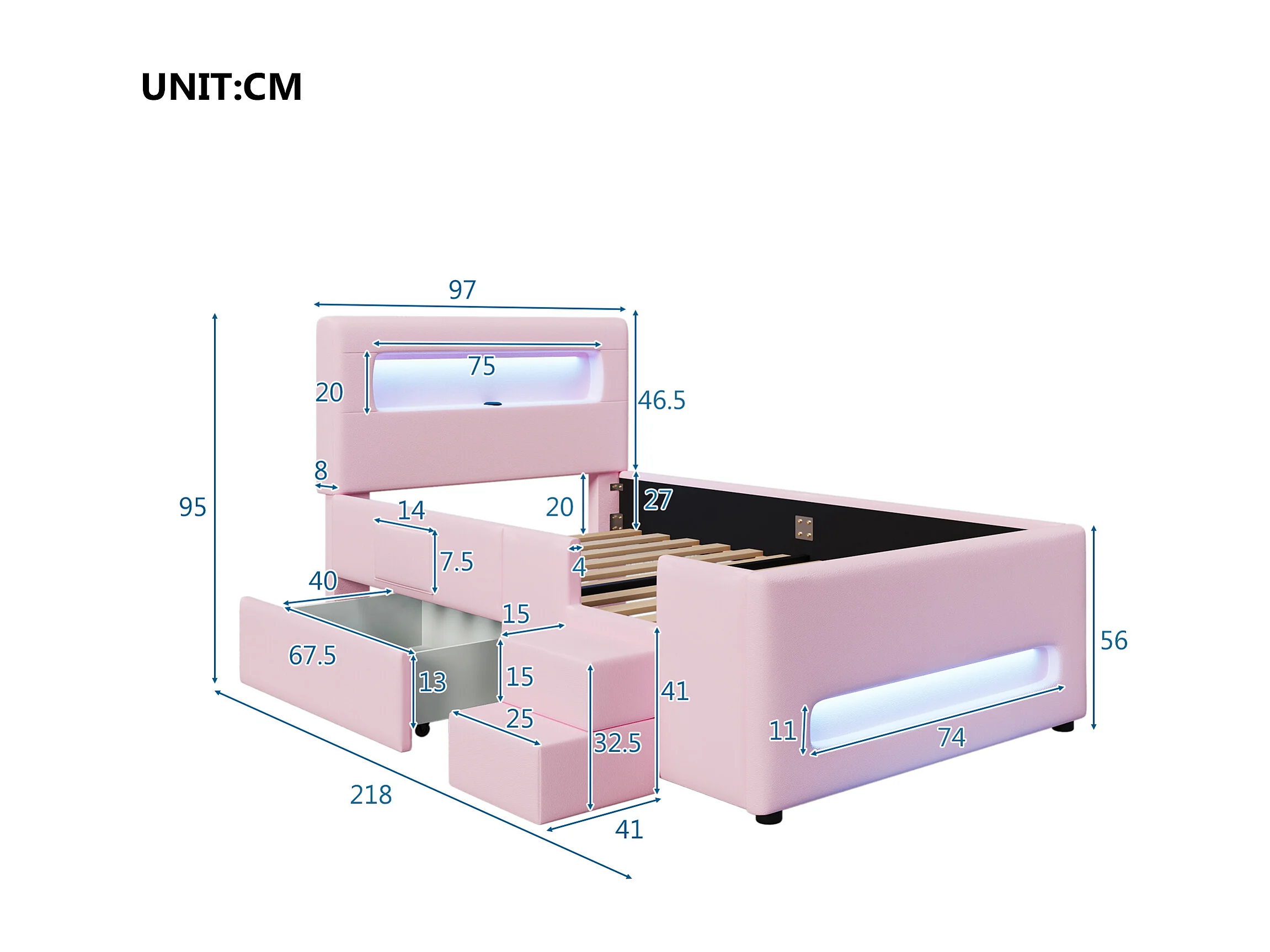 Kinderbett 90x200cm mit Schublade, LED-Beleuchtung und USB-Anschluss – Rosa PU-Leder
