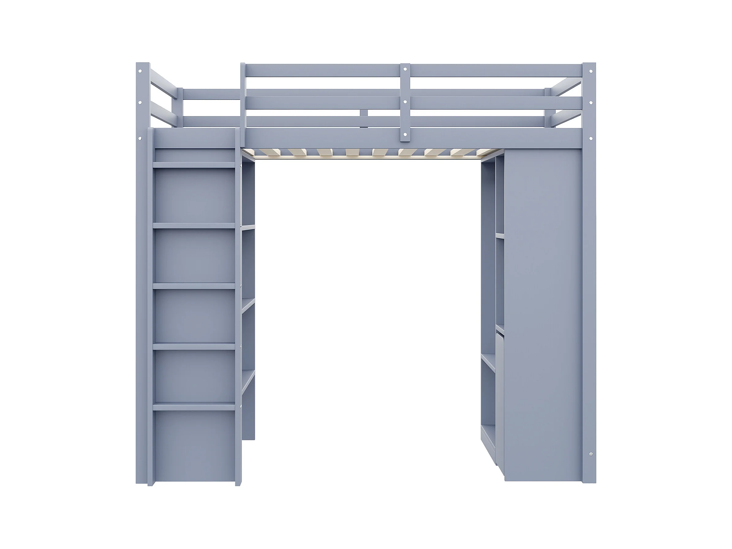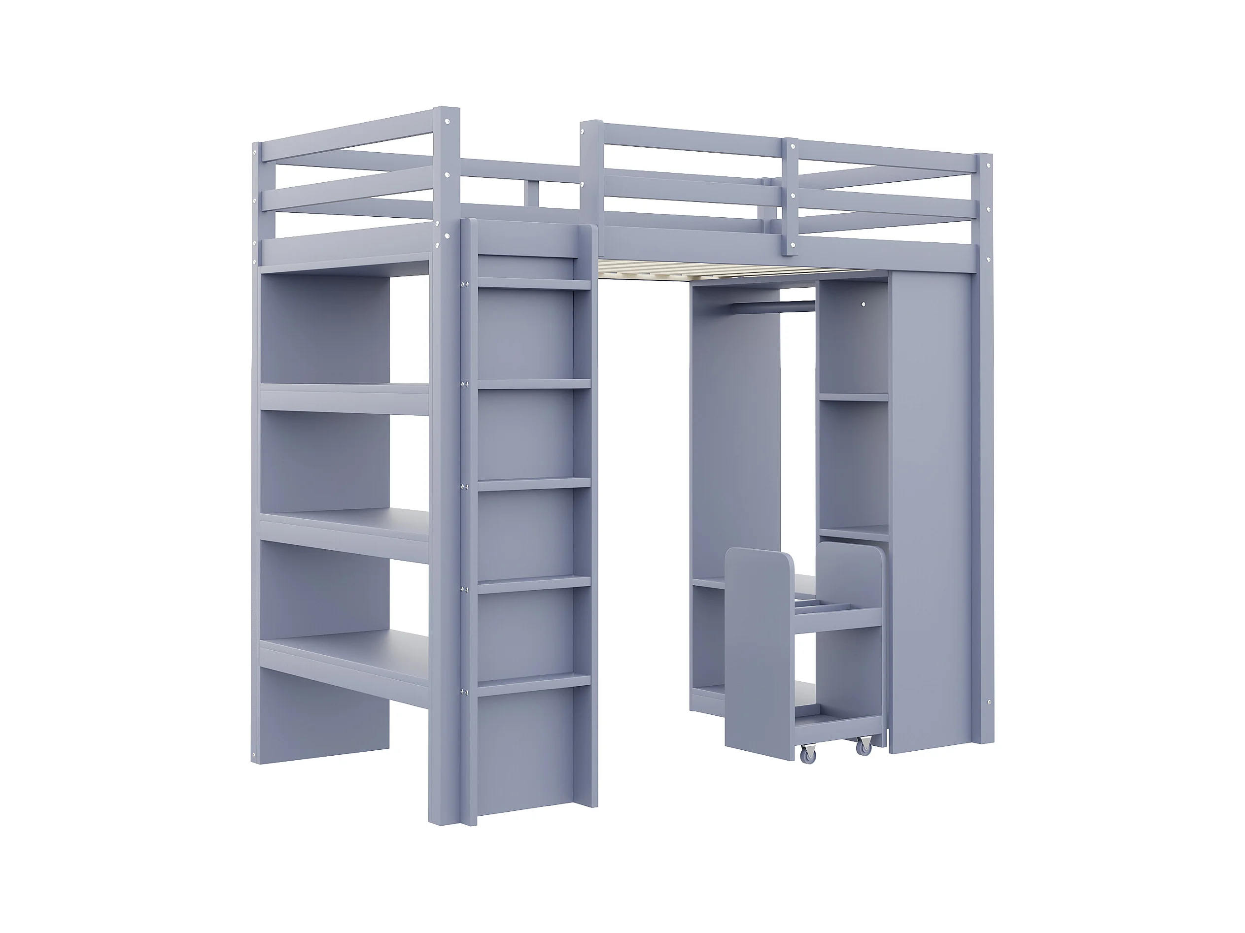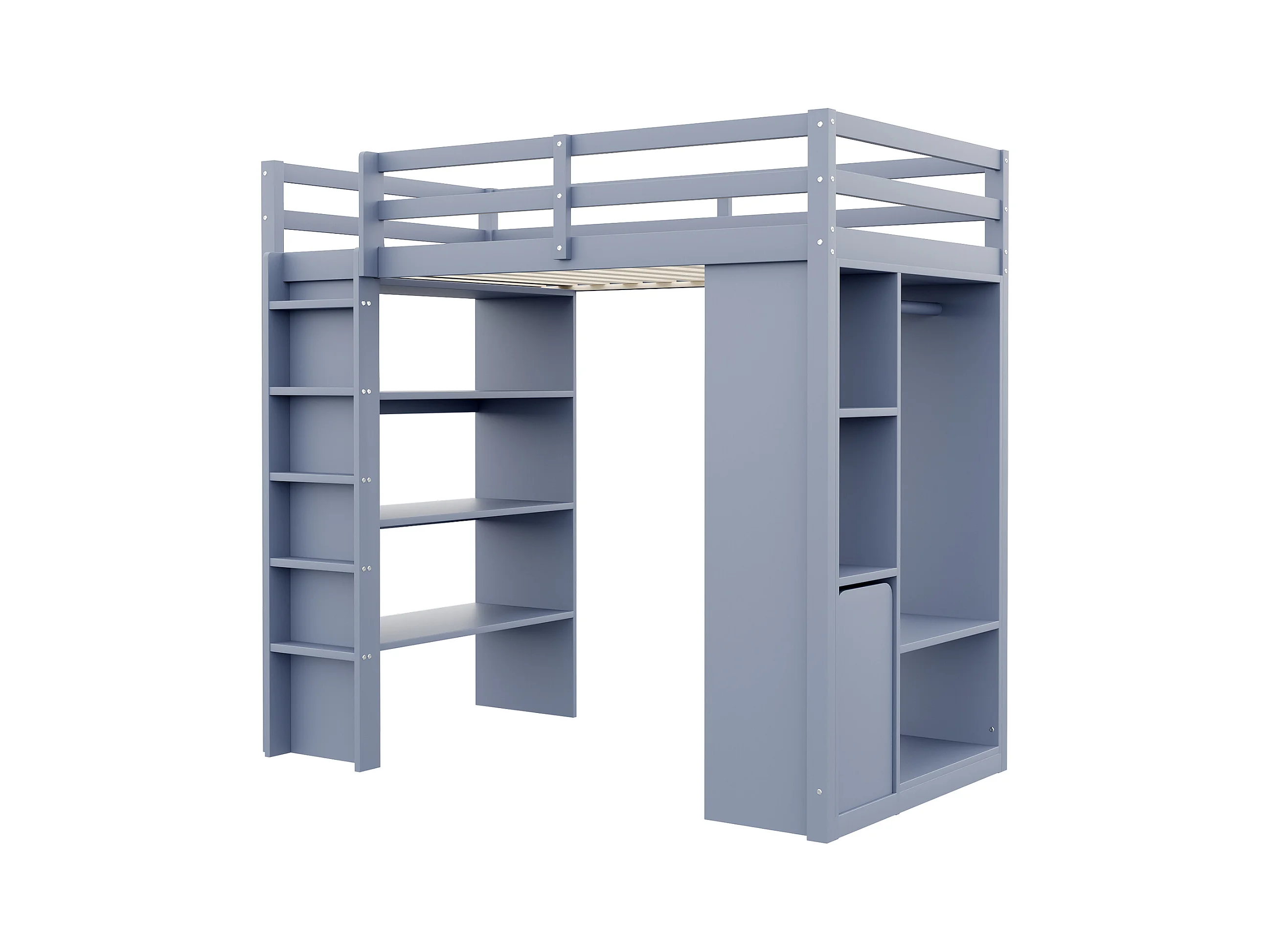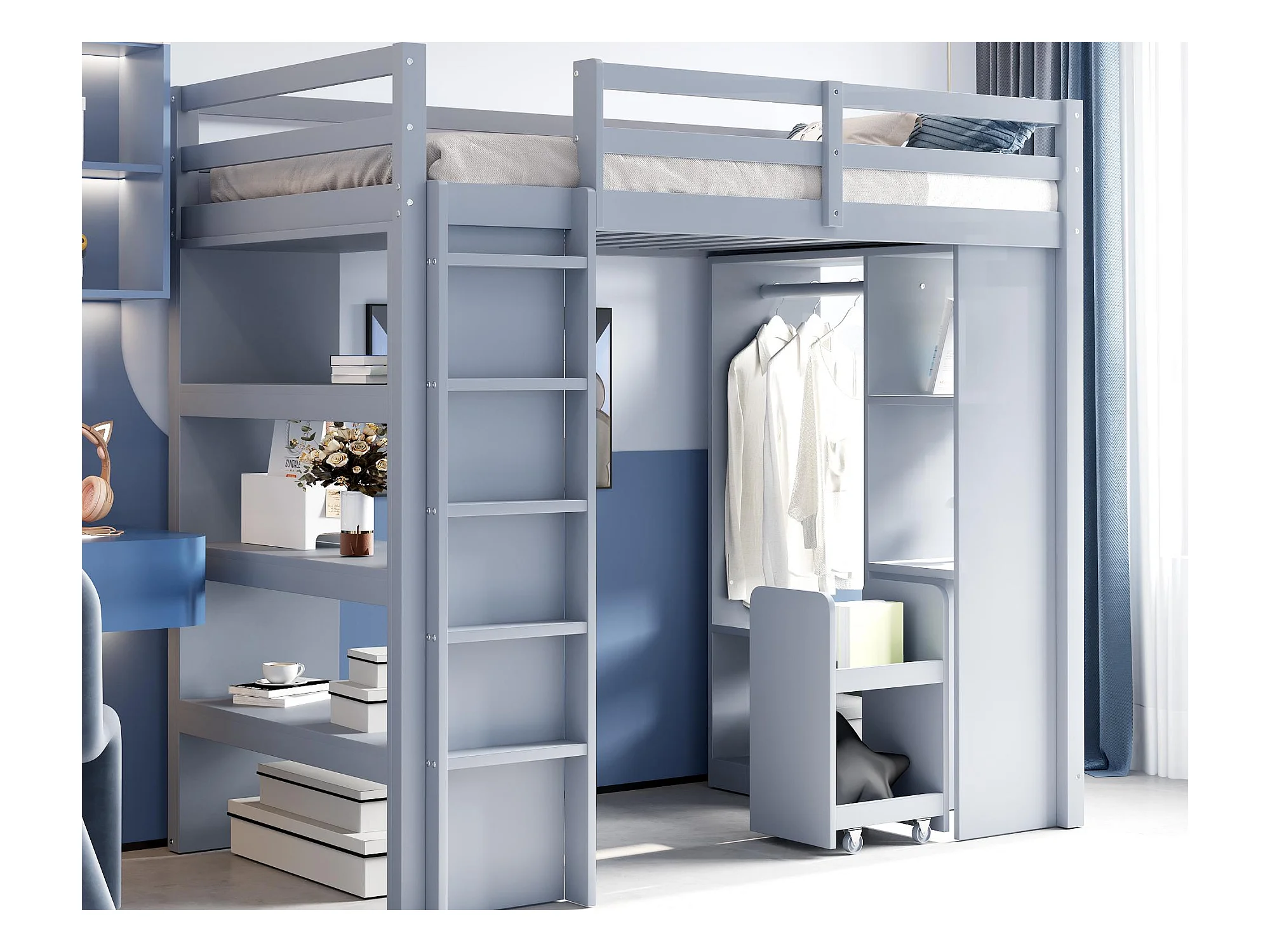 Hoogslaper 90x200cm, stapelbed met kledingkast, planken en opbergruimte met planken en opbergruimte, bovenste anti-valrooster, grijs