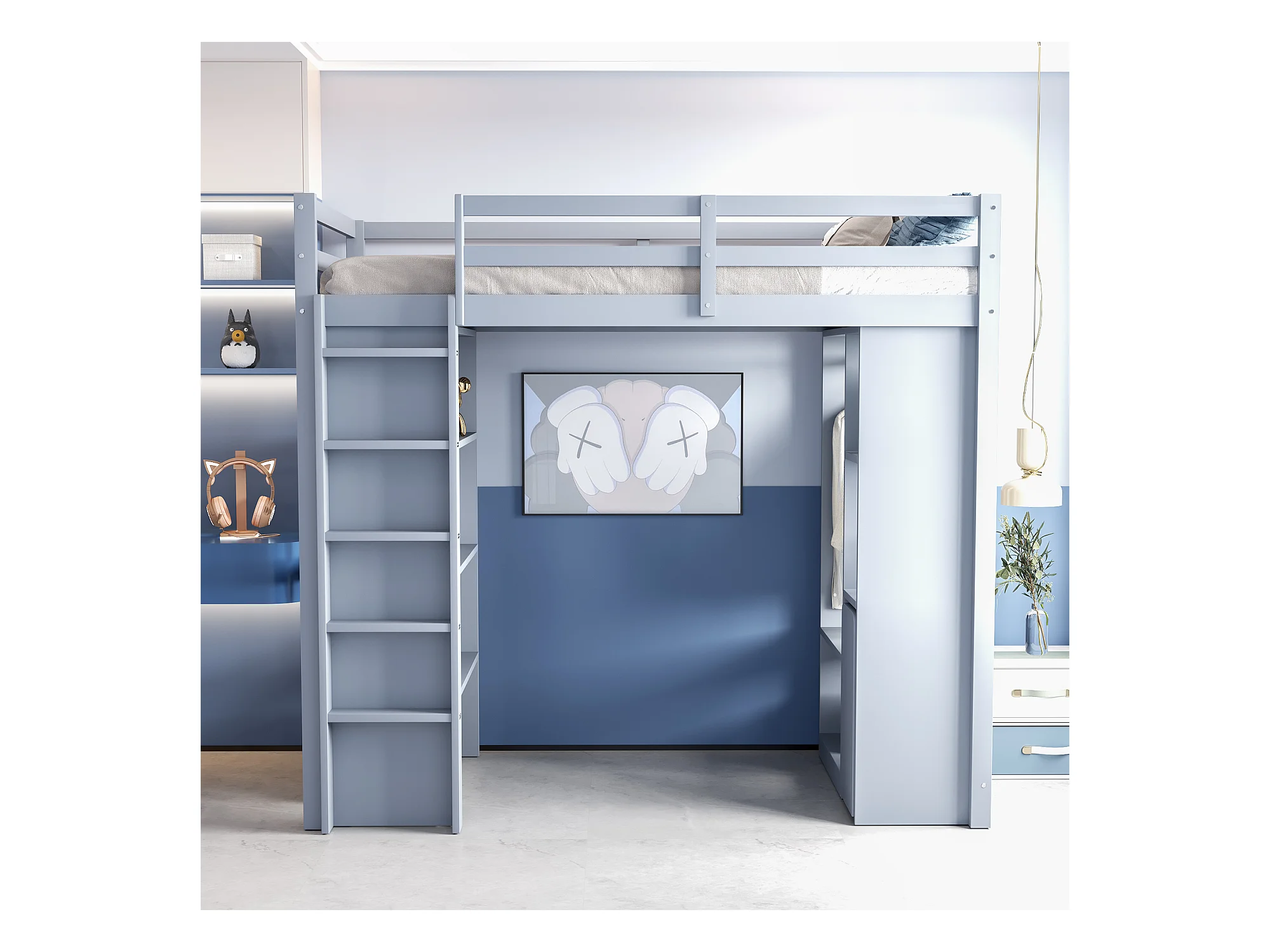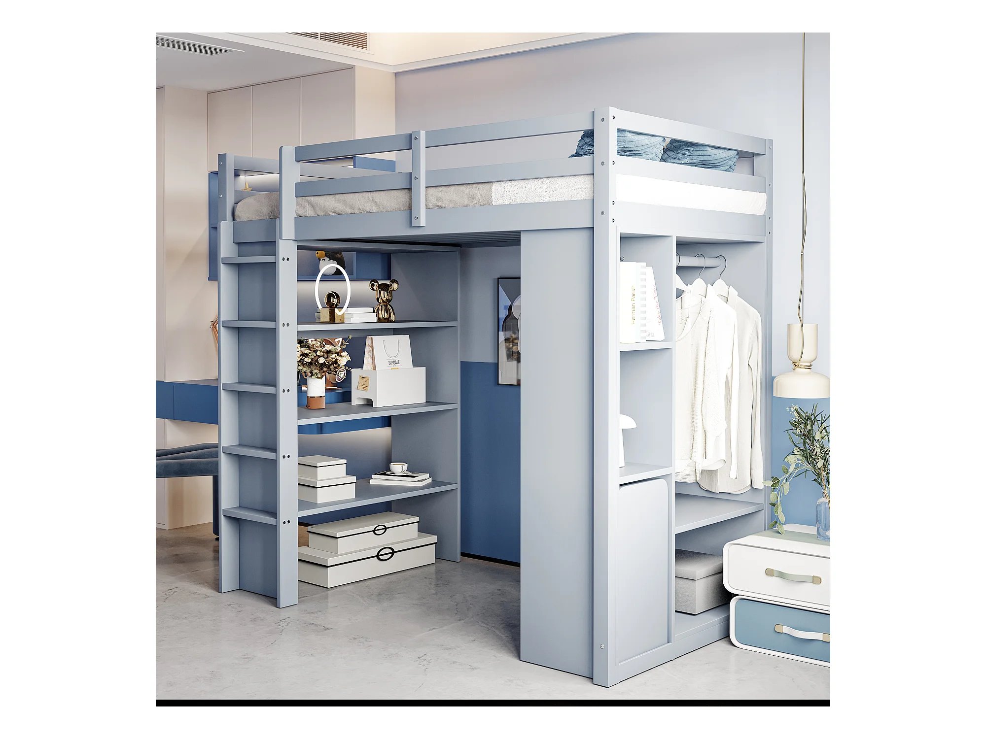 90x200cm mezzanine bed, stapelbed met kledingkast, planken en opbergruimte met planken en opbergruimte, bovenste anti-val rooster, grijs