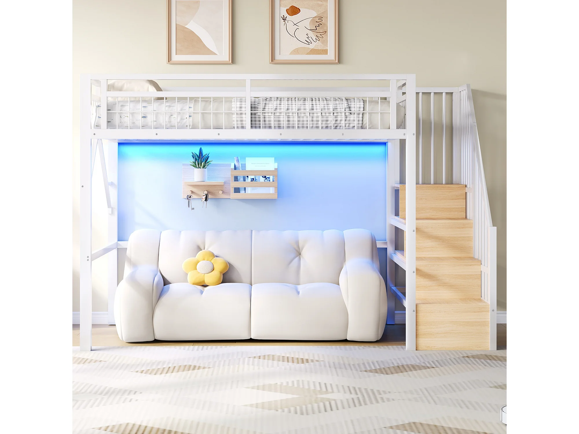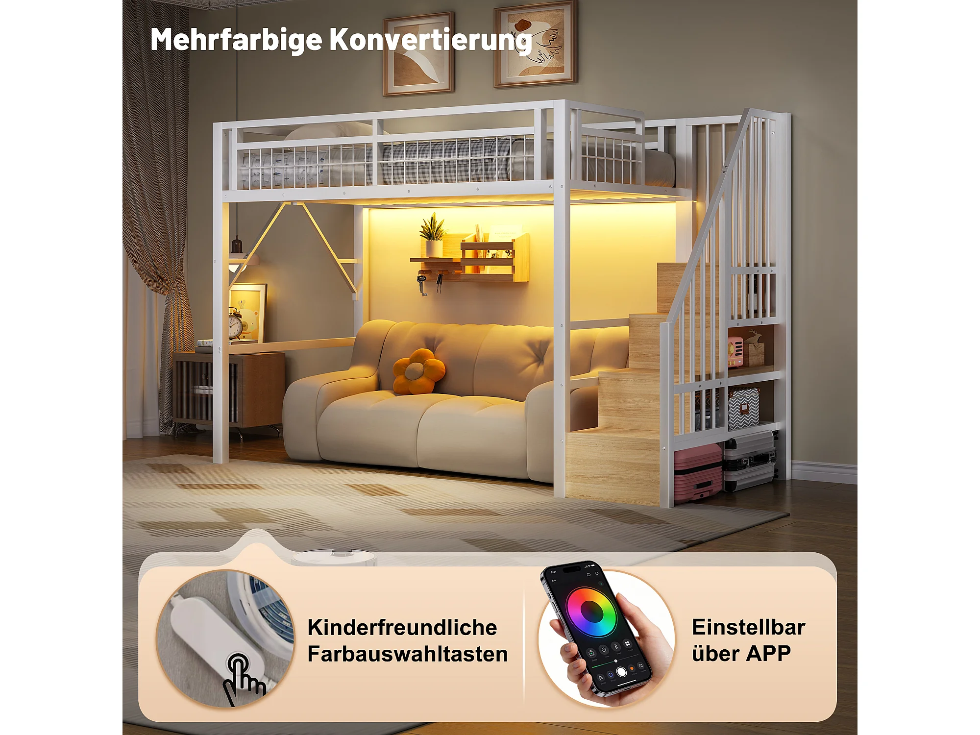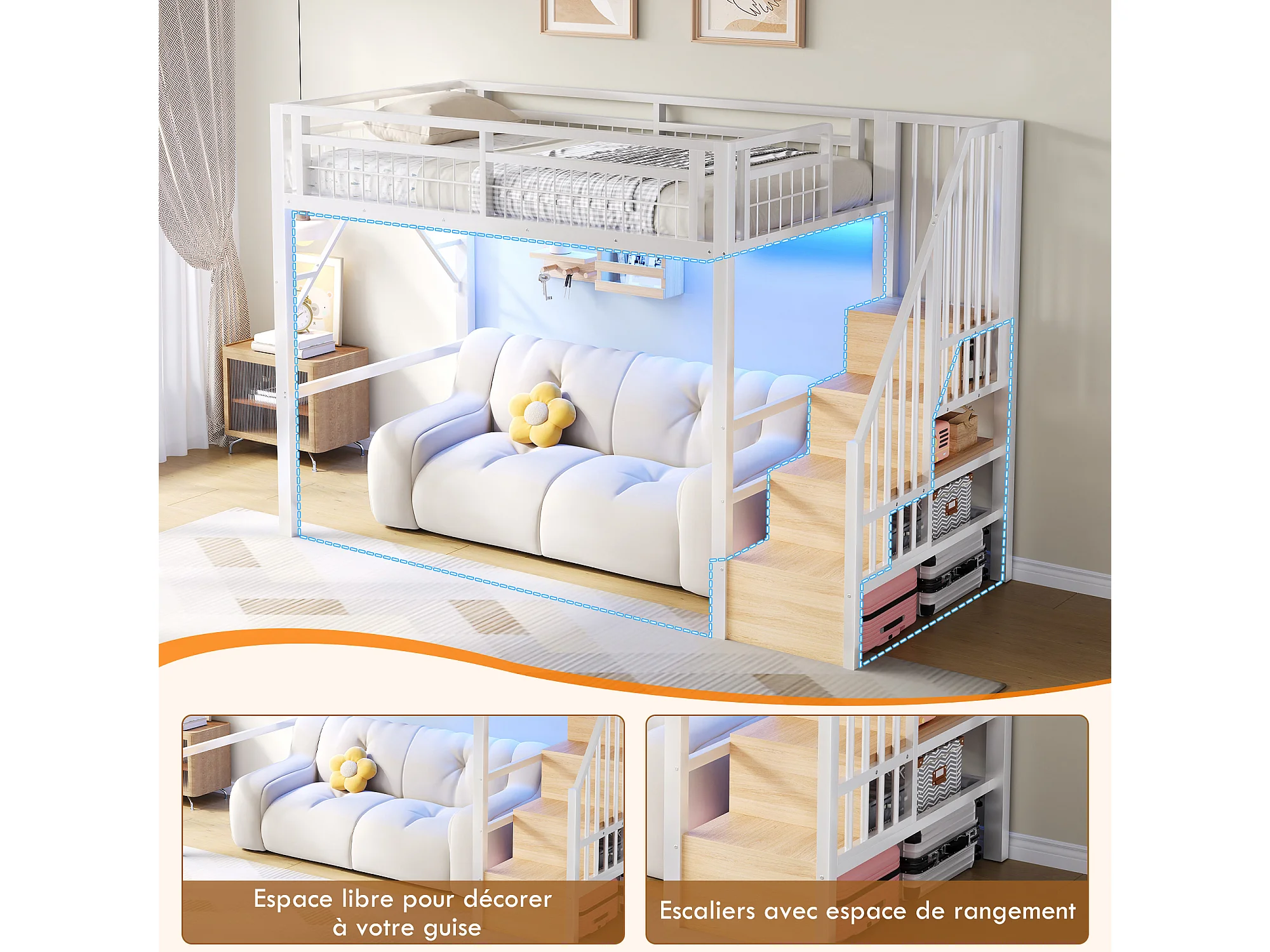 Kinderhoogslaper - 90 x 200 cm - ijzeren frame - met LED-verlichting + opbergladder - metaal - wit