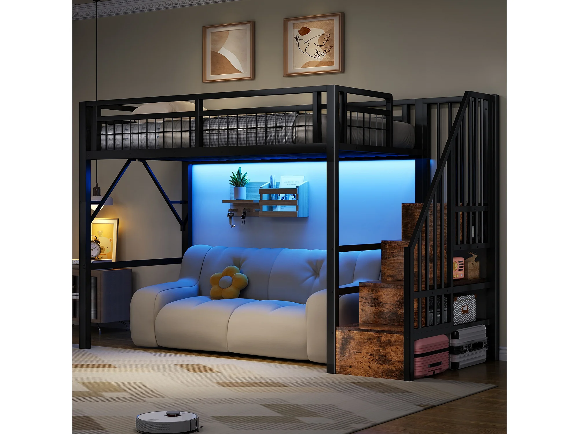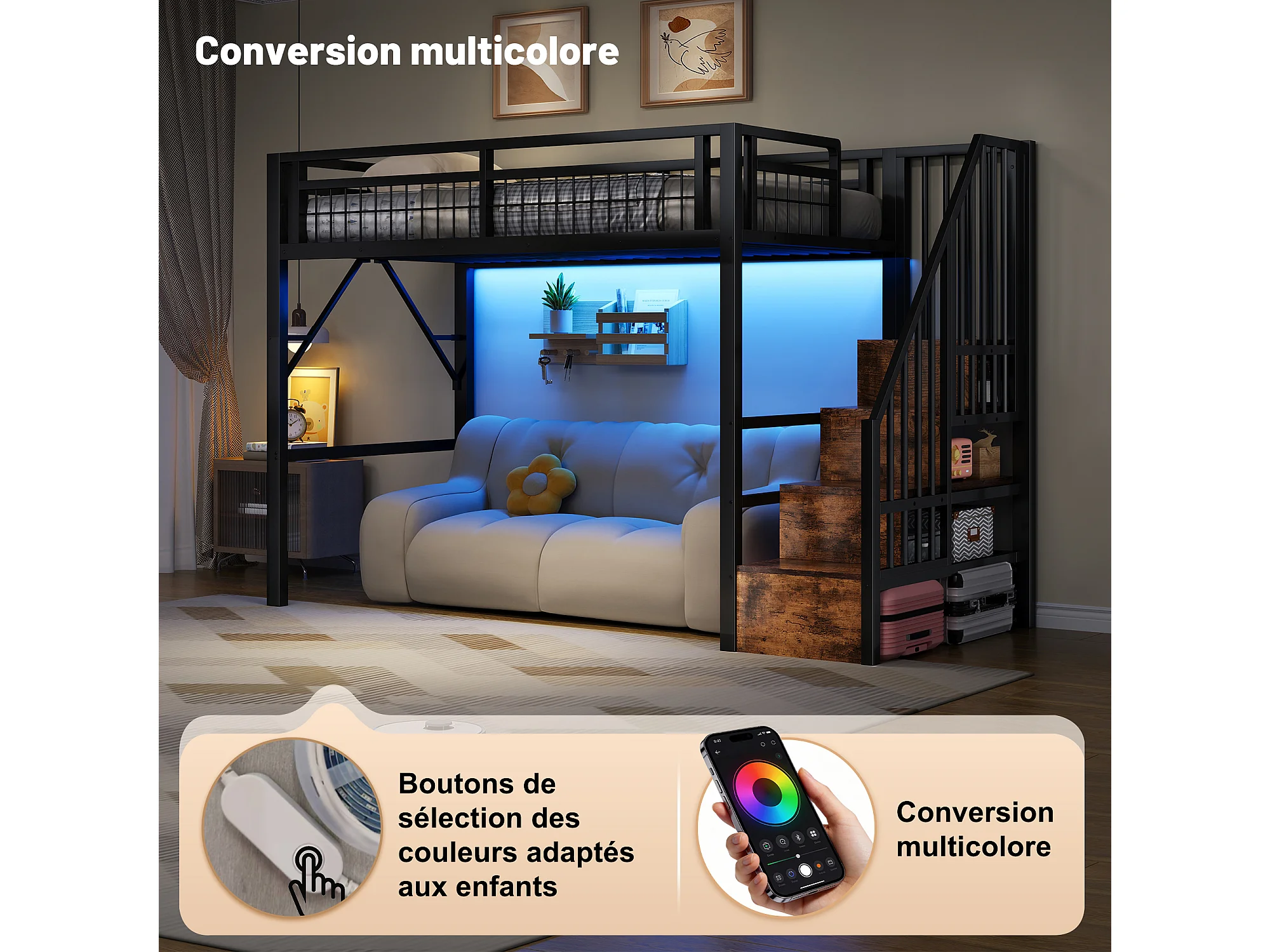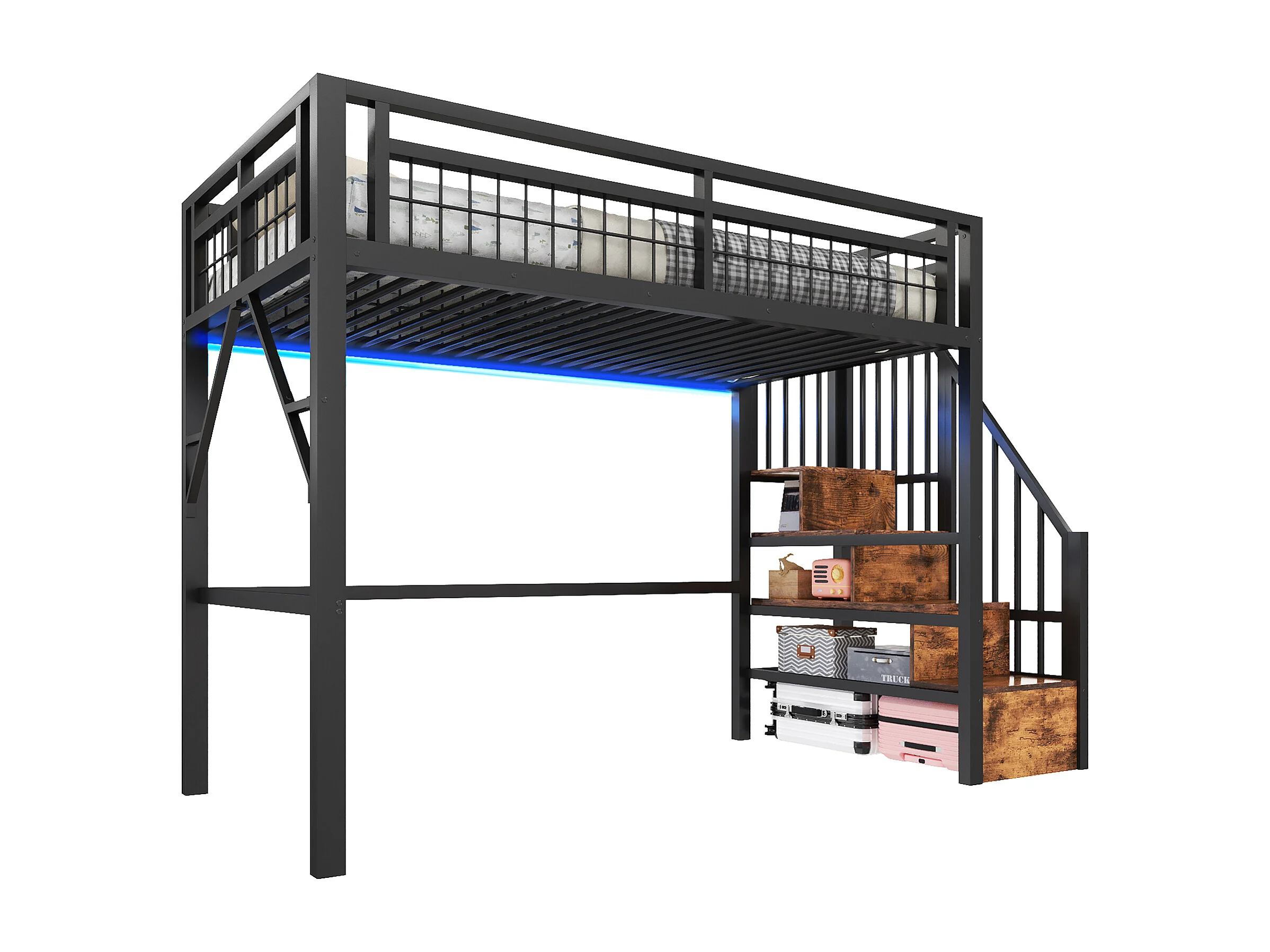 Kinderhoogslaper - 90 x 200 cm - ijzeren frame - met LED-verlichting + opbergladder - metaal - zwart