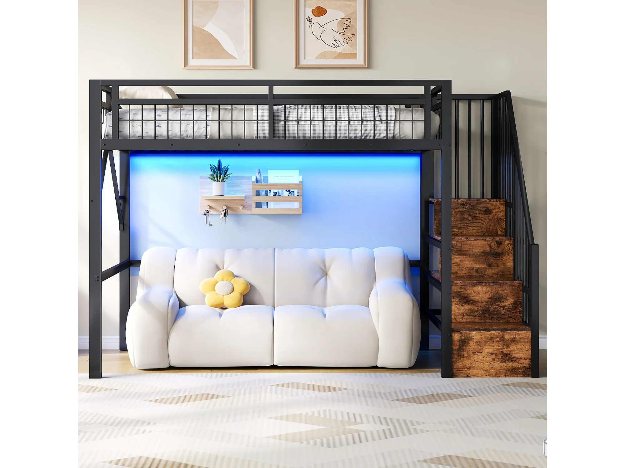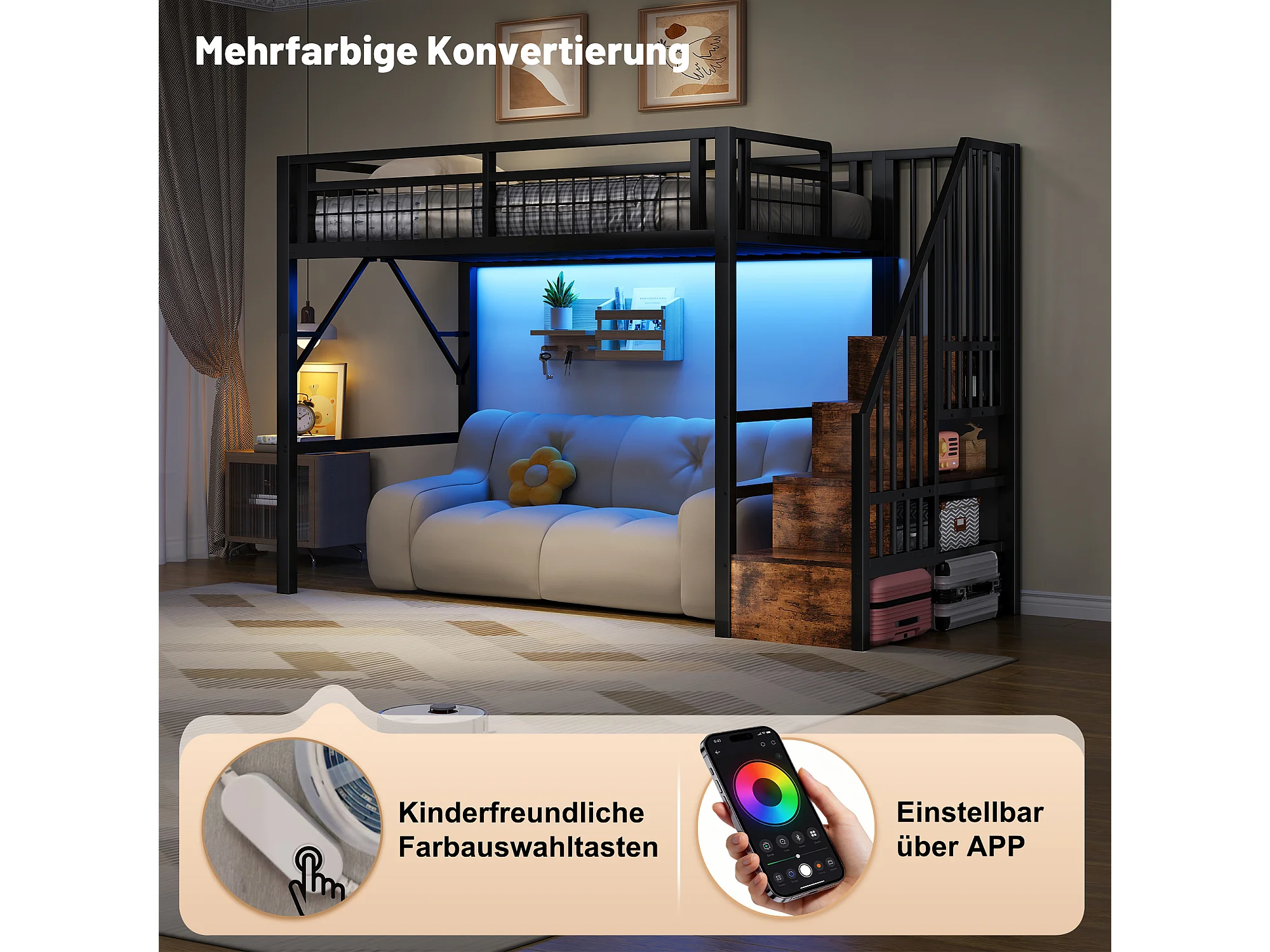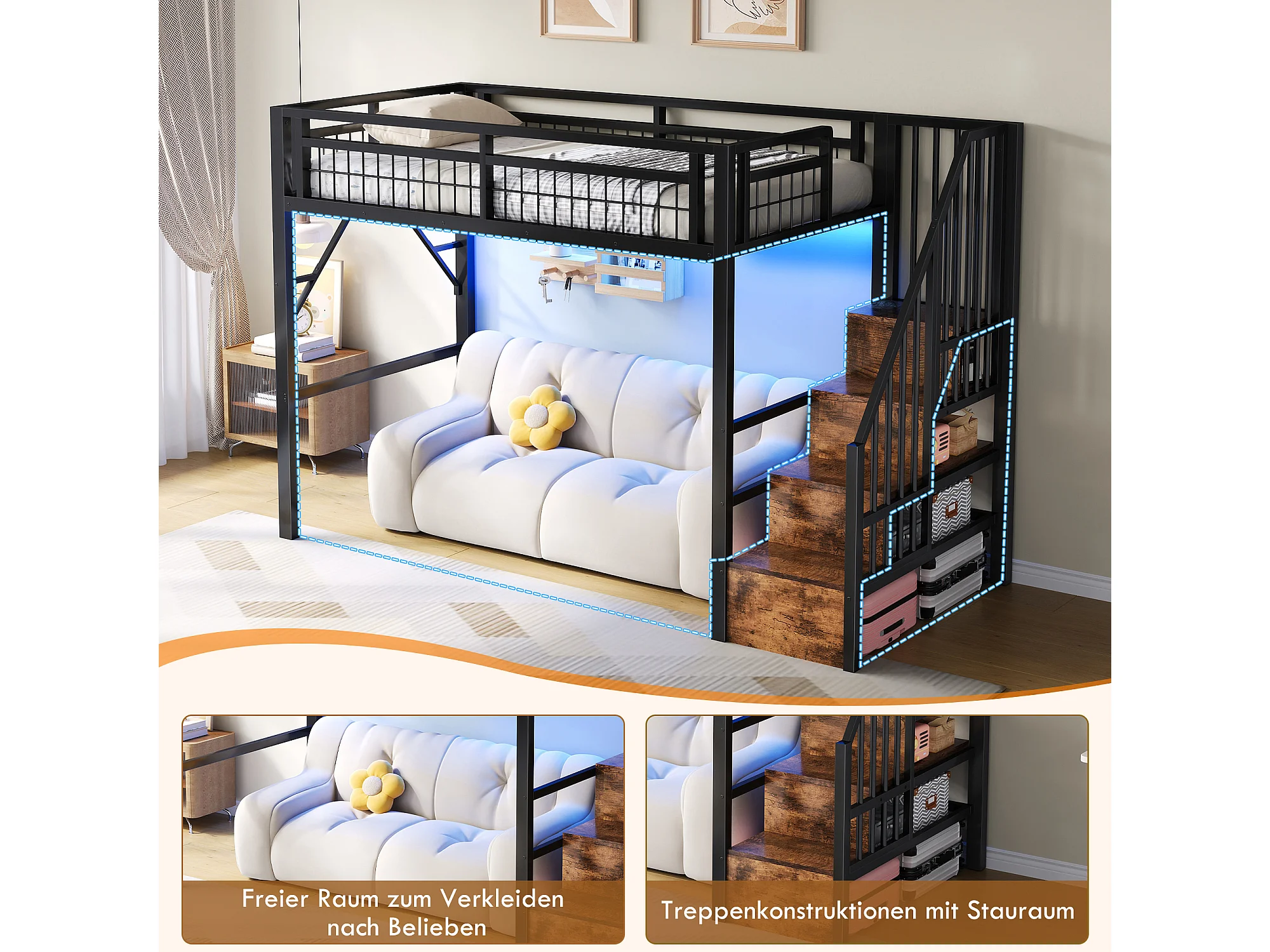 Kinderhoogslaper - 90 x 200 cm - ijzeren frame - met LED-verlichting + opbergladder - metaal - zwart