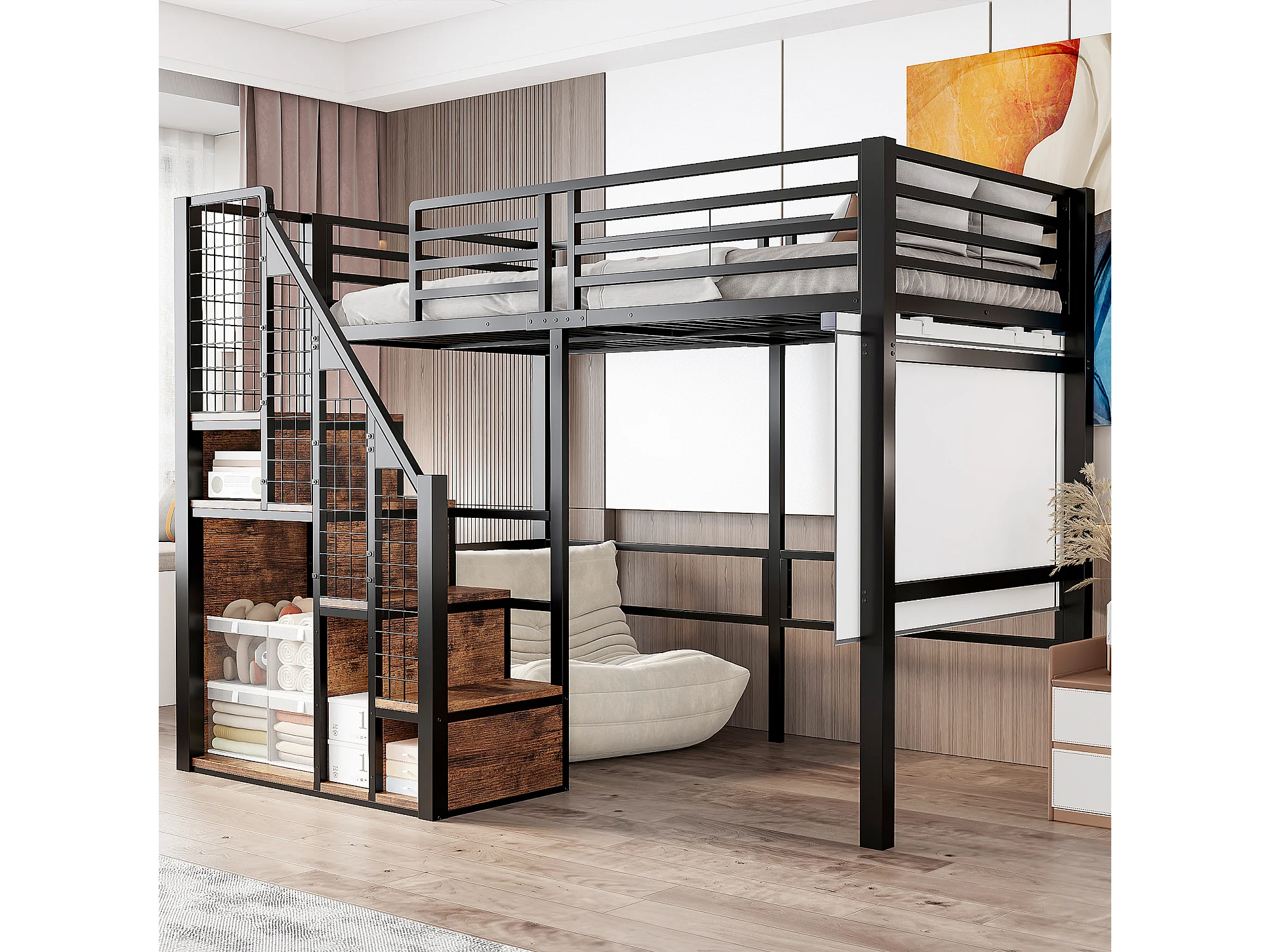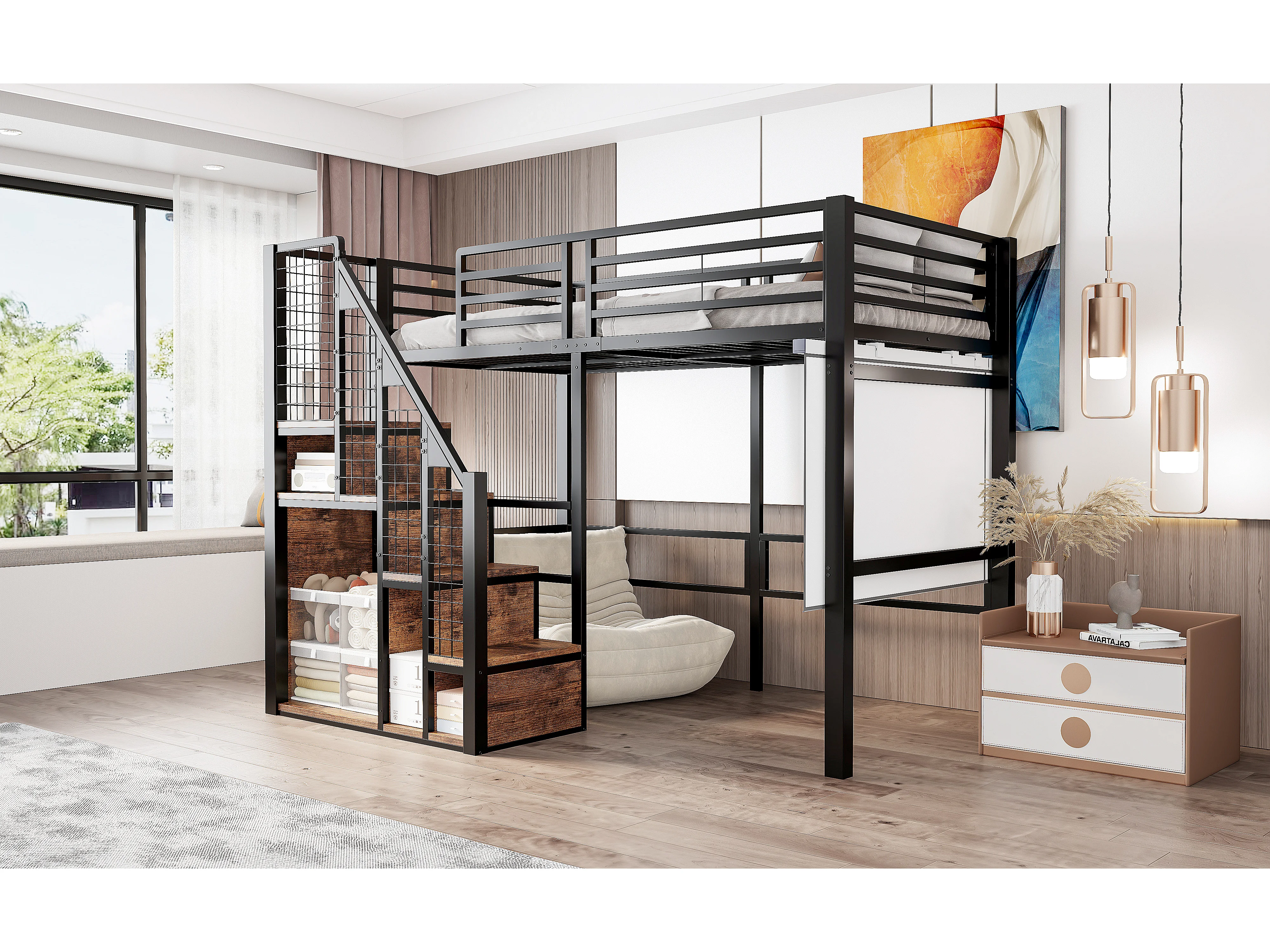 Kinderhoogslaper - 90 x 200 cm - ijzeren frame - met opbergruimte en veiligheidstrap - metaal - zwart