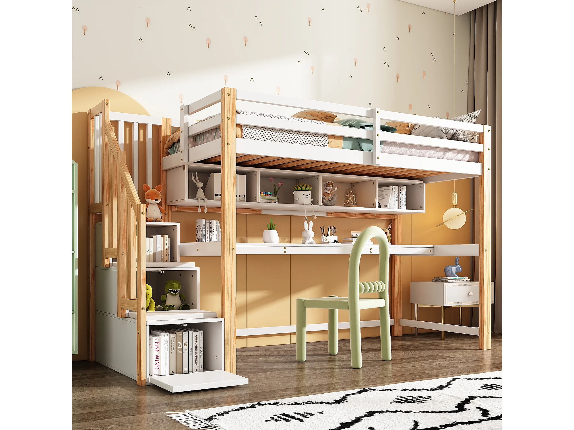 Kinderhoogslaper 90x200 cm met bureau, planken en opbergladder - Licht naturel en wit