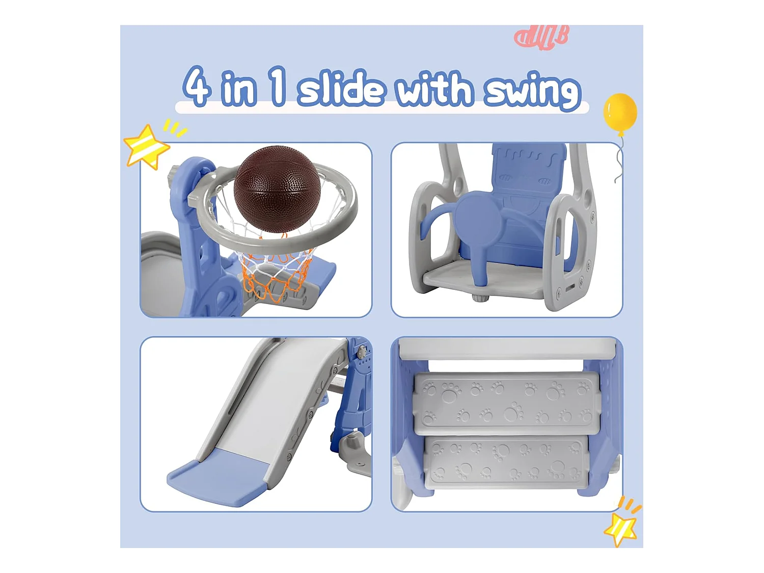 Kinderschommelset met glijbaan, ladder en schommel met basketbalring - 4 in 1 speeltuin - binnen- en buitengebruik - Blauw