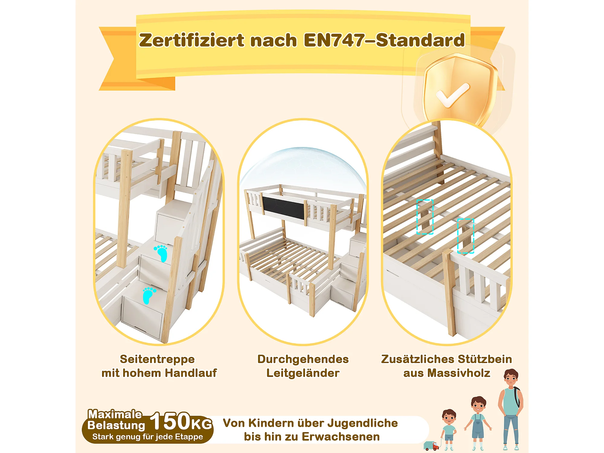 Kinderstapelbed - 90 x 200 cm + 140 x 200 cm - met opbergladder + 2 lades + schilderij - hout + metaal - wit + naturel