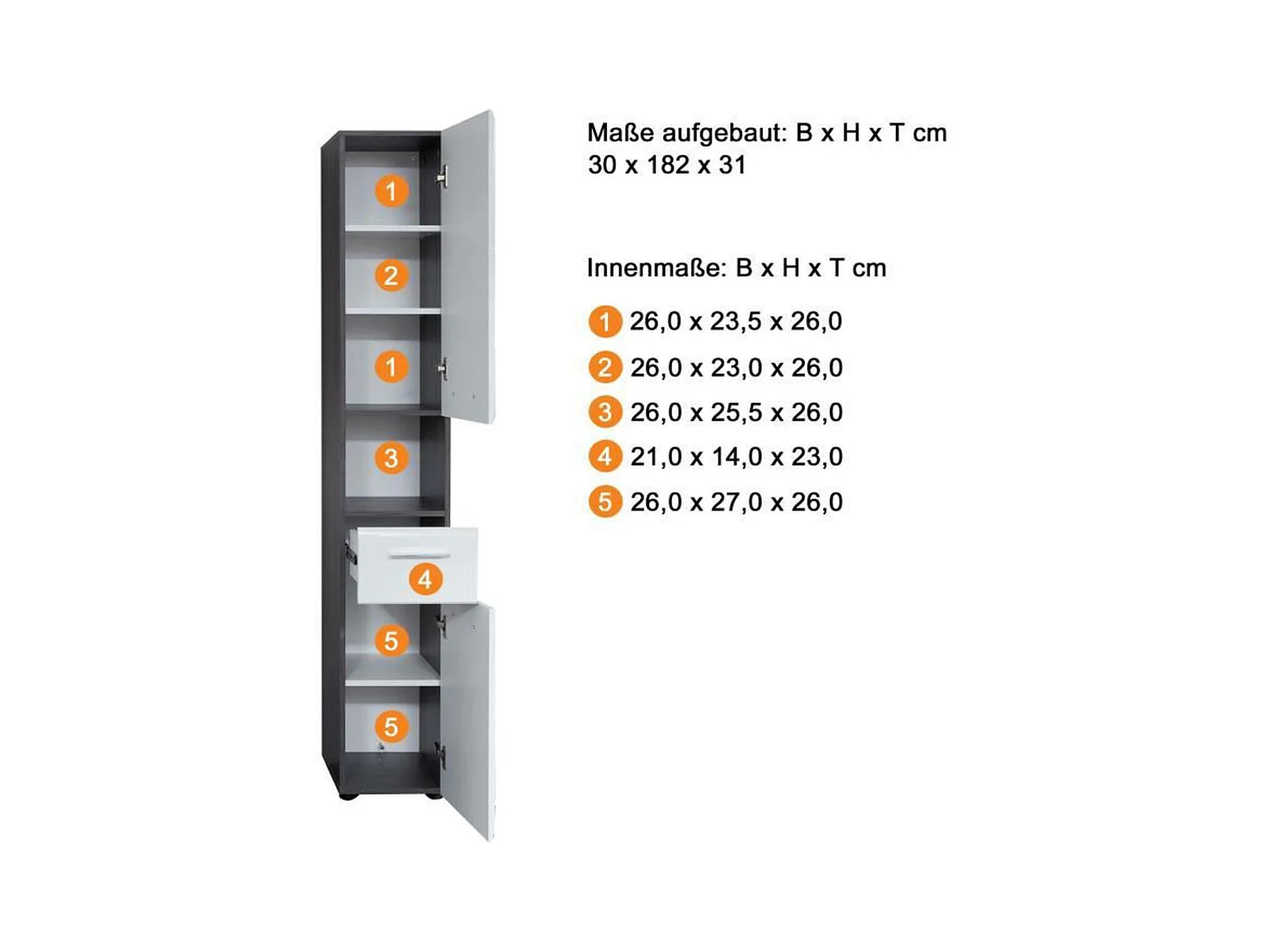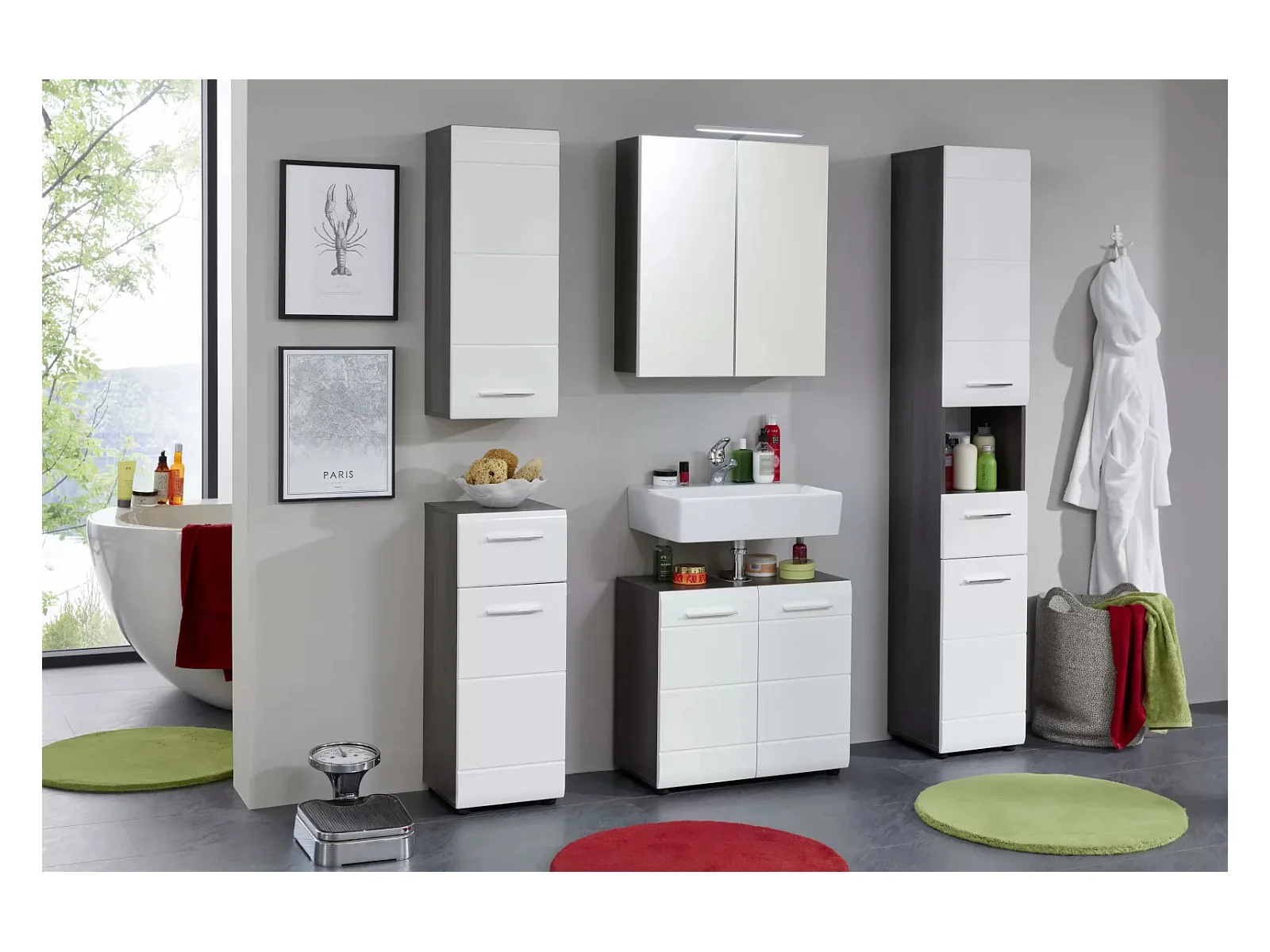 Kinzo glanzend wit en asgrijs badkamerkolomkast 2 deuren 1 lade 30 cm