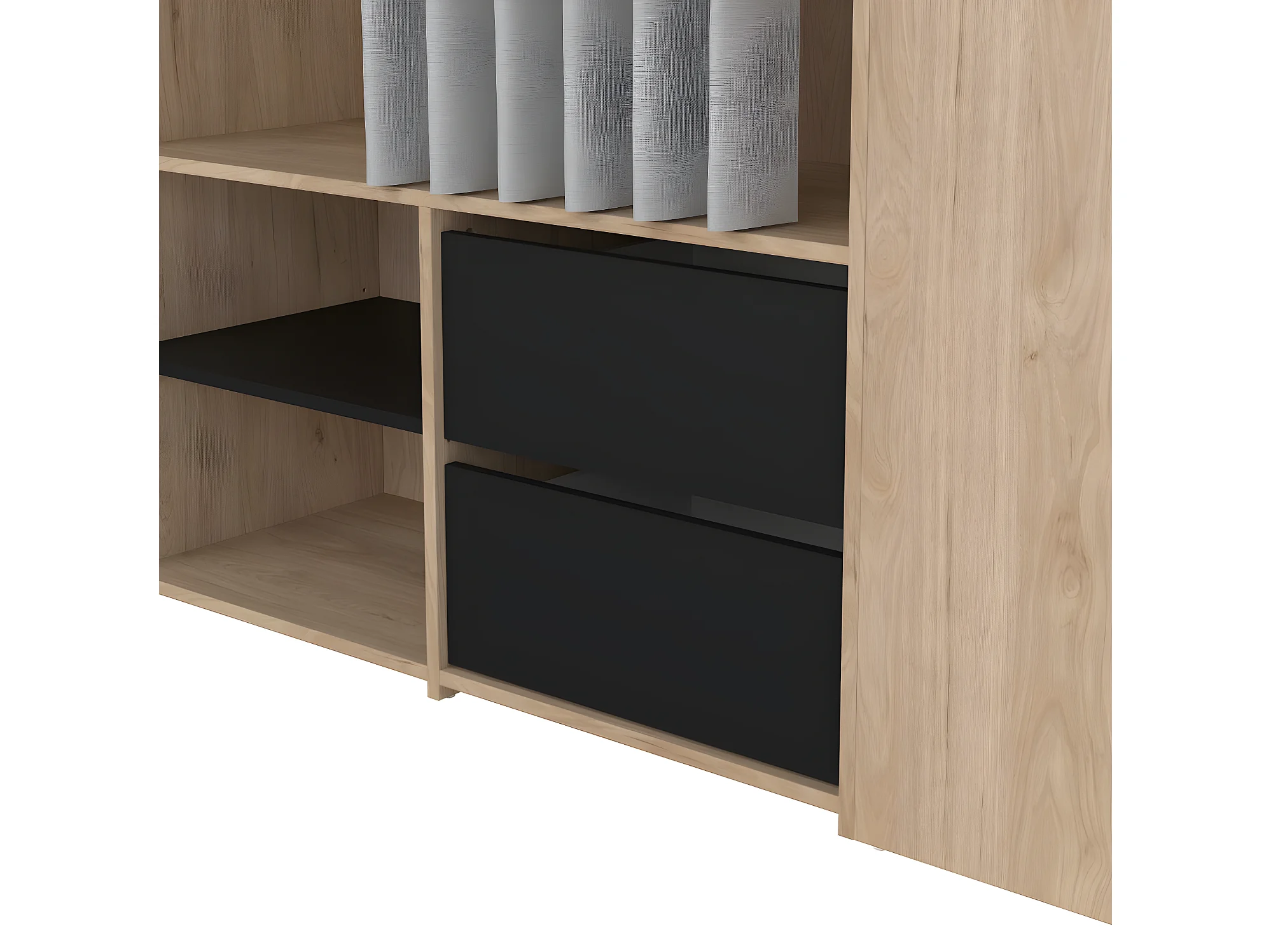 Kit kledingkast open, met gordijn, 2 lades, schoenenkast okkernoot decor zwart mat gordijn lichtgrijs.