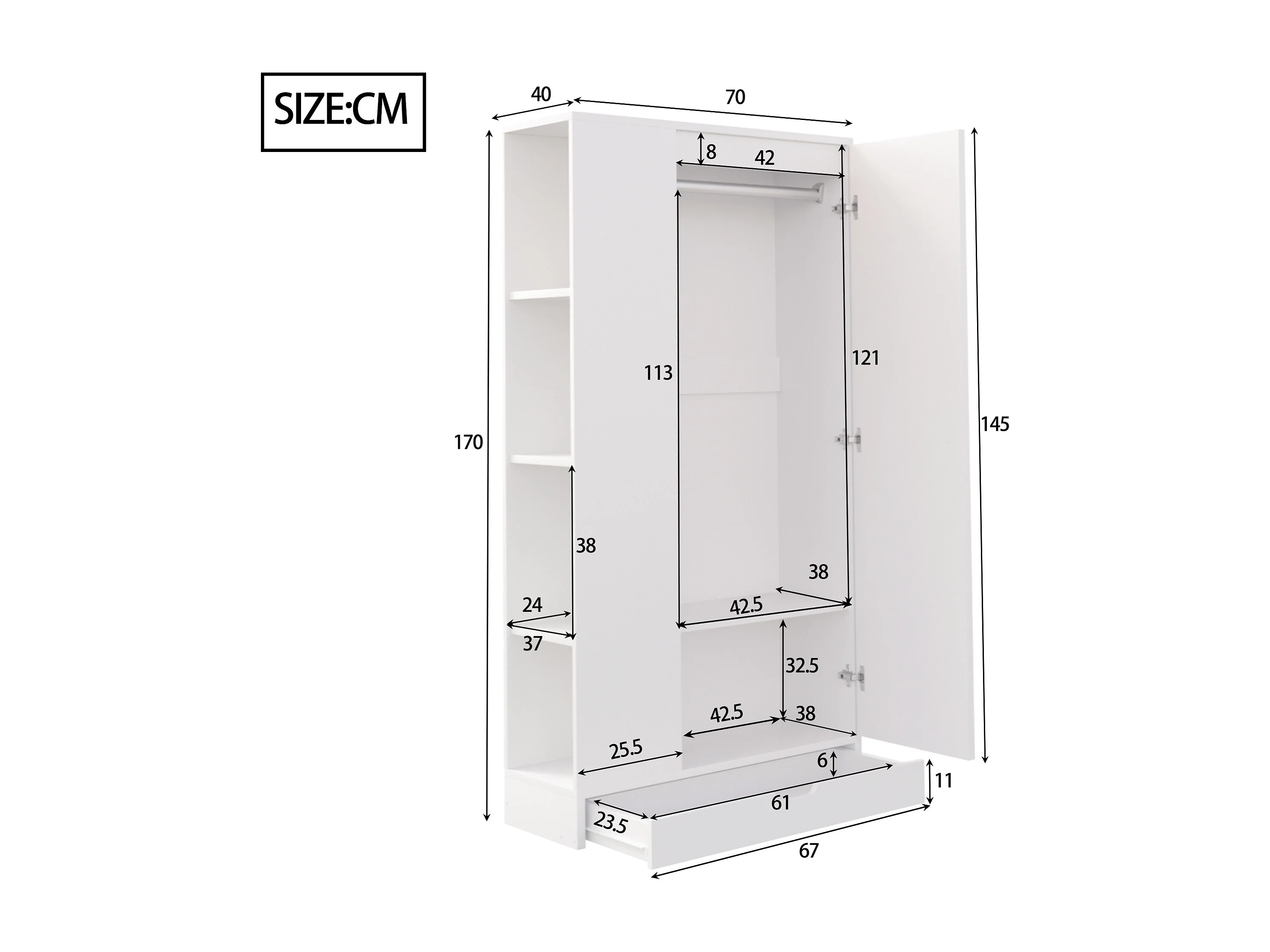 Kledingkast 70x40x170 cm met verstelbare planken en lades in wit voor slaapkamer en kleedkamer