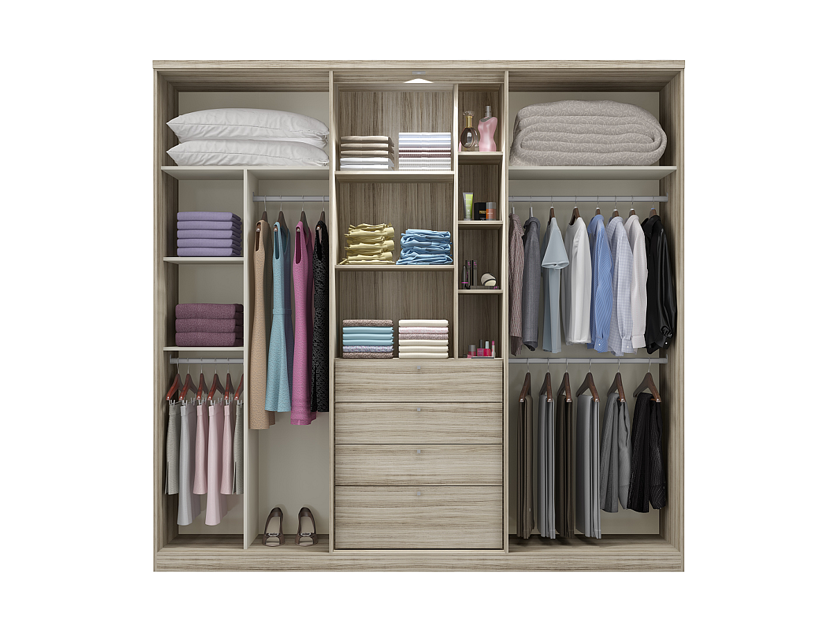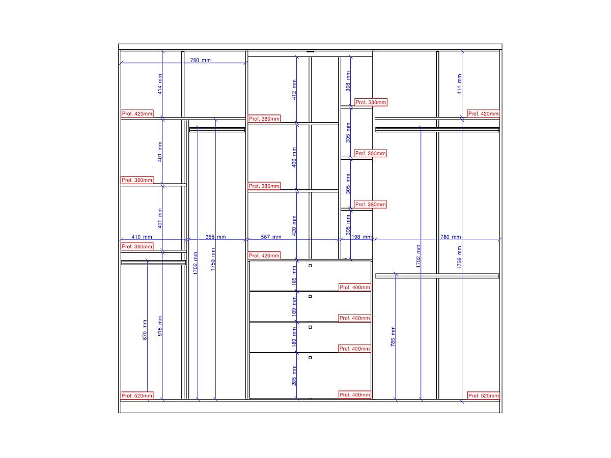 - Interieur: 4 kleerkasten, 11 legplanken, 4 laden