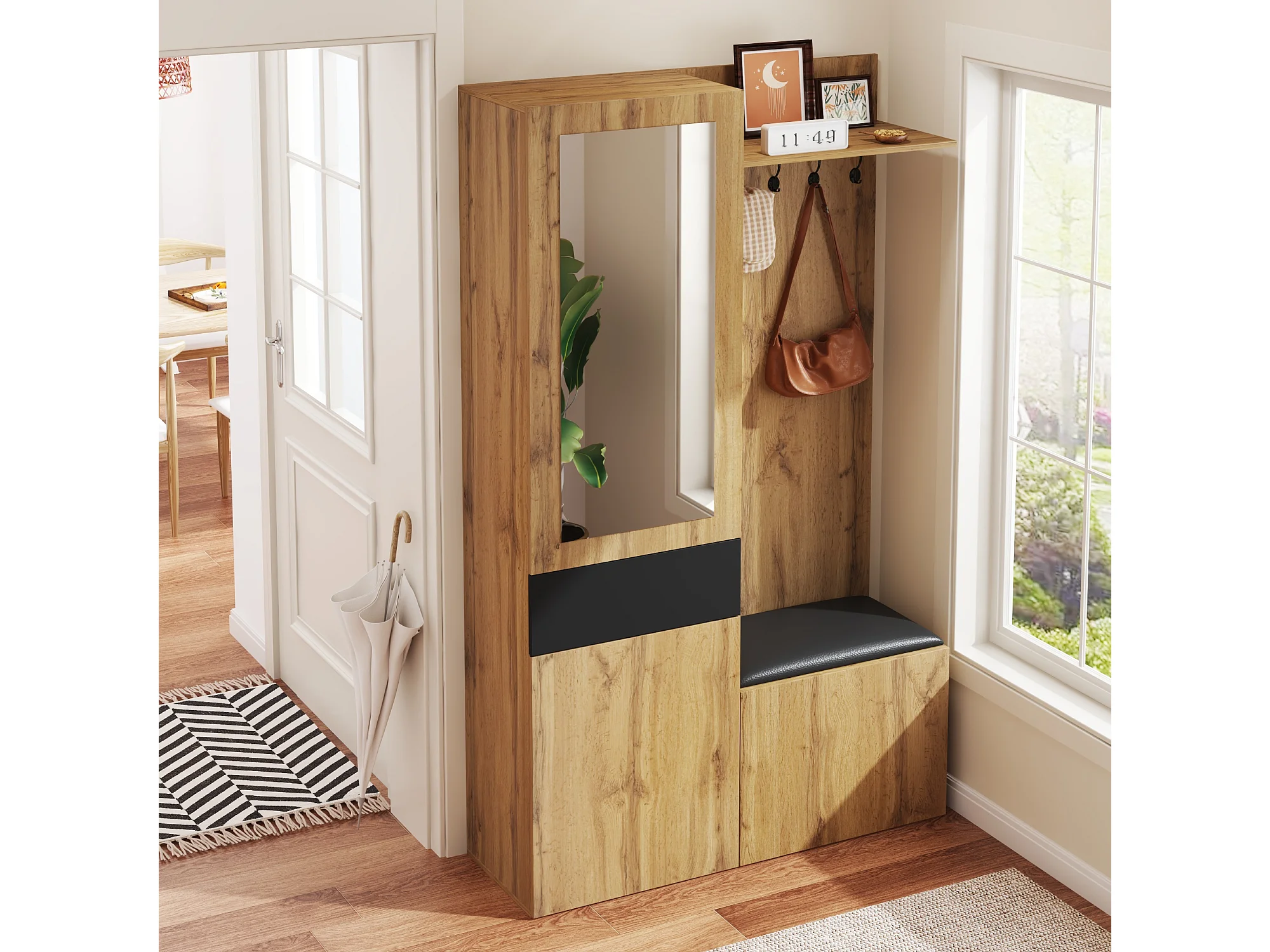 Kledingkastset met 5 haken, spiegel, schoenenrek en bank, MDF, zwart en naturel (98,5x38x191cm)