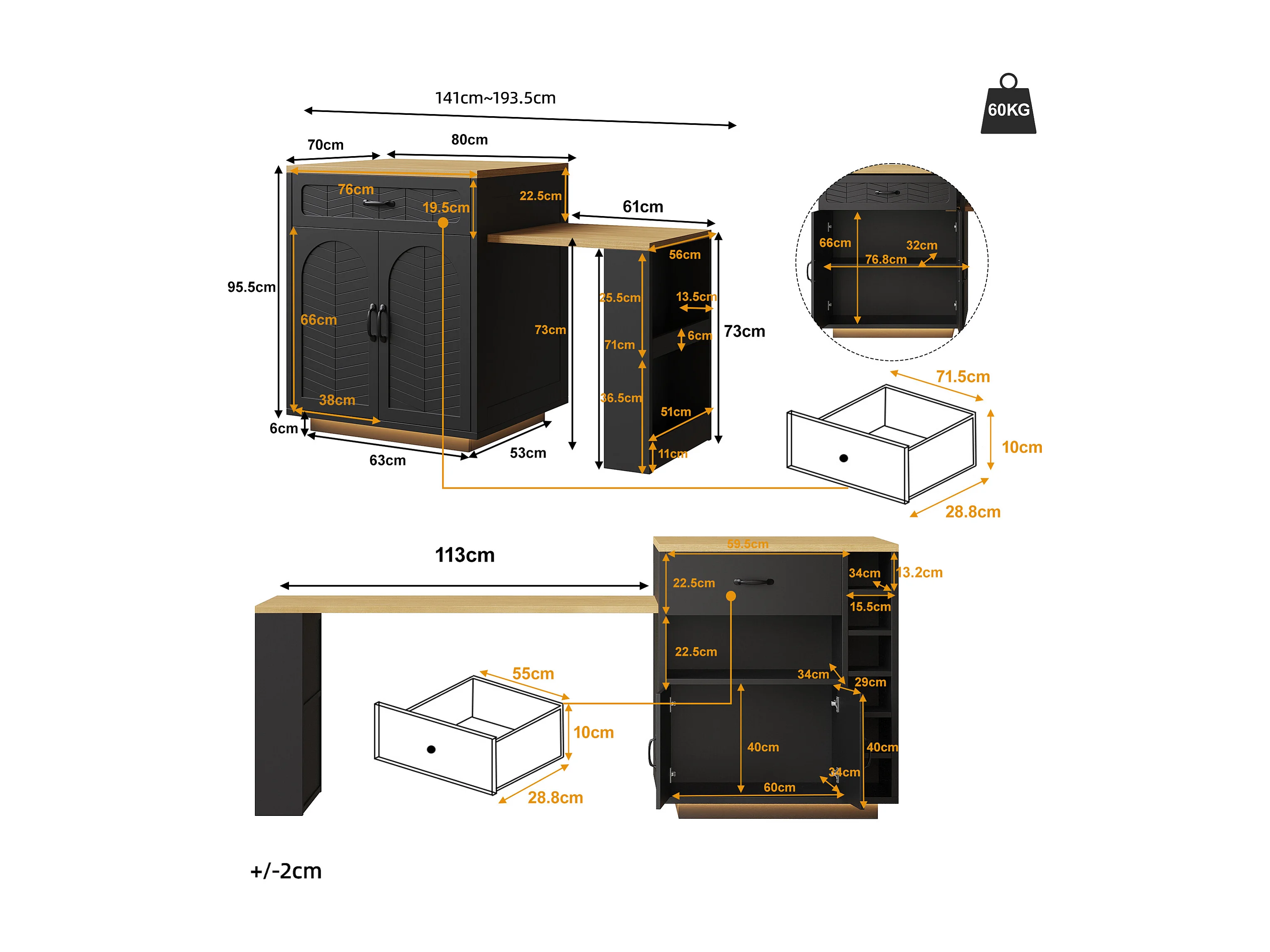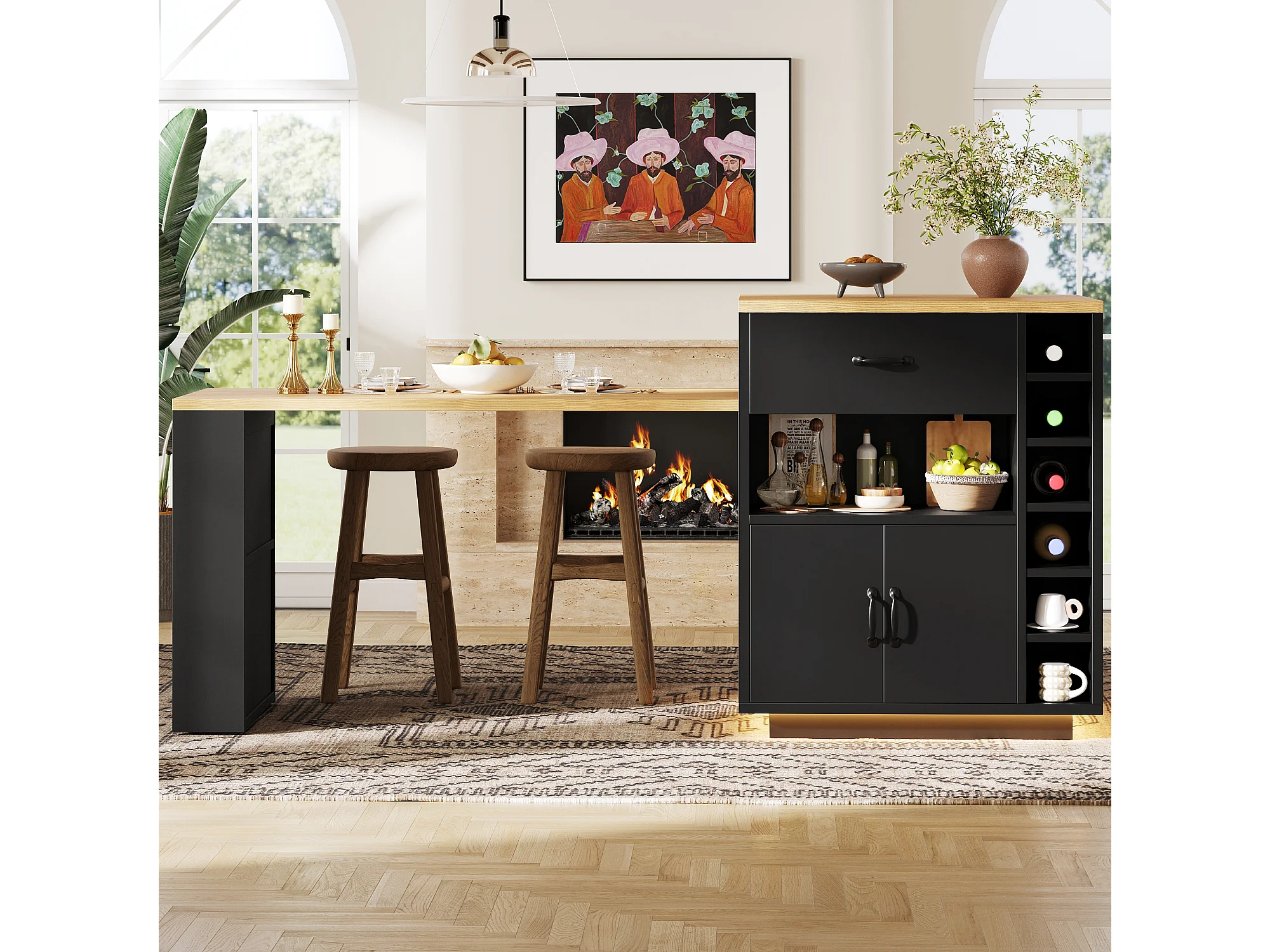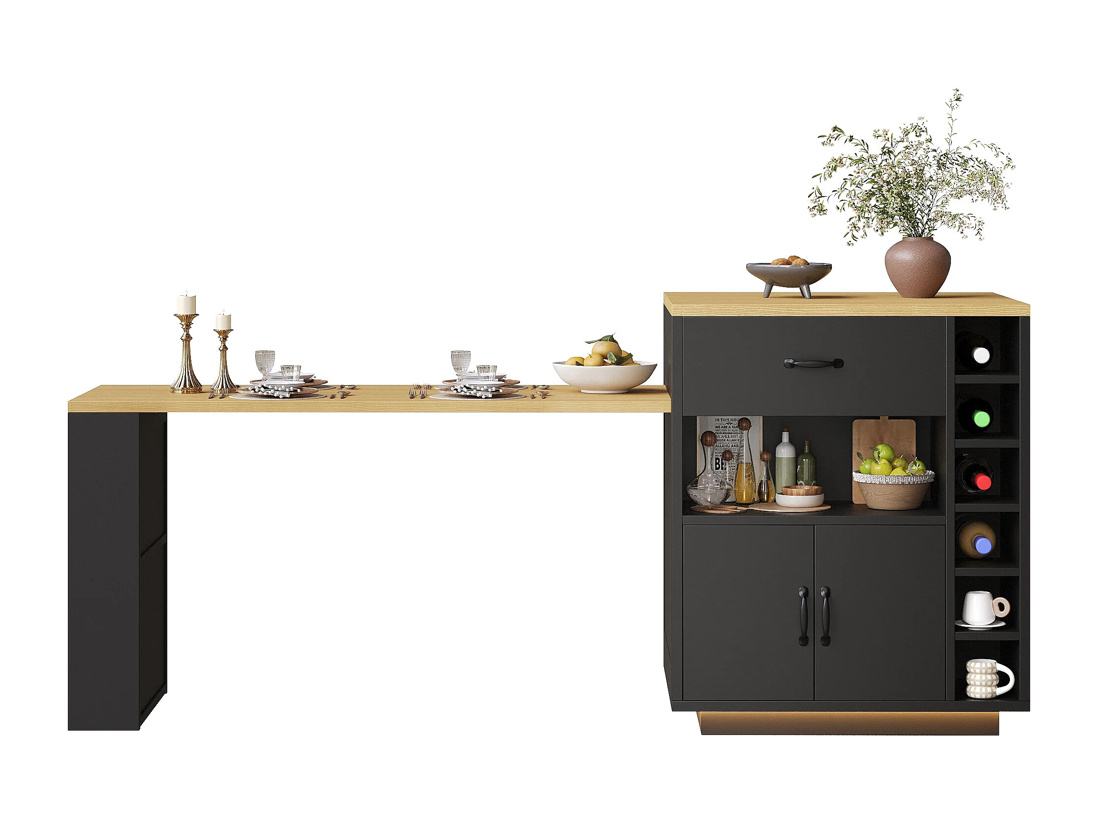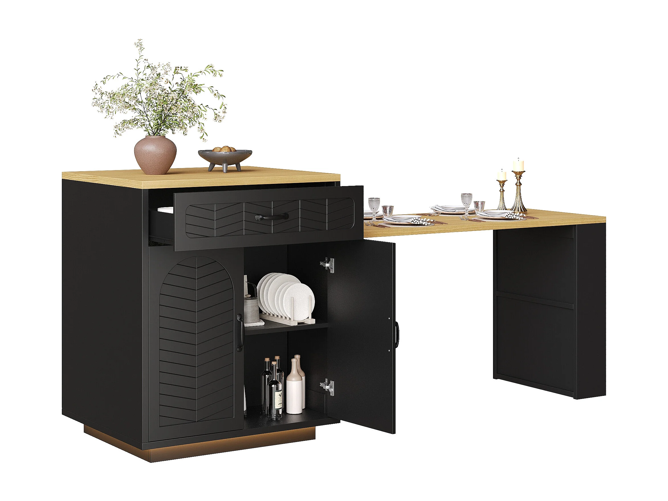 Kookeiland - uitschuifbare eettafel - met LED-verlichting - met 2 lades en 4 deuren - Zwart