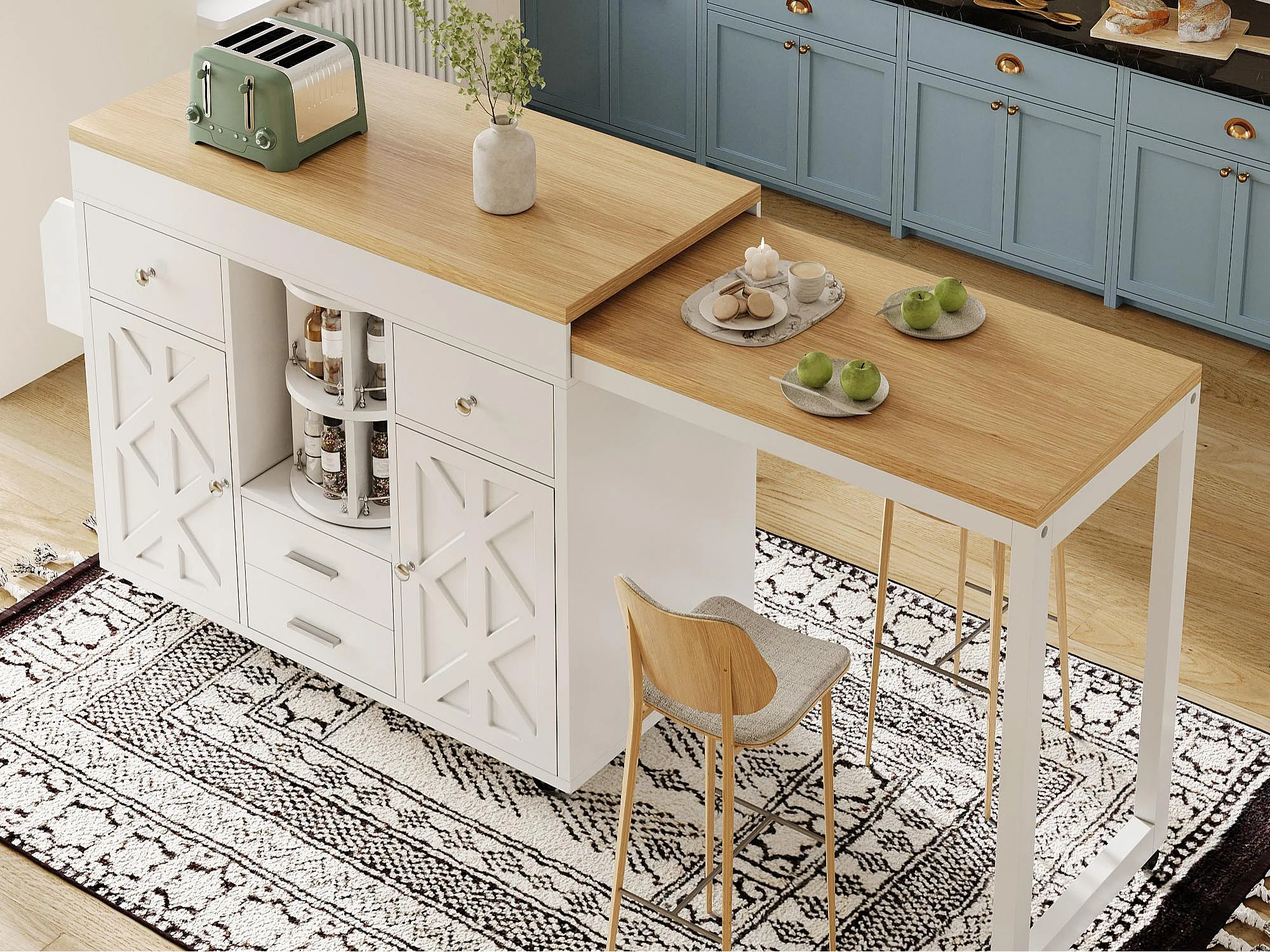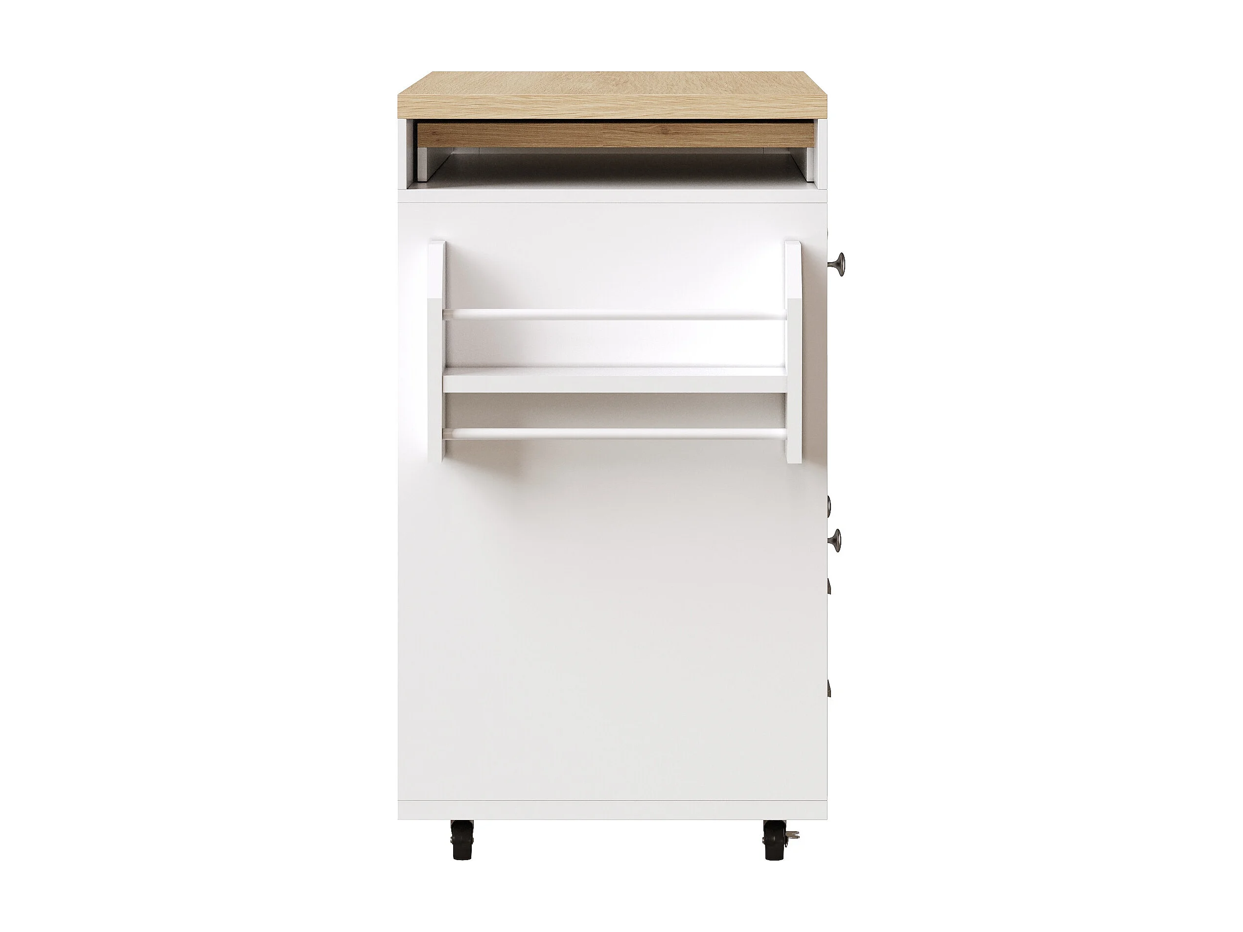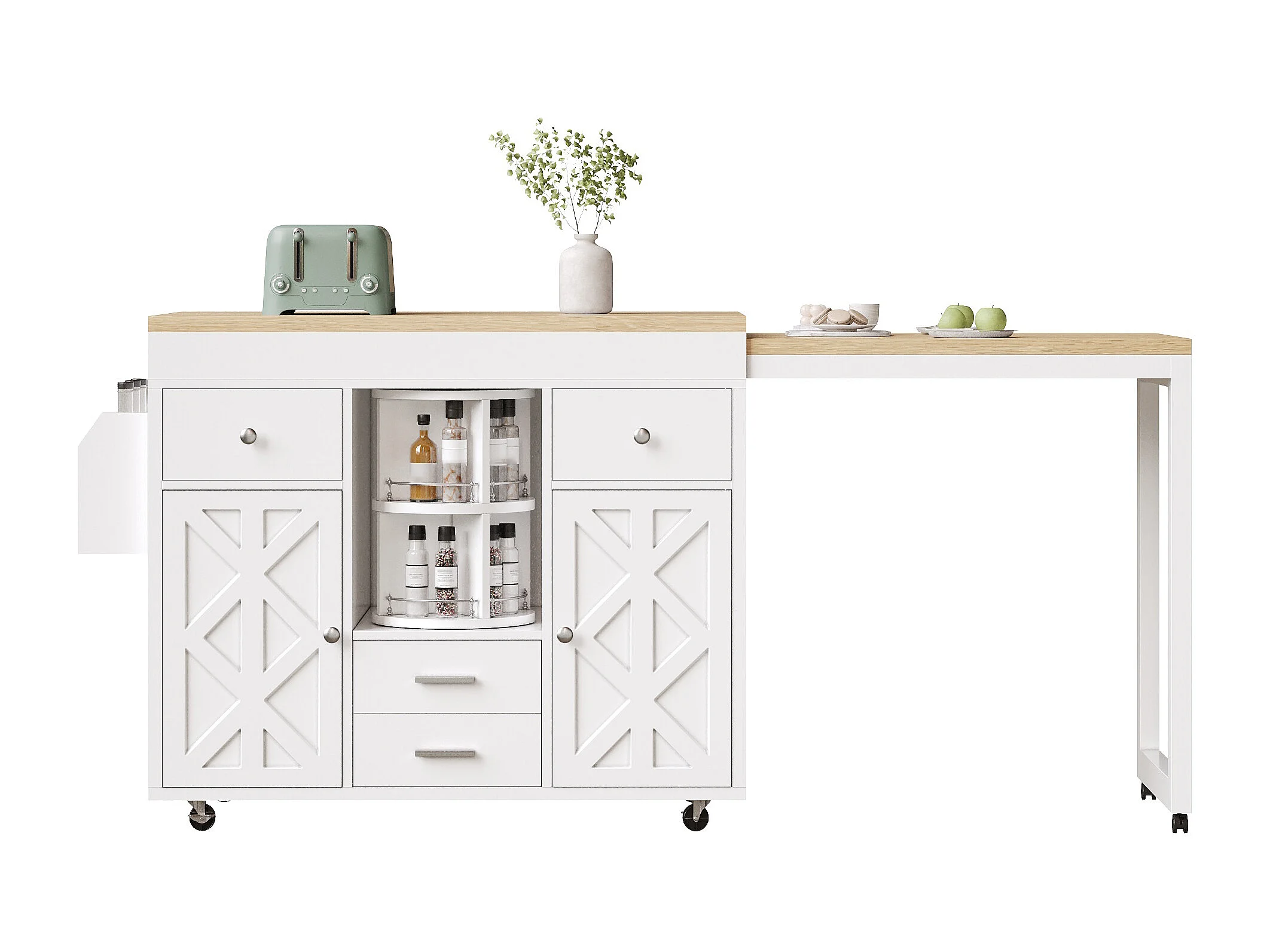 Kookeiland - uitschuifbare eettafel - met wieltjes en handdoekhouder - verstelbare planken - Wit