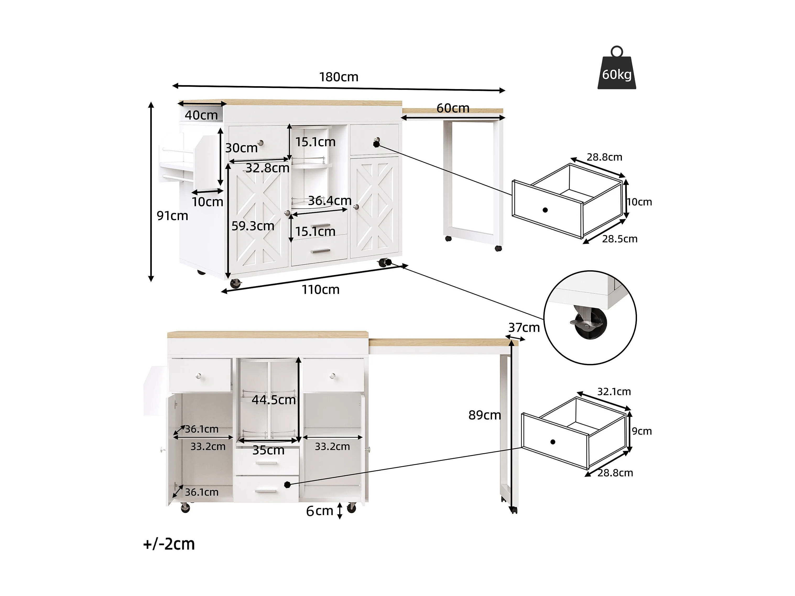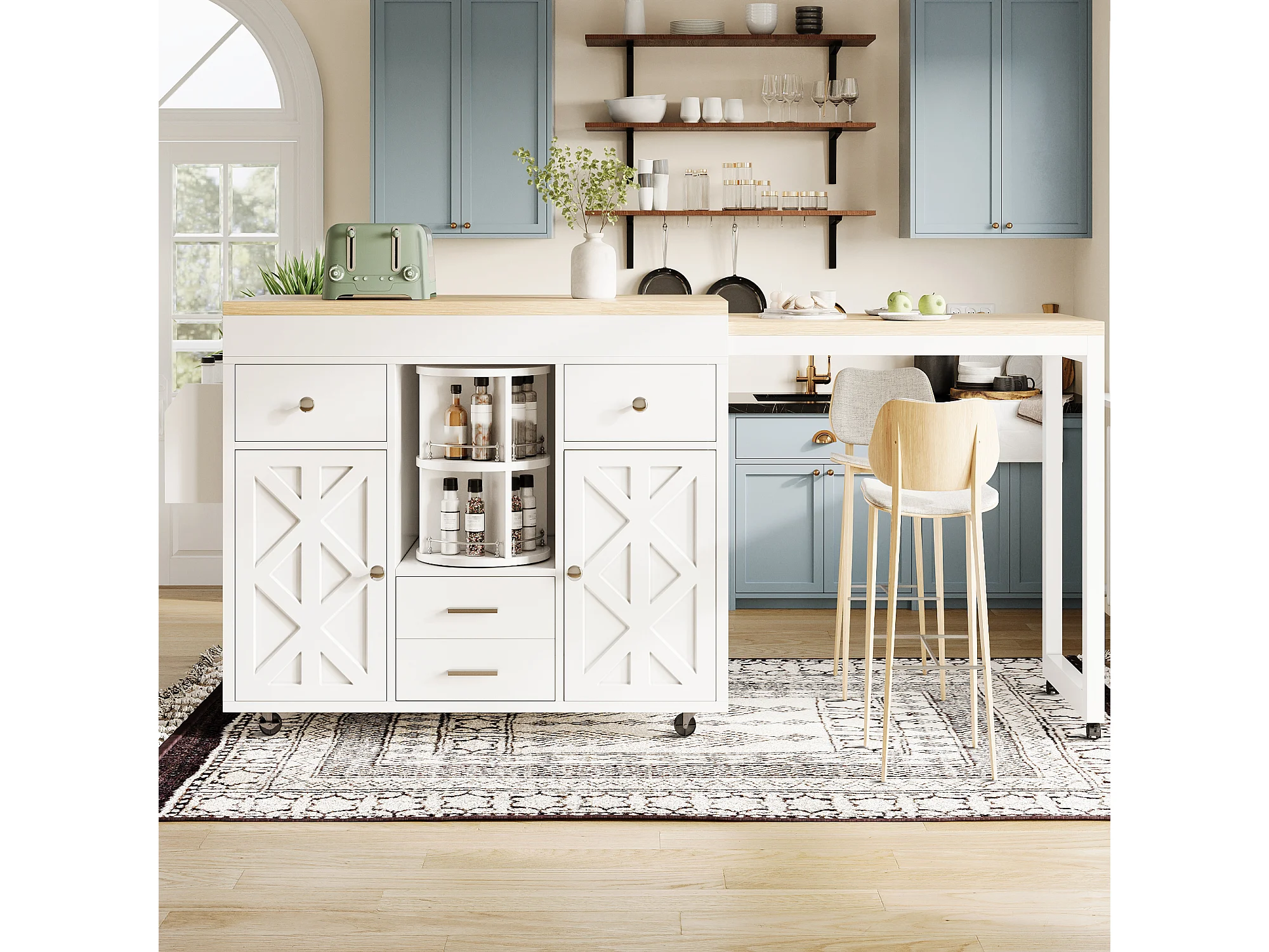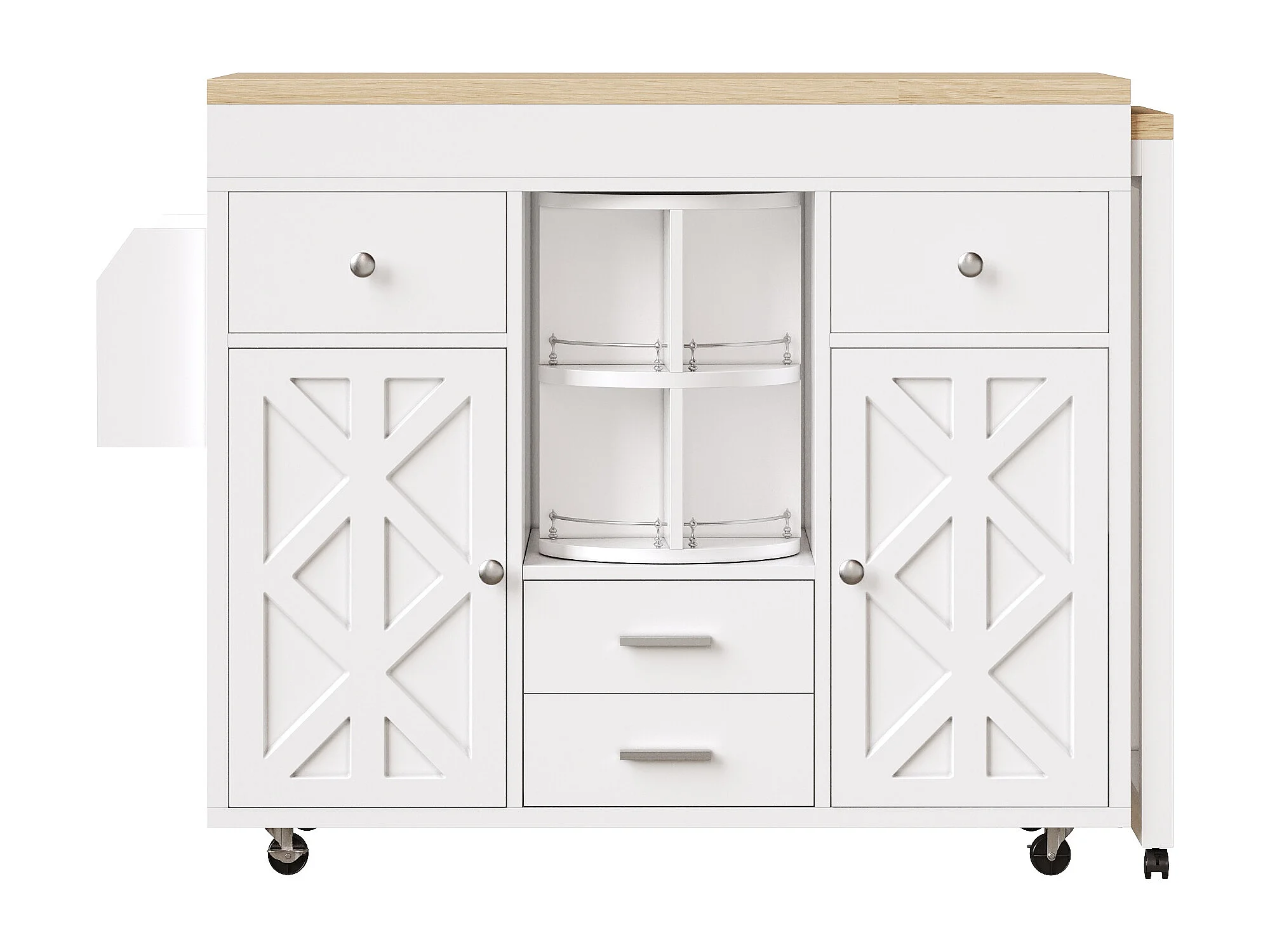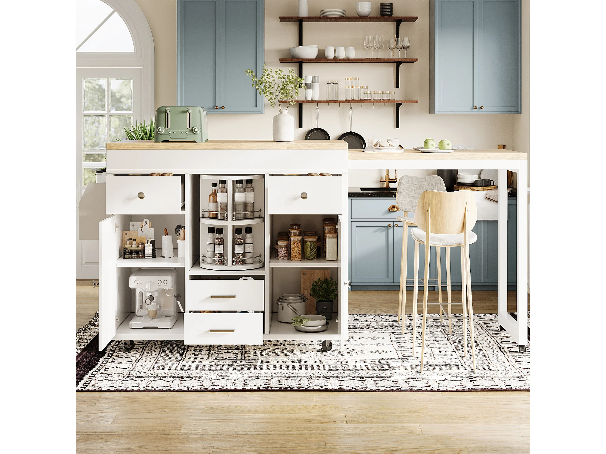 Kookeiland - uitschuifbare eettafel - met wieltjes en handdoekhouder - verstelbare planken - Wit
