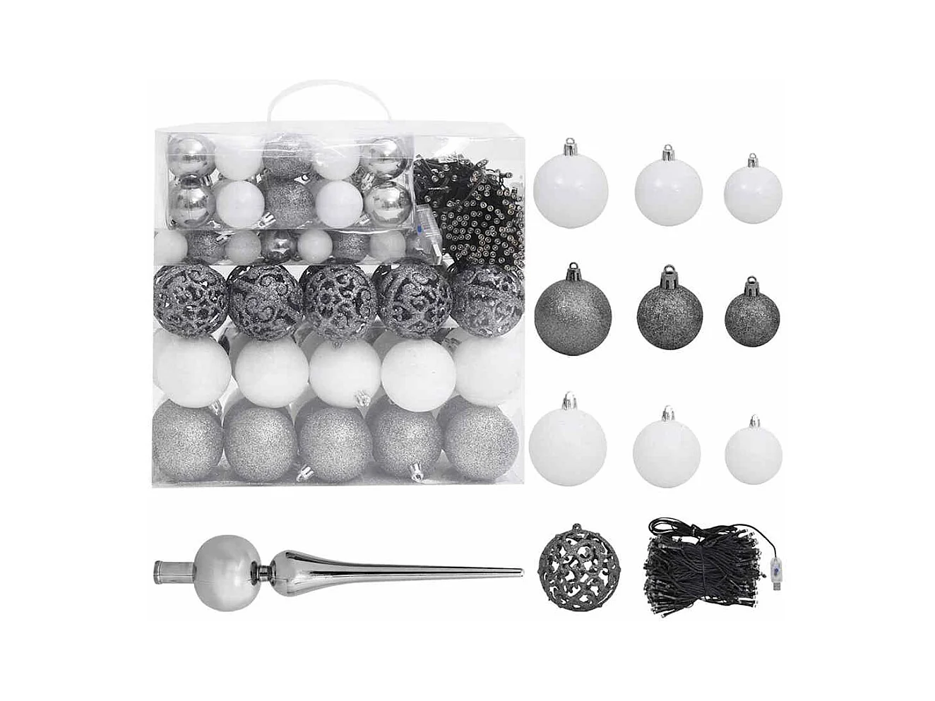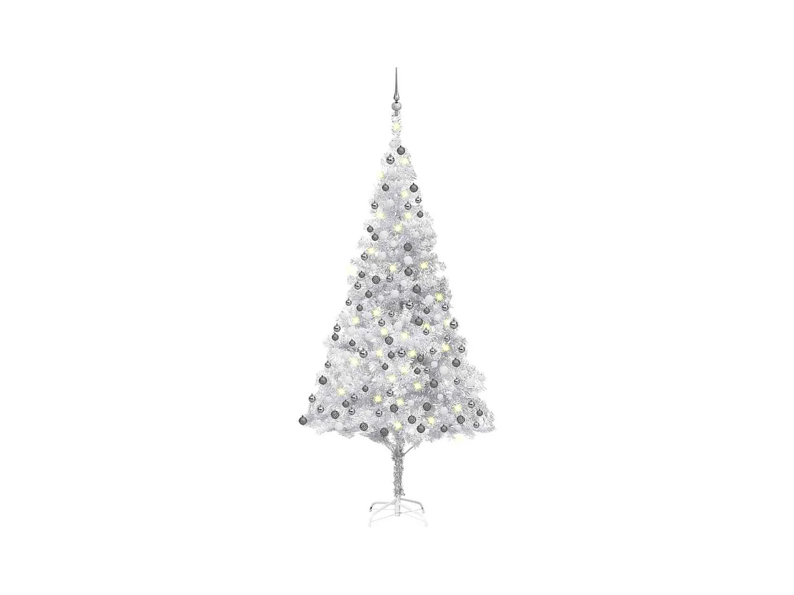 Kunstkerstboom met verlichting en kerstballen 210 cm PET zilver