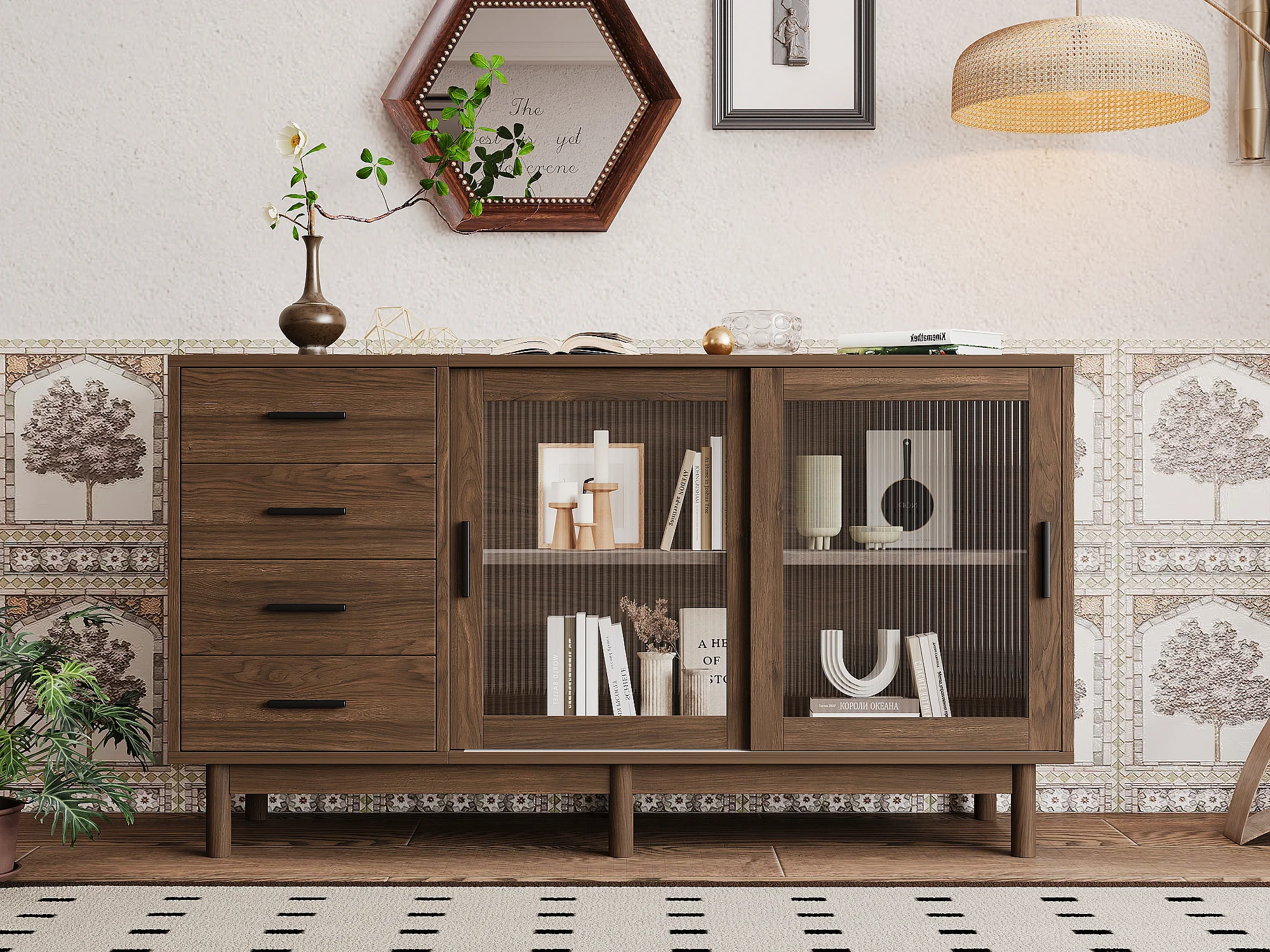 Laag dressoir 4 lades 2 glazen deuren - 140 x 40 x 75,8 cm - Spaanplaat - Bruine kleur