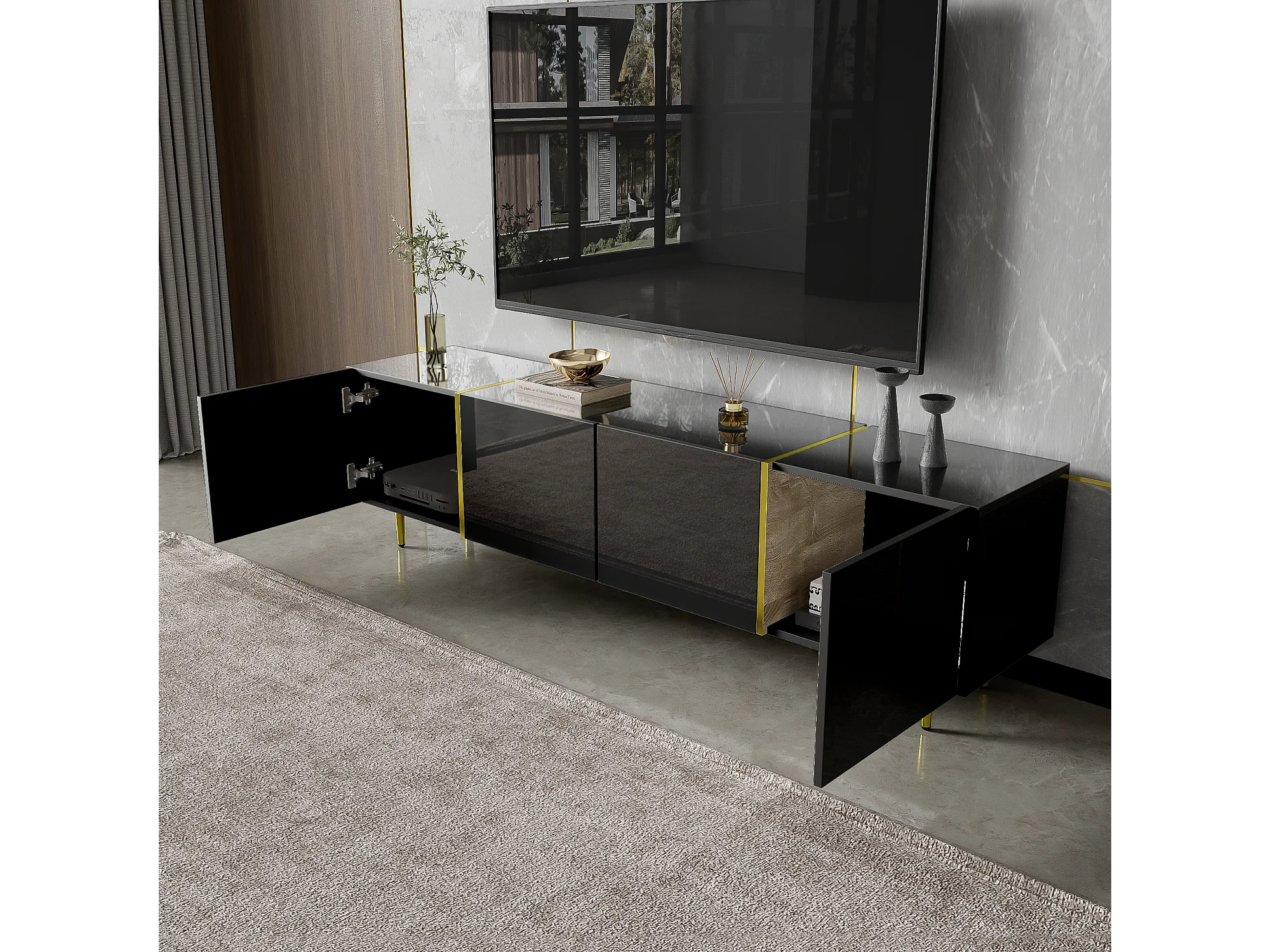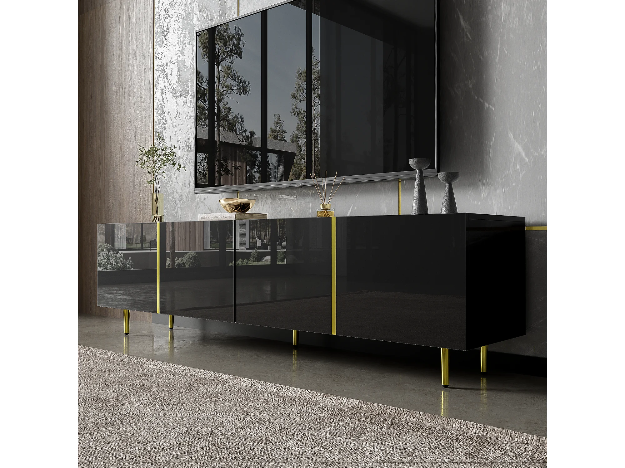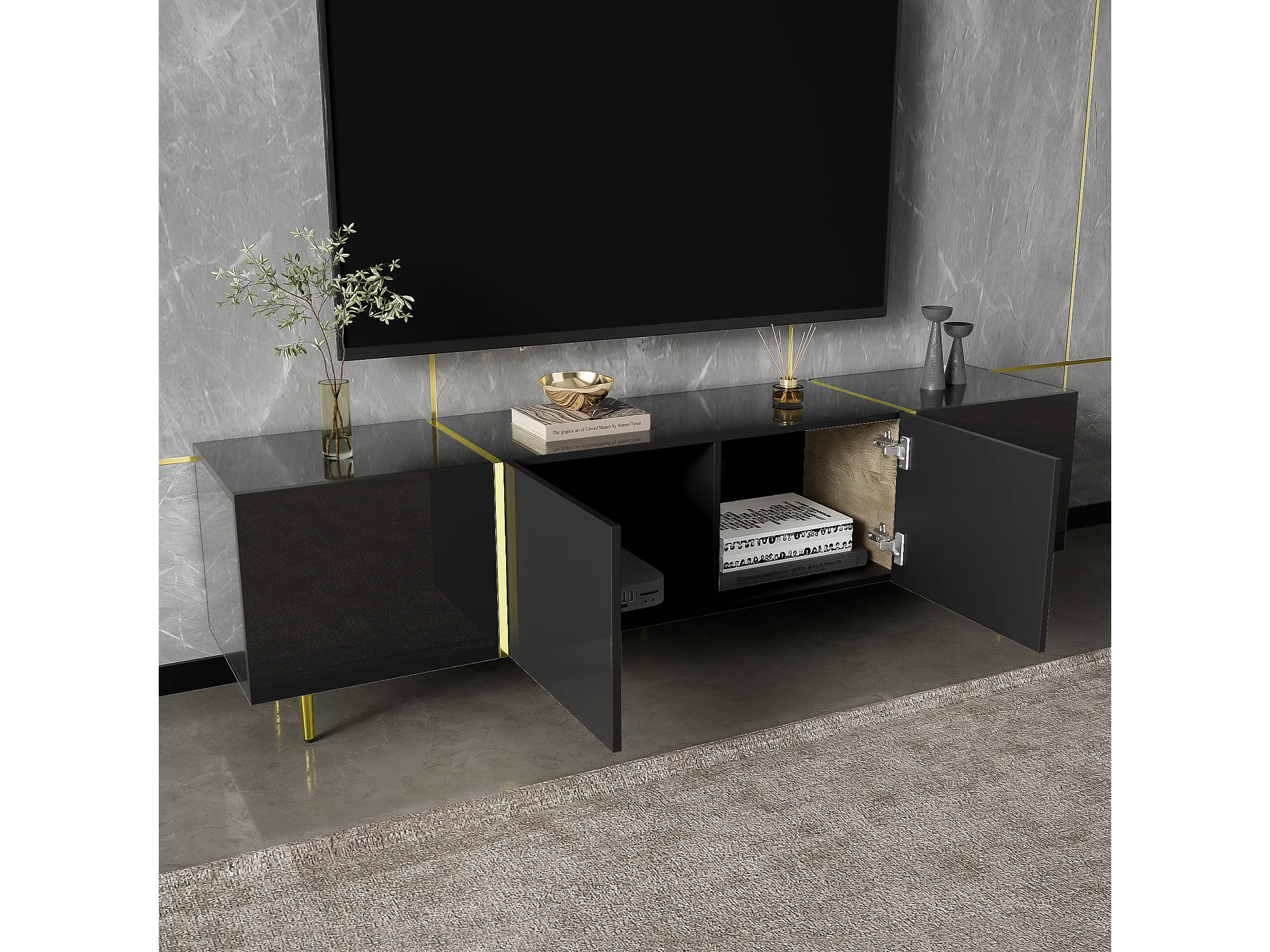 Laag tv-meubel met 4 deuren, tv-kast met opbergruimte, hoogglans afwerking, gouden poten, zwart