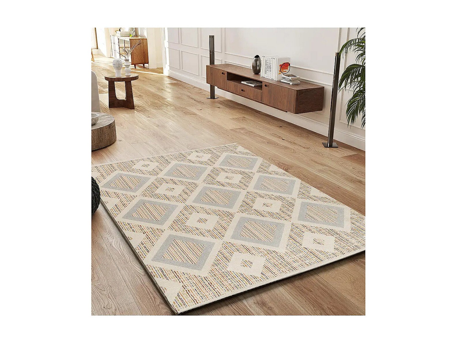 Het geometrische Siroco-vloerkleed combineert vierkanten en ruiten in zachte kleuren die licht en rust in je huis brengen. Dit vloerkleed voor de woonkamer of slaapkamer past perfect bij elk interieur.