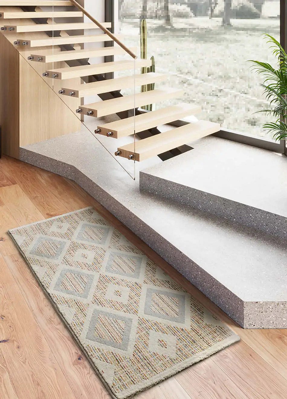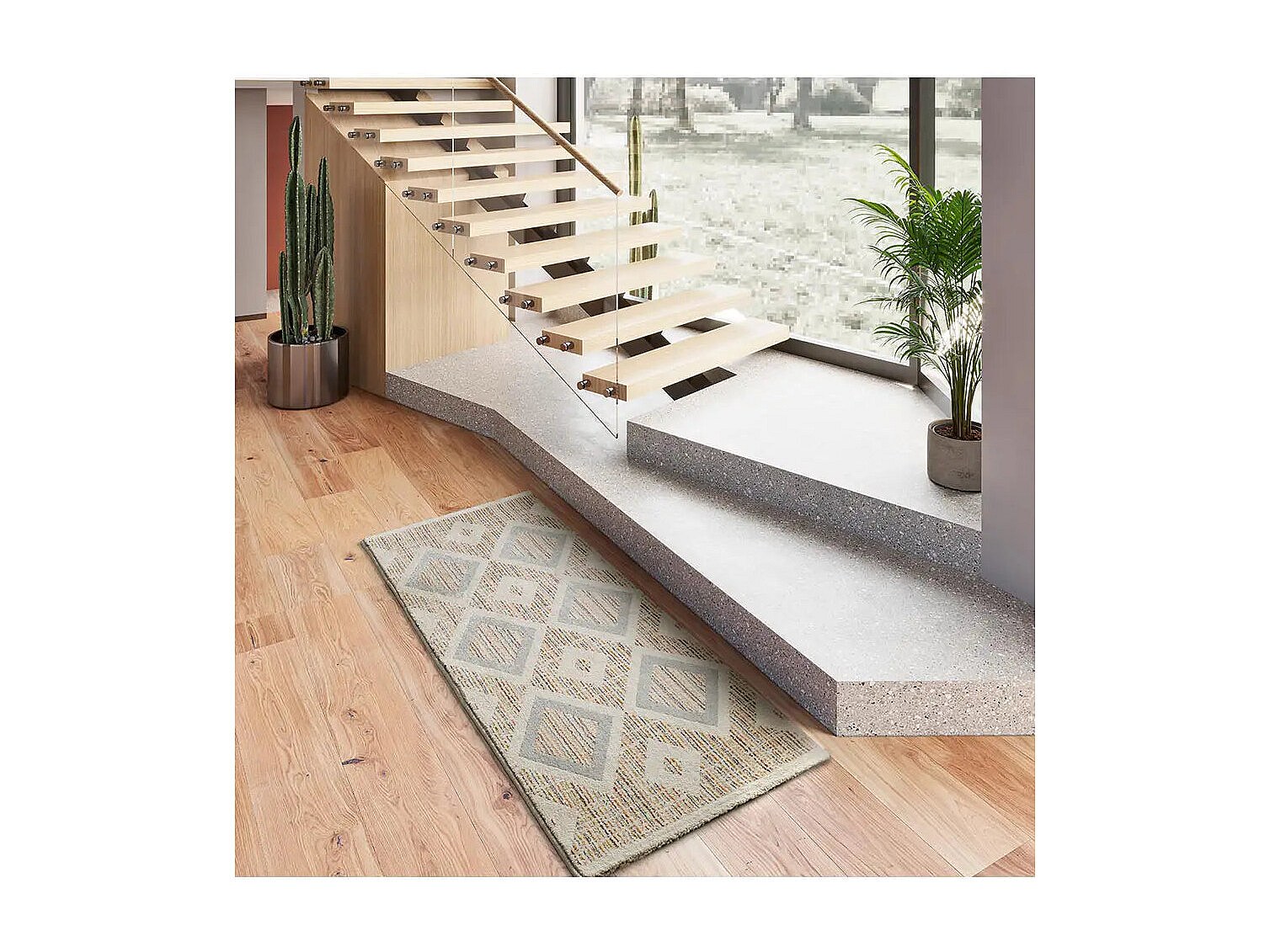 Het geometrische Siroco-vloerkleed combineert vierkanten en ruiten in zachte kleuren die licht en rust in je huis brengen. Dit vloerkleed voor de woonkamer of slaapkamer past perfect bij elk interieur.