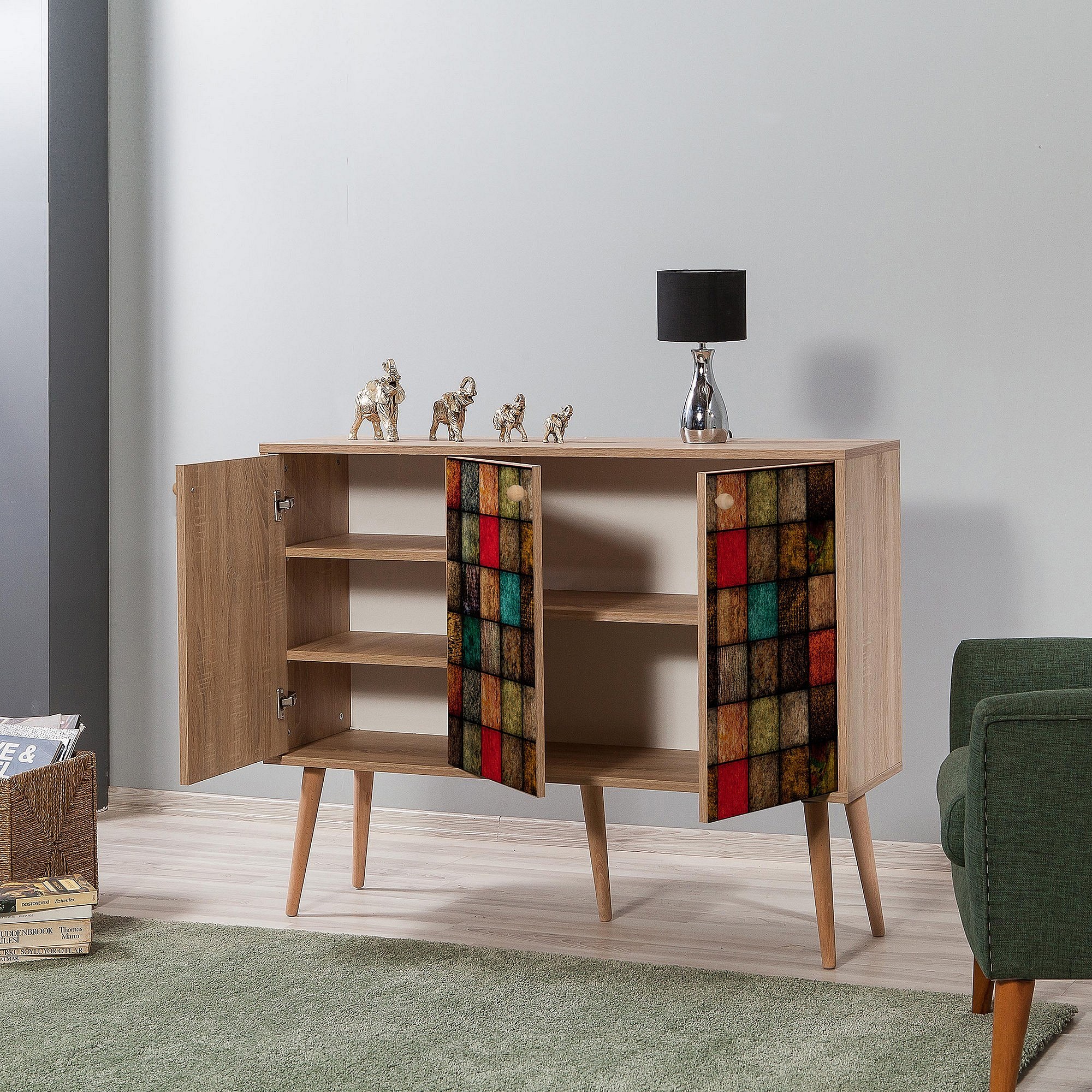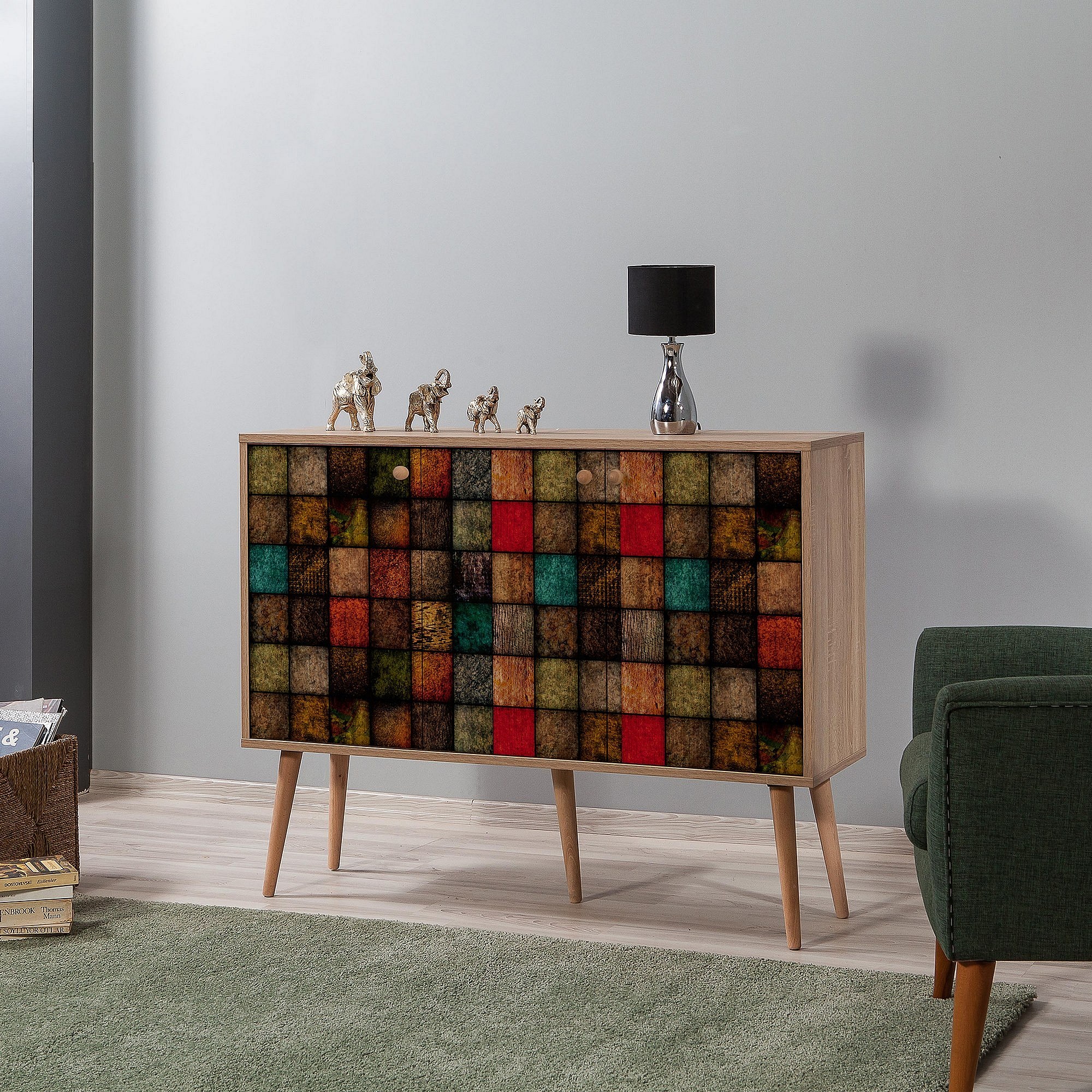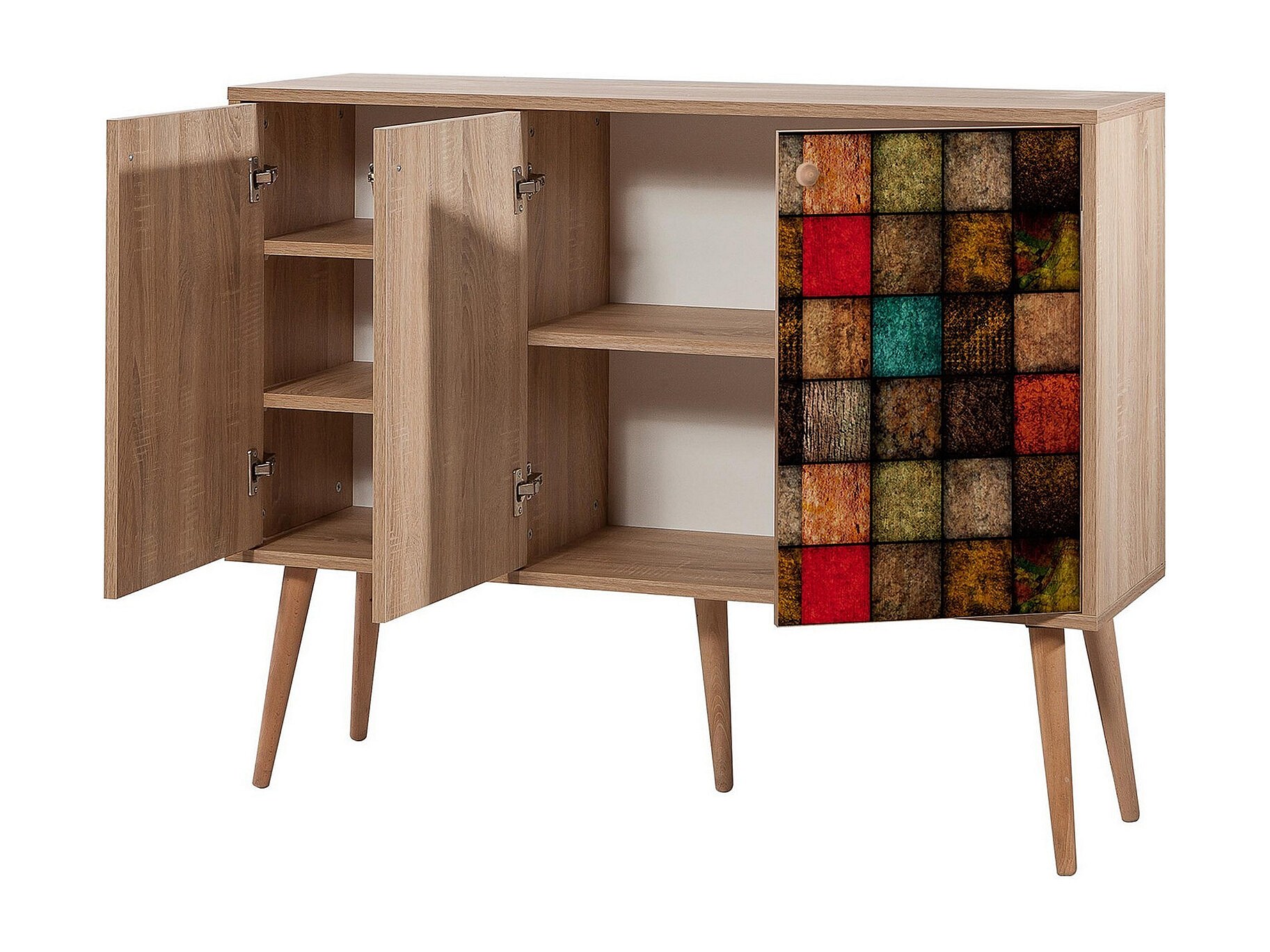 Ladekast met 3 deuren in licht hout en veelkleurig dambord Kiza 723