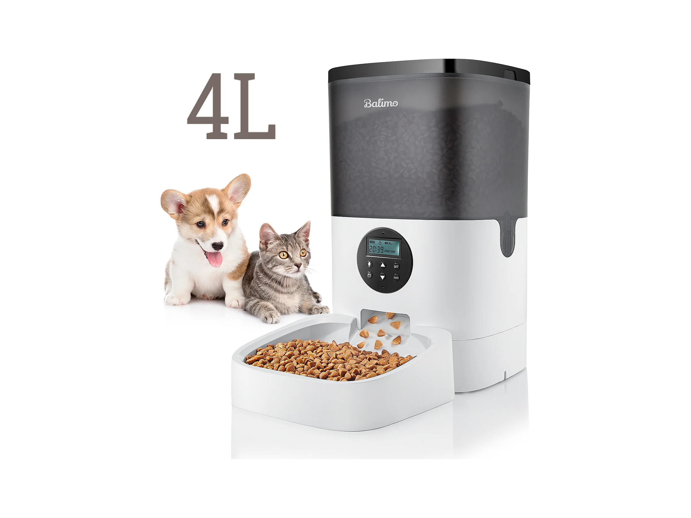 Balimo 4L Katten-/Hondenvoerdispenser, met voedings- / batterijadapter, LCD-scherm, 10S-spraakopname en timer, zwart wit