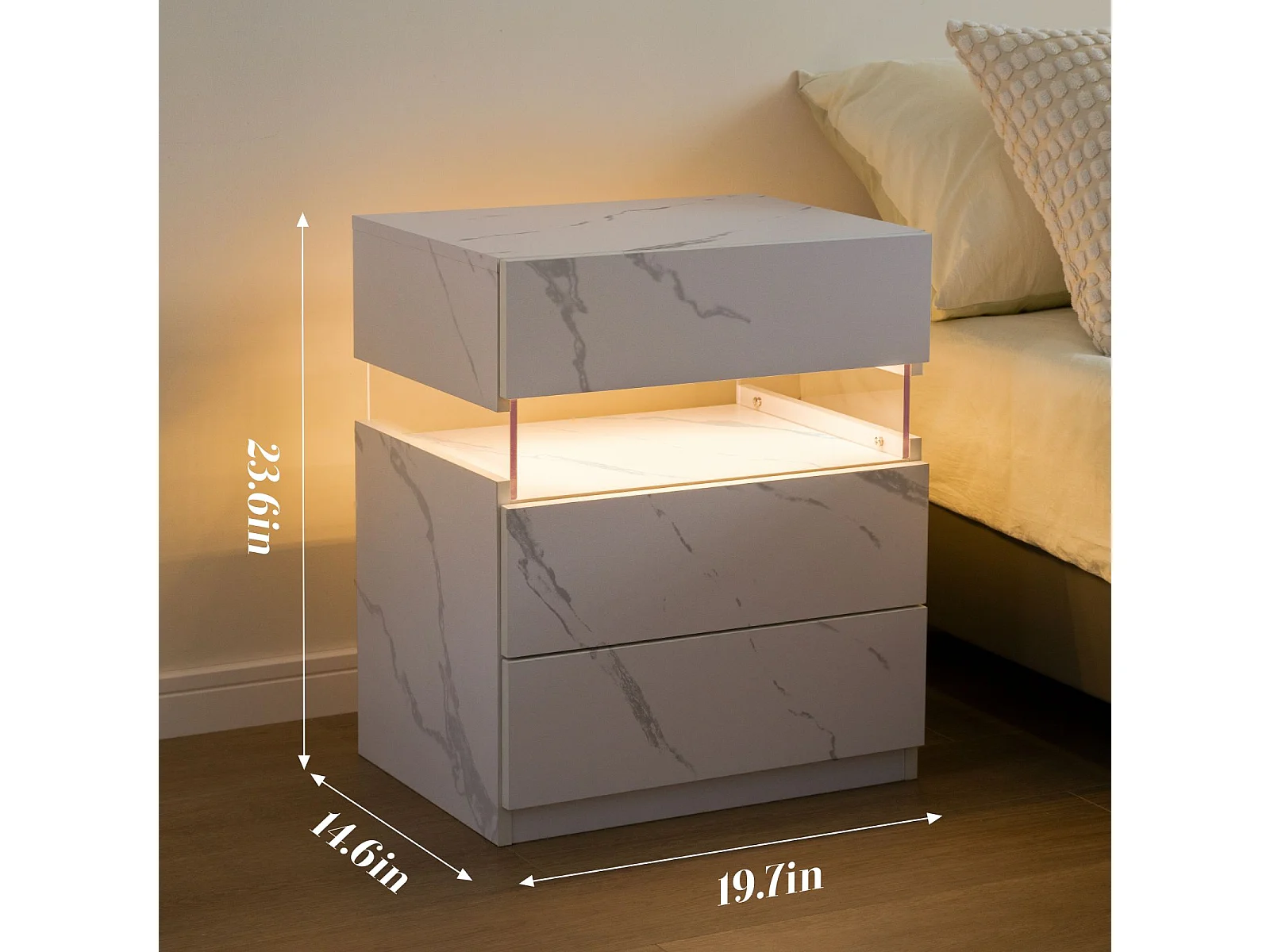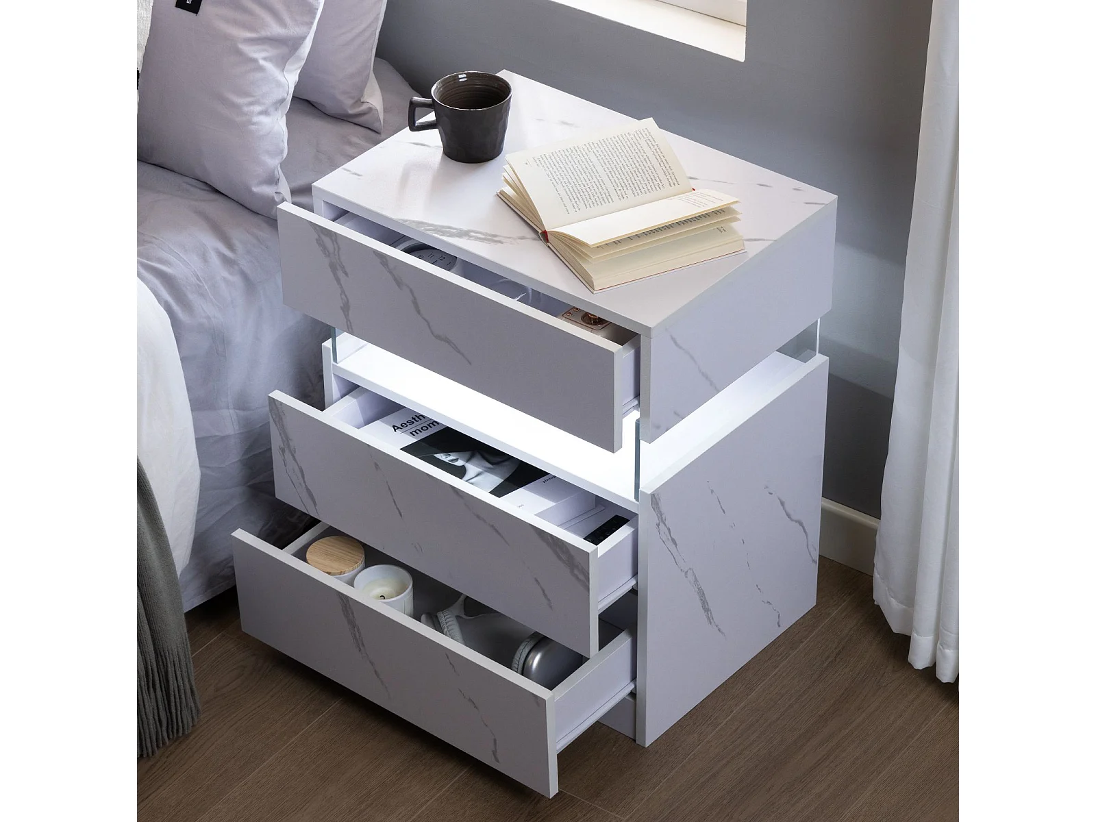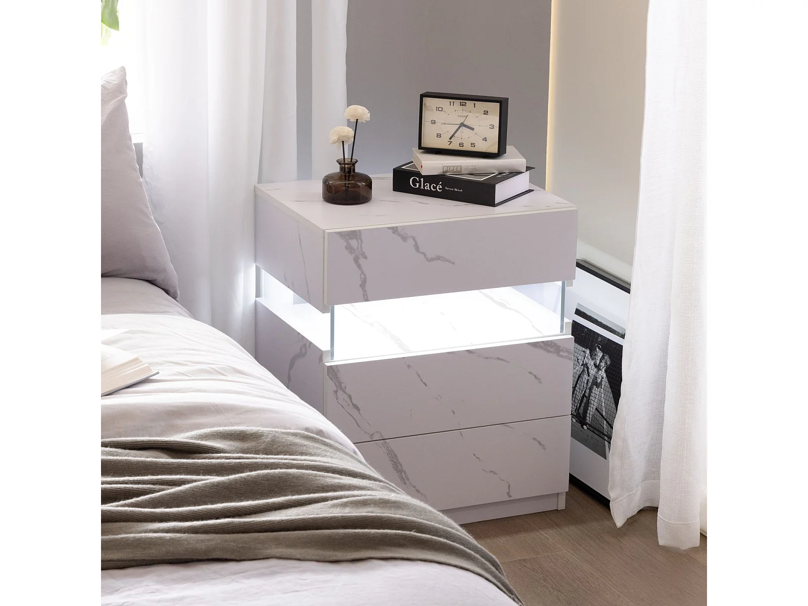 LED-nachtkastje met 3 lades, acryl LED-nachtkastje voor slaapkamer, MDF, wit (48x38x61cm)