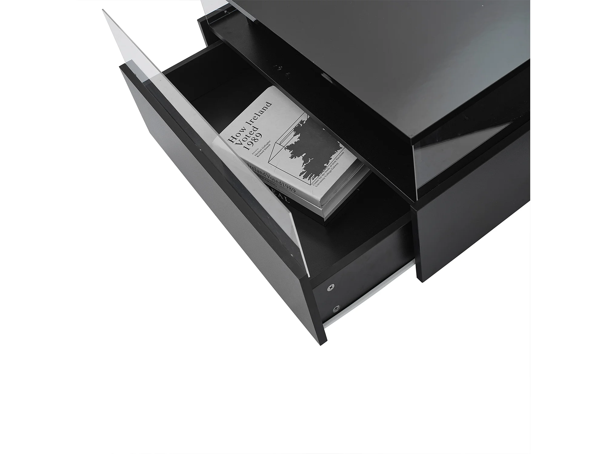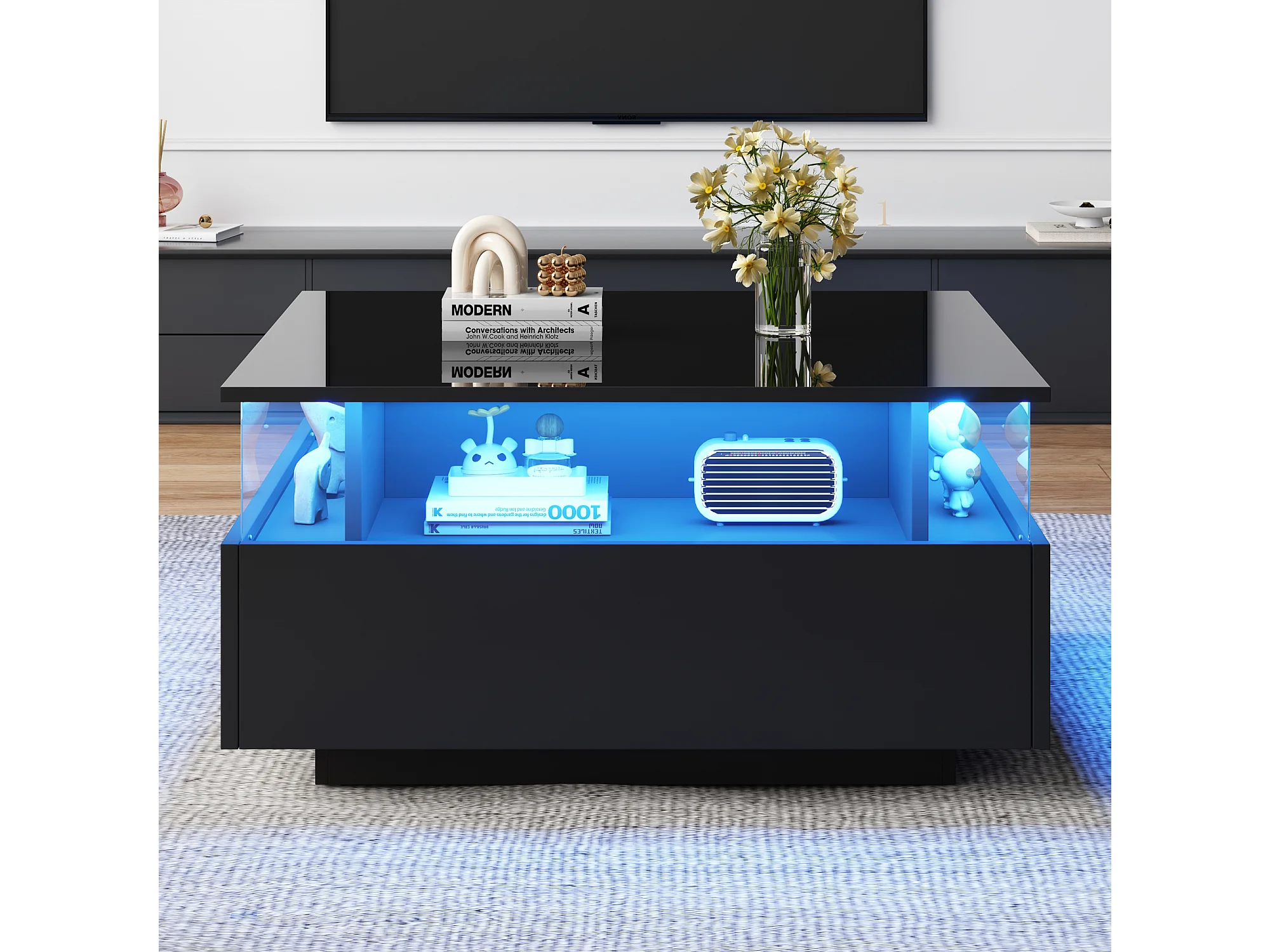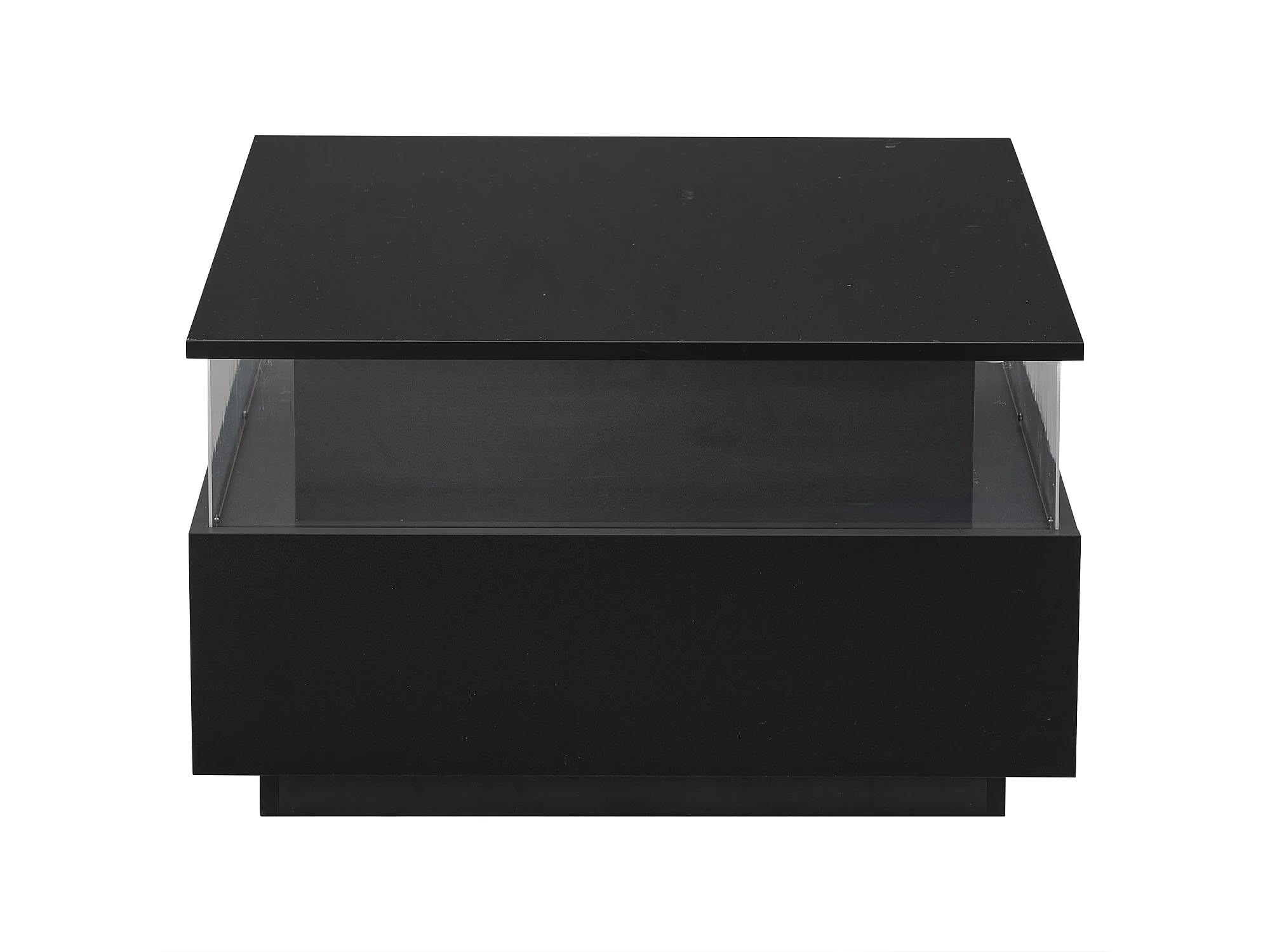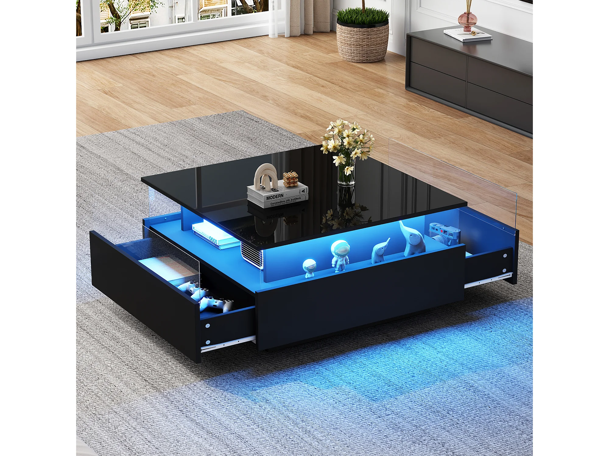 Salontafel 70x70x41 cm, verstelbare LED-verlichting, 2 laden, transparant presentatiegebied, zwarte spaanplaat